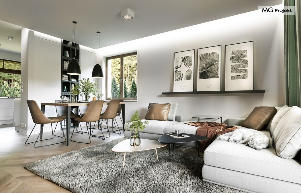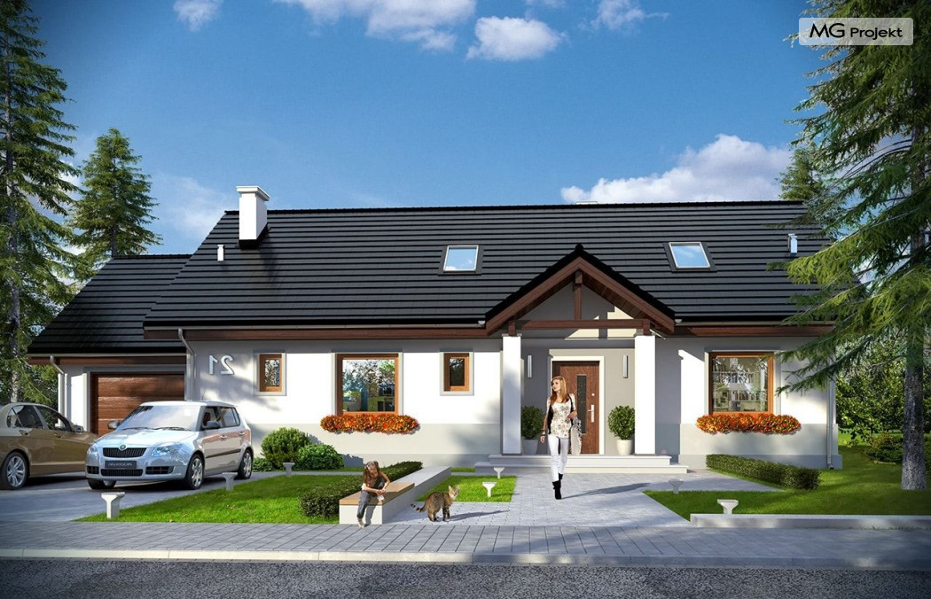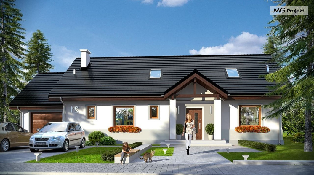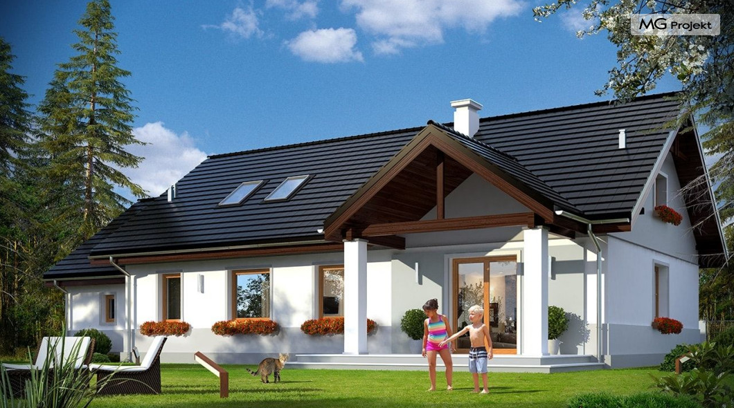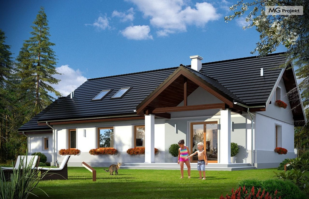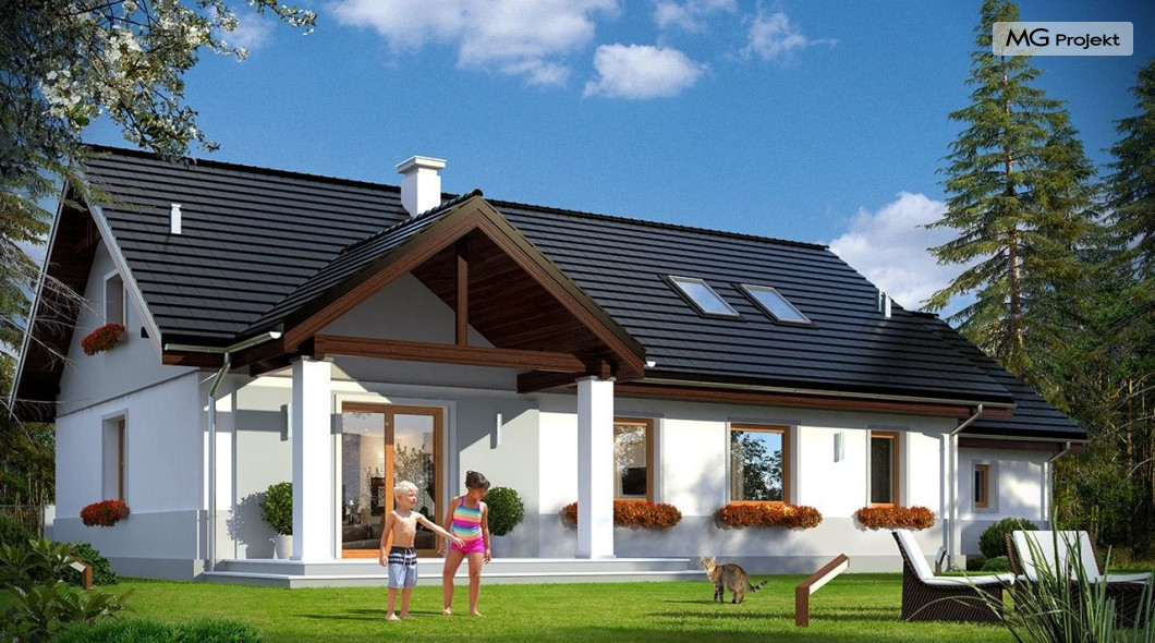 Projekt domu Anatol 2 to kolejna odsłona popularnego projektu domu jednorodzinnego Anatol. Jest to parterowy domek, przeznaczony do zamieszkania dla 4-6cioosobowej rodziny. Dzięki dużemu strychowi, który można zaadaptować na poddasze użytkowe, dom doskonale sprawdzi się dla rozwojowej, rosnącej rodziny, której potrzeby mogą się zwiększać. Dzięki strychowi do adaptacji w łatwy sposób można uzyskać dodatkową powierzchnię mieszkalną. Architektonicznie dom jest prostą ponadczasową bryłą, zbudowaną na planie prostokąta, przekrytą dwuspadowymi dachami. Dobrze dobrane proporcje elewacji, oraz nowoczesne materiały wykończeniowe, dają domowi atrakcyjny i przyjemny dla oka wygląd. Funkcjonalne wnętrze, mieszczące wszystkie pomieszczenia mieszkalne i techniczne na parterze, dopełnia atrakcyjności domu. Na parterze zmieszczono część dzienną z salonem, kuchnią i holem, oraz sypialnie domowników - trzy sypialnie i dodatkowy pokój do pracy. Prócz tego w domu zmieściły się łazienki, garderoba, spiżarnia i kotłownia, oraz garaż. Na strych dostajemy się schodkami z kotłowni. Strych można dowolnie zagospodarować - urządzić tam dodatkowe 2-3 pokoje, lub jednoprzestrzenną powierzchnię. Dom ma prostą konstrukcję, jest łatwy w budowie. Dzięki temu koszty realizacji nie powinny być wygórowane. Dzięki zwartej bryle i dobrym izolacjom dom jest ciepły i energooszczędny. Koszty utrzymania Anatola 2 nie będą wysokie. Zapraszamy do zapoznania się z pełną ofertą pracowni MG Projekt: projekt domu Anatol.