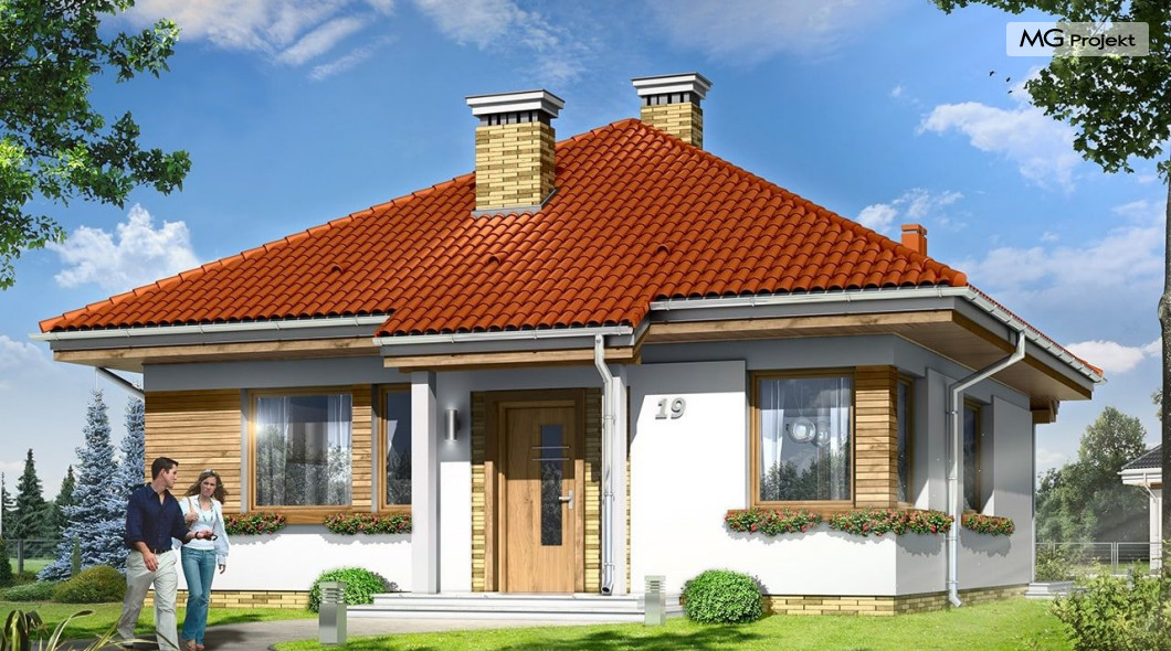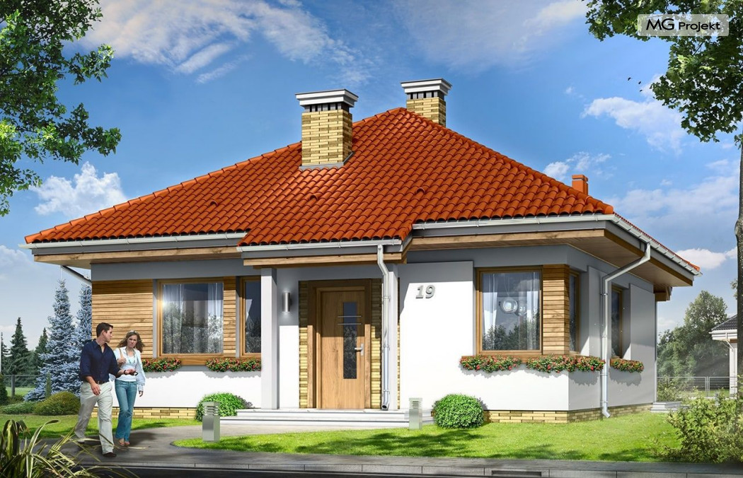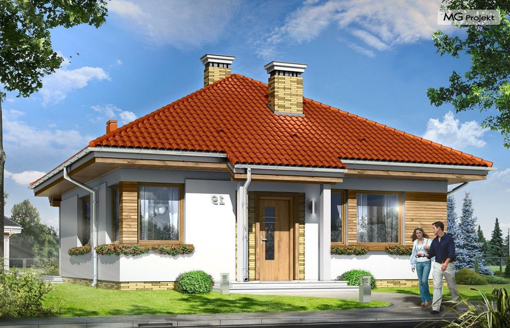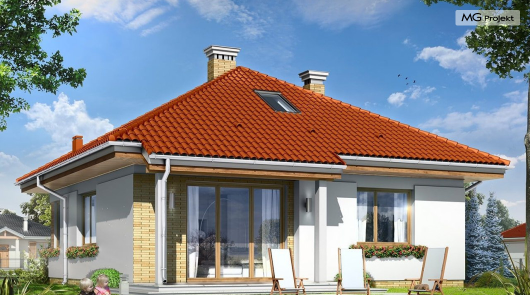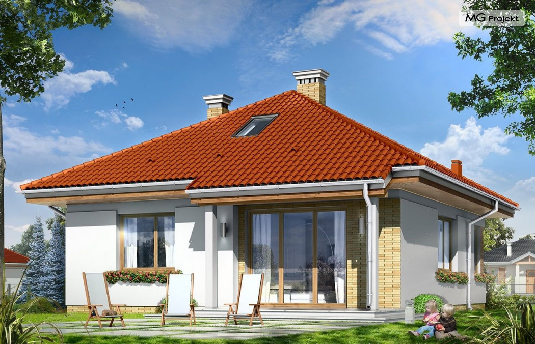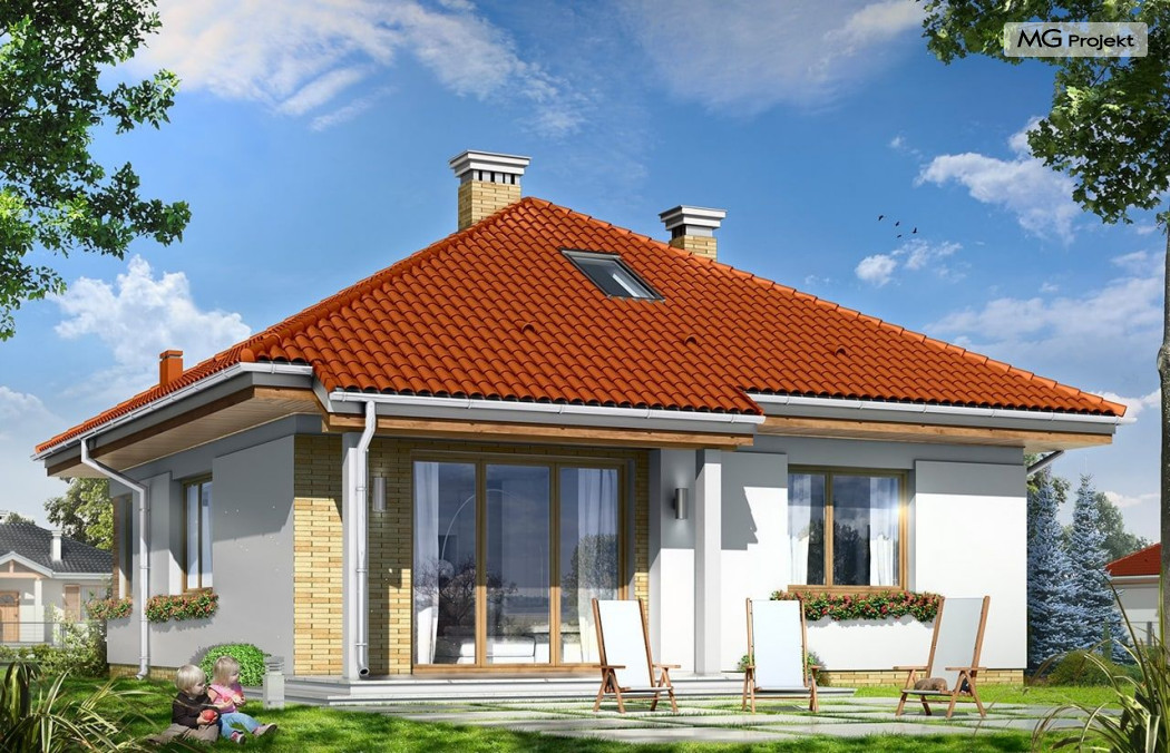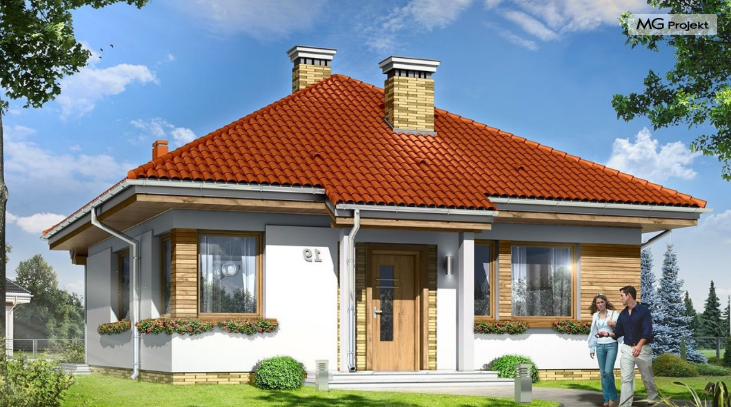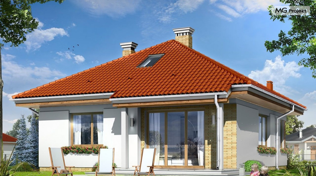 Projekt domu Bambi to nieduży, parterowy domek jednorodzinny, przewidziany dla 3-4 osobowej rodziny. Budynek przekryty został czterospadowym, kopertowym dachem. Bardzo prosta bryła domu, oparta na planie kwadratu, oraz kopertowym dachu, połączona z dobrze dobranymi proporcjami i ciekawymi detalami architektonicznymi, tworzą spójną, atrakcyjną całość. Domek Bambi jest łatwy w budowie, a dzięki zwartej bryle - niedrogi w ogrzewaniu. W projekcie domu Bambi przestrzeń parteru podzielono na otwartą część dzienną, z kuchnią, salonem i holem, oraz część nocną - z dwiema sypialniami i łazienką. Z salonu szerokimi drzwiami balkonowymi wychodzimy na taras i ogród. Taras budynku jest częściowo zadaszony. W centralnym miejscu domu umiejscowiono kominek, którym alternatywnie można ogrzać całe wnętrze. Z holu wyciąganymi schodkami możemy dostać się na spory strych nad parterem, który wariantowo można zaadaptować na pokoik na poddaszu. Domek może pełnić funkcję budynku jednorodzinnego, ale również domu letniskowego.Pracownia posiada wersję odbicia lustrzanego projektu domu Bambi.