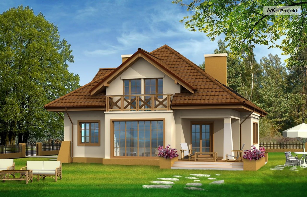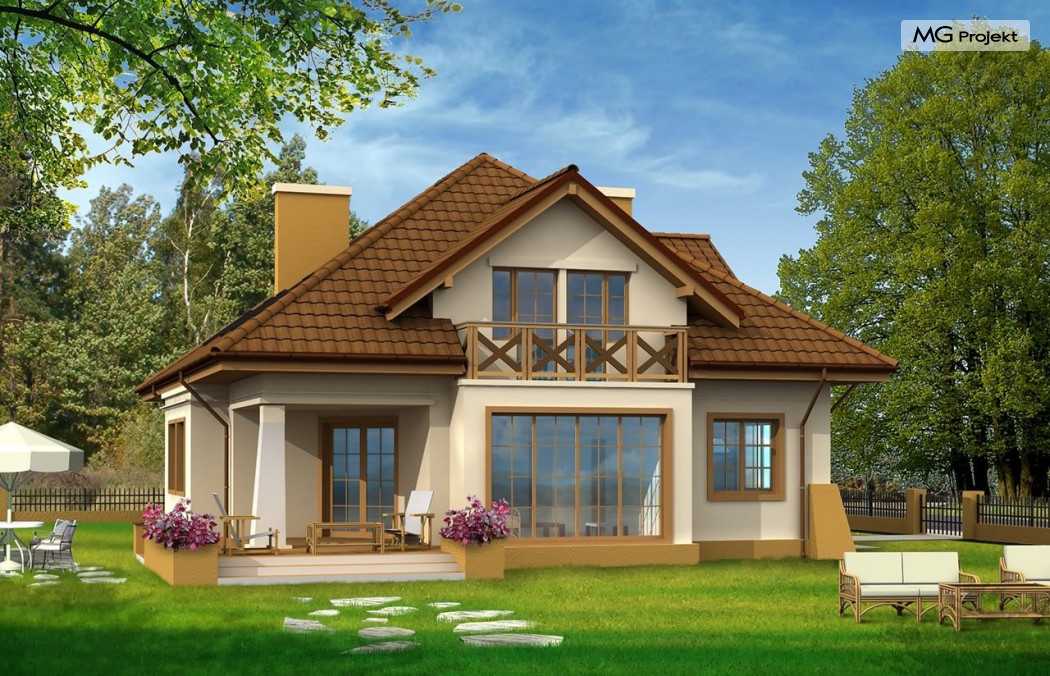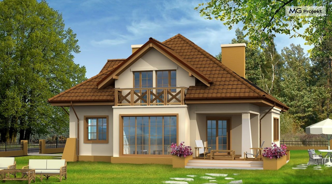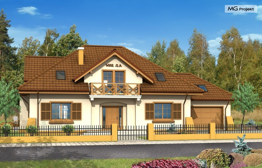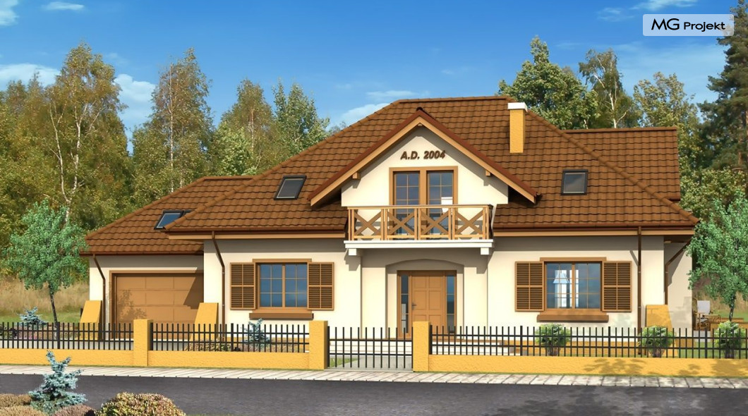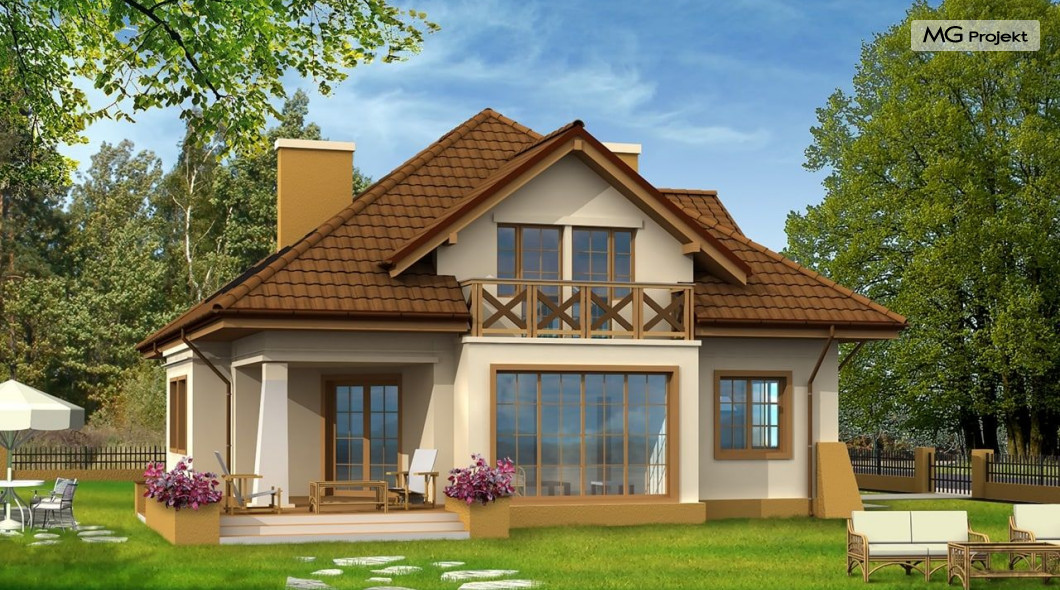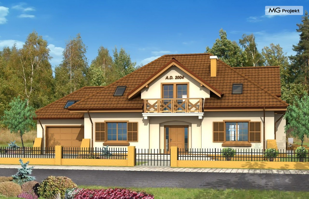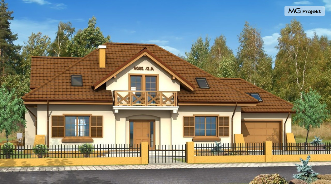 Projekt domu Benedykt to duży, reprezentacyjny dom jednorodzinny nawiązujący do architektury dworkowej - jednak w bardziej nowoczesnym ujęciu. Szerokie, centralnie umieszczone wejście domu akcentuje osiowy podział elewacji frontowej. Bryła została przykryta dużym, wielospadowym dachem, poprzecinanym ciekawymi lukarnami z balkonami. We wnętrzu domu Benedykt zaplanowano obszerny hol z salonem, wydzieloną jadalnią i dużą zamykaną kuchnię. Na parterze zaprojektowano gabinet i pomieszczenia techniczne oraz dwustanowiskowy garaż. Na poddaszu - sypialnię rodziców z własną garderobą i łazienką oraz trzy sypialnie dzieci i łazienkę. W projekcie domu Benedykt strych nad garażem może zostać zaadoptowany na dodatkowe pomieszczenie gospodarcze. Zapraszamy do zapoznania się z pełną ofertą pracowni MG Projekt: projekt domu Benedykt, projekt domu Benedykt 2, projekt domu Benedykt 3, projekt domu Benedykt 4, projekt domu Benedykt 5, projekt domu Benedykt Bliźniak.