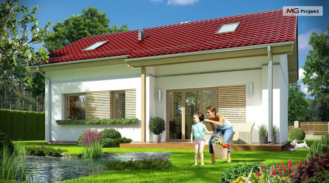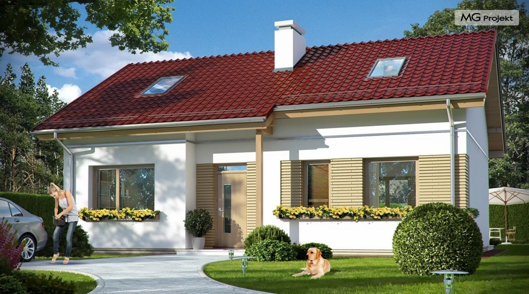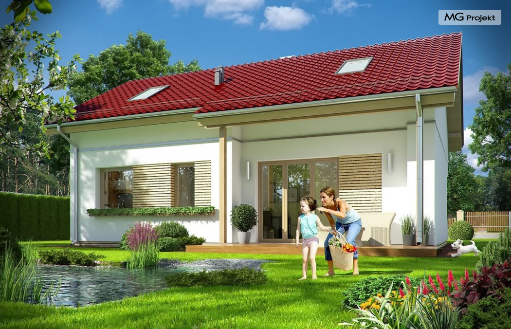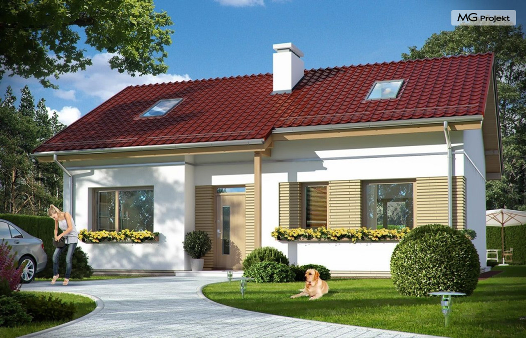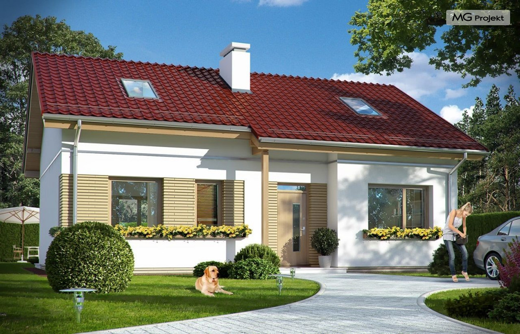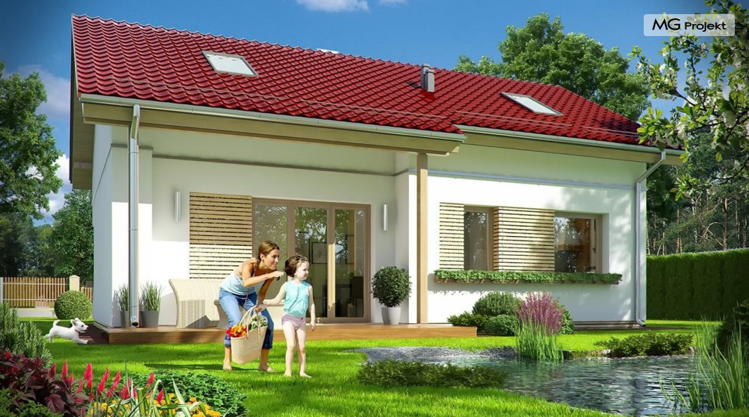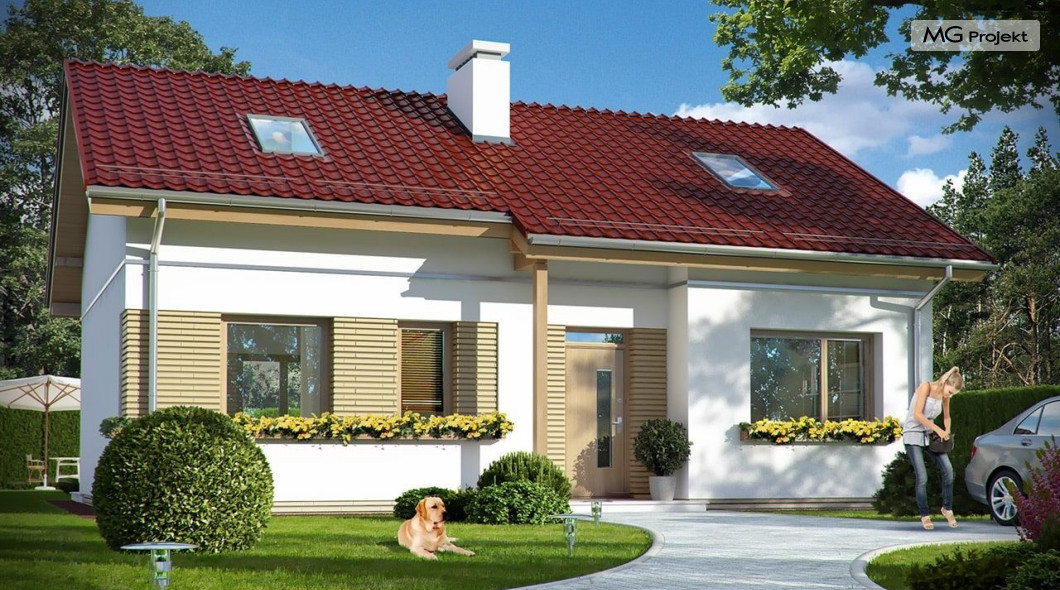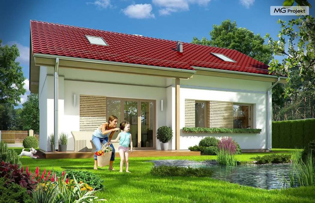 Projekt domu Biedronka 2 jest to wariantowa wersja naszego popularnego niewielkiego domu jednorodzinnego dla trzy-czteroosobowej rodziny, parterowego, przekrytego dwuspadowym łagodnym dachem, ze strychem do adaptacji. Domek ma prostą bryłę i konstrukcję. Jest łatwy w budowie i tani w przyszłej eksploatacji. Dzięki zastosowaniu bardzo dobrego ocieplenia i nowoczesnych instalacji, Biedronka jest budynkiem energooszczędnym. Wygląd zewnętrzny to połączenie nowoczesności z tradycyjną formą. Nowoczesne materiały wykończeniowe i detale architektoniczne łączą się tu z tradycyjną formą parterowego domu na planie prostokąta, z dwuspadowym dachem. Elewacje frontowa i ogrodowa zostały urozmaicone zadaszonymi podcieniami, oraz drewnianymi okładzinami ścian. Oryginalny dach kryty blachą na rąbek można łatwo zastąpić dachówką lub blacho dachówką. Parter domu składa się z części dziennej z salonem, kuchnią i holem, oraz dwóch sypialni z łazienką. Przy przedsionku znajduje się kotłownia gazowa, którą łatwo można zmienić na kotłownię z piecem na paliwo stałe. Strych – poddasze można dowolnie zagospodarować. Mimo niewielkiej powierzchni dom ma przestronne i wygodne wnętrze. Biedronka 2 jest budynkiem całorocznym, może być też wykorzystywana jako dom wakacyjny. Prosta i łatwa konstrukcja pozwoli zaoszczędzić na kosztach budowy. Biedronka to z pewnością propozycja dla rozsądnie myślącego Klienta. Zapraszamy do zapoznania się z pełną ofertą pracowni MG Projekt: projekt domu Biedronka.