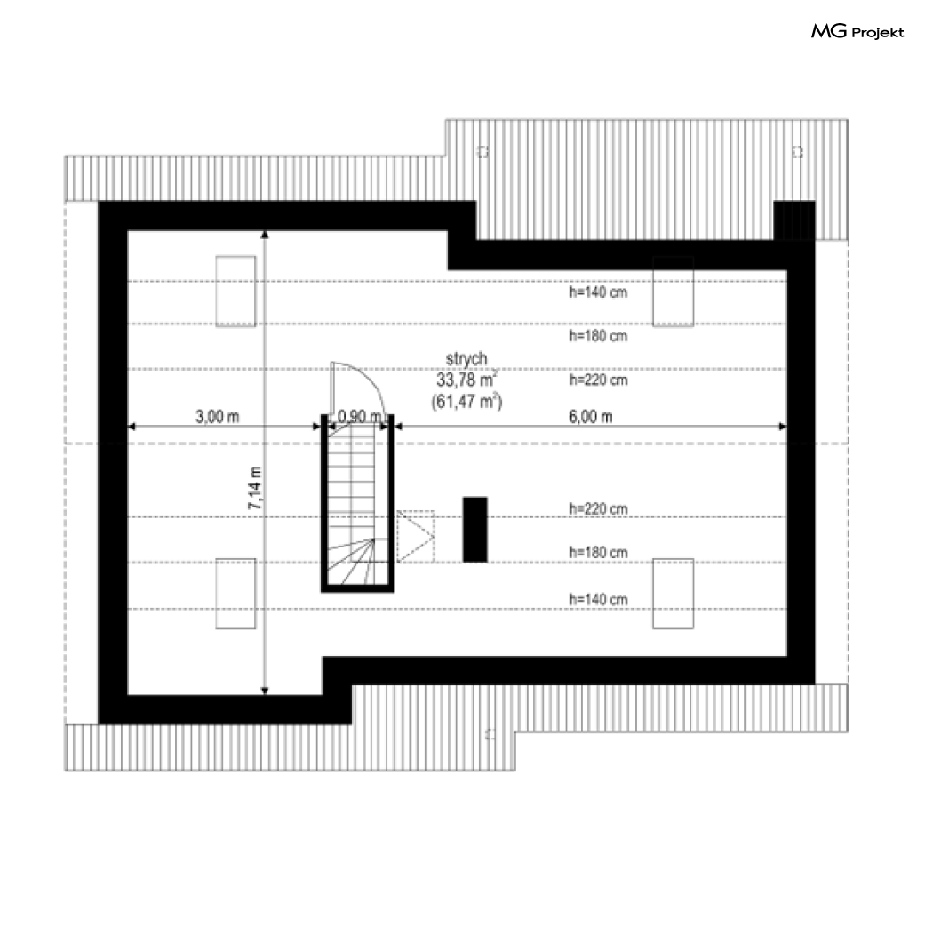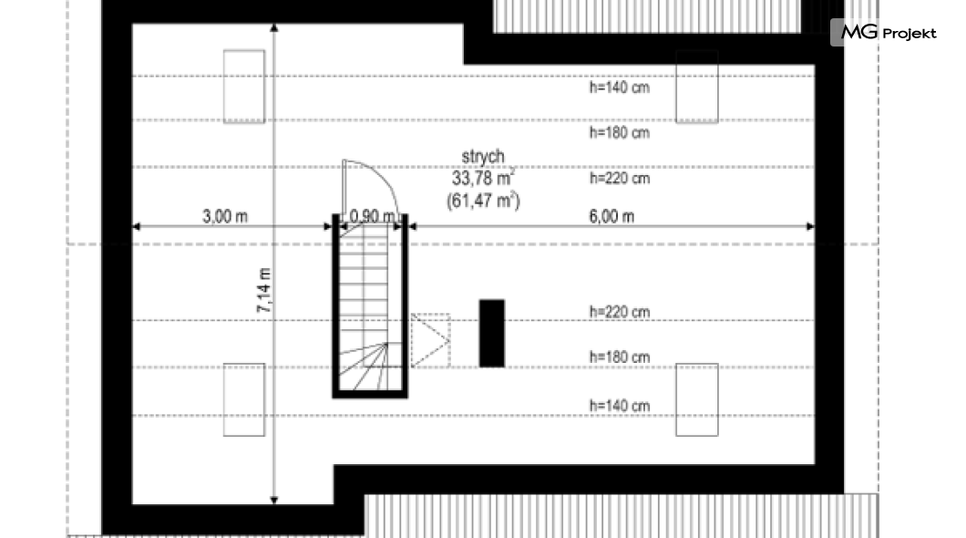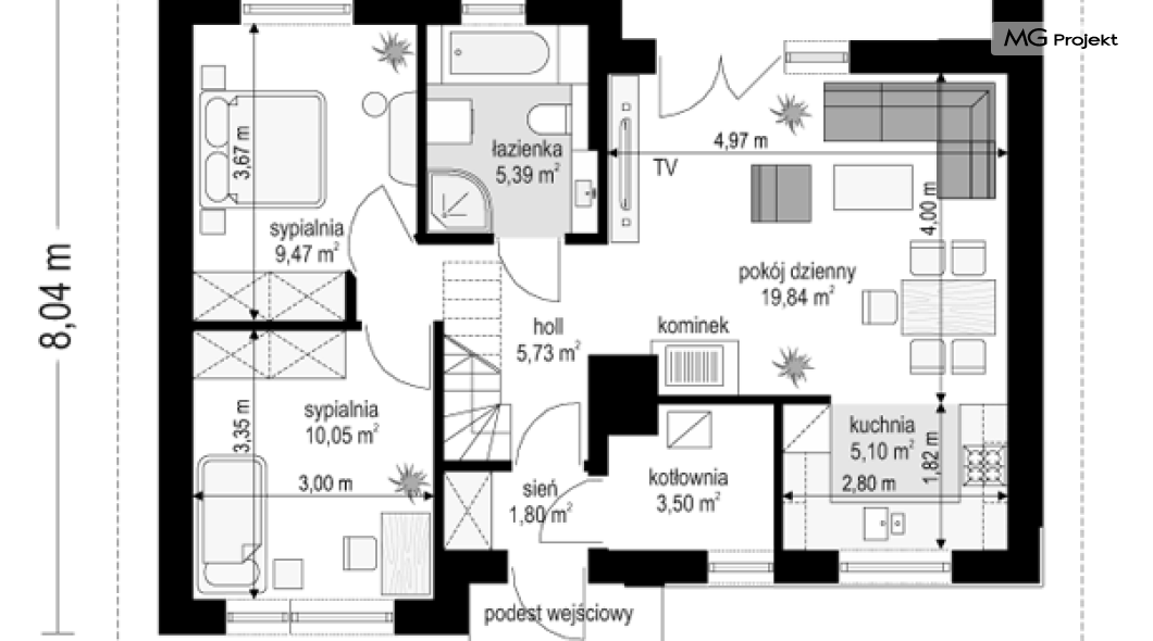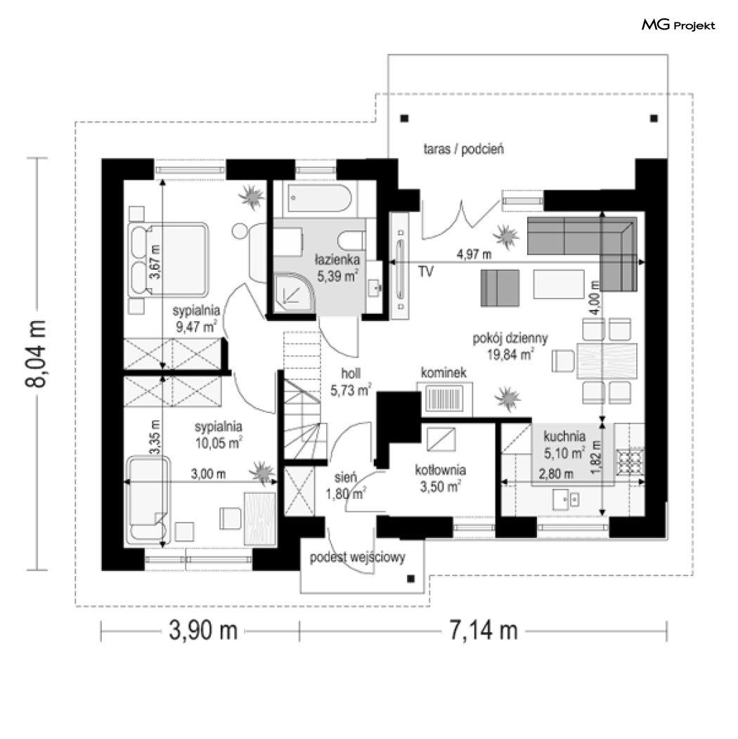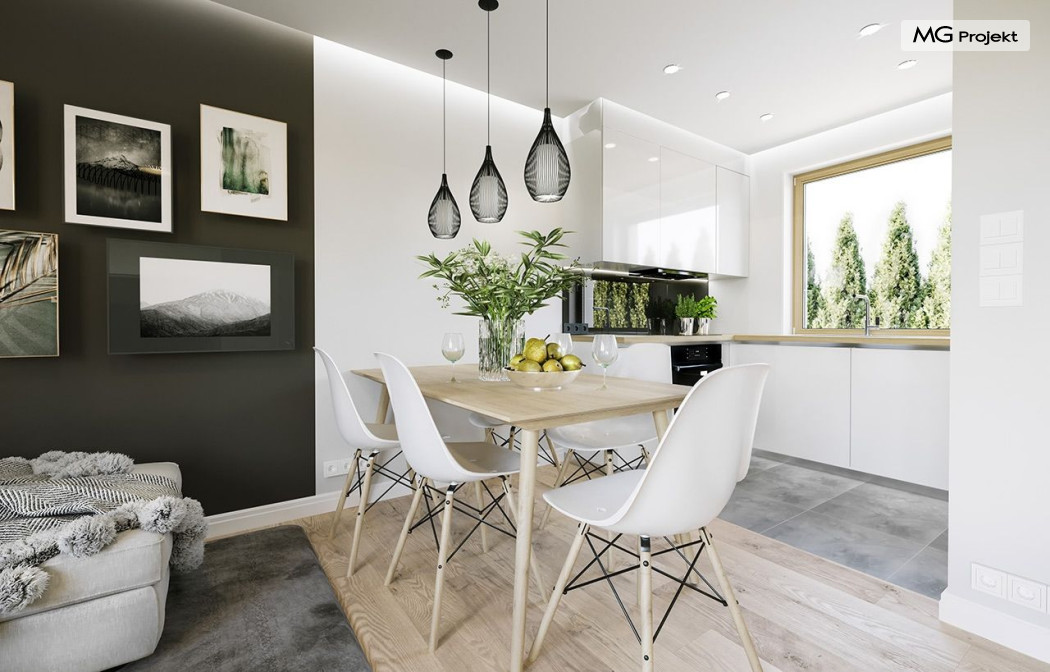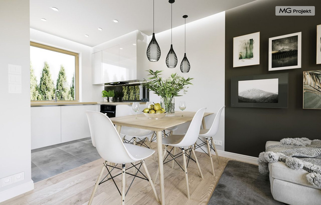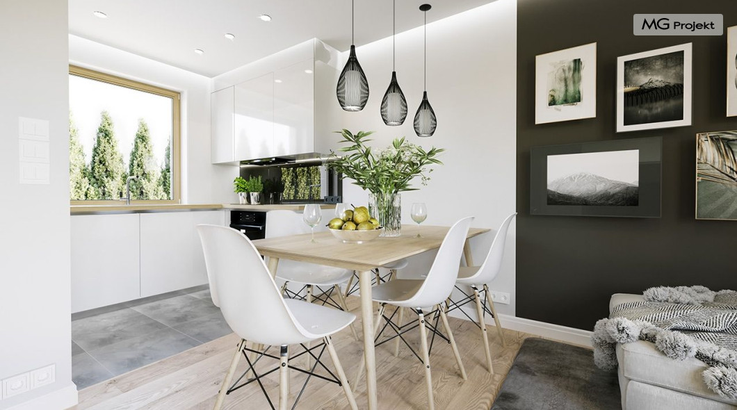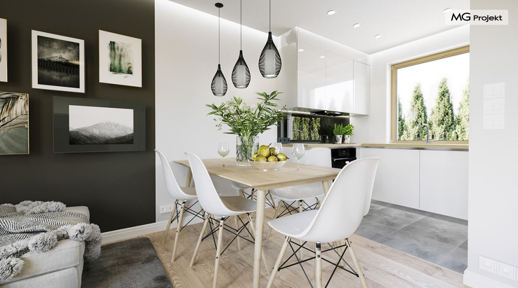 Projekt domu Biedronka 2 jest to wariantowa wersja naszego popularnego niewielkiego domu jednorodzinnego dla trzy-czteroosobowej rodziny, parterowego, przekrytego dwuspadowym łagodnym dachem, ze strychem do adaptacji. Domek ma prostą bryłę i konstrukcję. Jest łatwy w budowie i tani w przyszłej eksploatacji. Dzięki zastosowaniu bardzo dobrego ocieplenia i nowoczesnych instalacji, Biedronka jest budynkiem energooszczędnym. Wygląd zewnętrzny to połączenie nowoczesności z tradycyjną formą. Nowoczesne materiały wykończeniowe i detale architektoniczne łączą się tu z tradycyjną formą parterowego domu na planie prostokąta, z dwuspadowym dachem. Elewacje frontowa i ogrodowa zostały urozmaicone zadaszonymi podcieniami, oraz drewnianymi okładzinami ścian. Oryginalny dach kryty blachą na rąbek można łatwo zastąpić dachówką lub blacho dachówką. Parter domu składa się z części dziennej z salonem, kuchnią i holem, oraz dwóch sypialni z łazienką. Przy przedsionku znajduje się kotłownia gazowa, którą łatwo można zmienić na kotłownię z piecem na paliwo stałe. Strych – poddasze można dowolnie zagospodarować. Mimo niewielkiej powierzchni dom ma przestronne i wygodne wnętrze. Biedronka 2 jest budynkiem całorocznym, może być też wykorzystywana jako dom wakacyjny. Prosta i łatwa konstrukcja pozwoli zaoszczędzić na kosztach budowy. Biedronka to z pewnością propozycja dla rozsądnie myślącego Klienta. Zapraszamy do zapoznania się z pełną ofertą pracowni MG Projekt: projekt domu Biedronka.