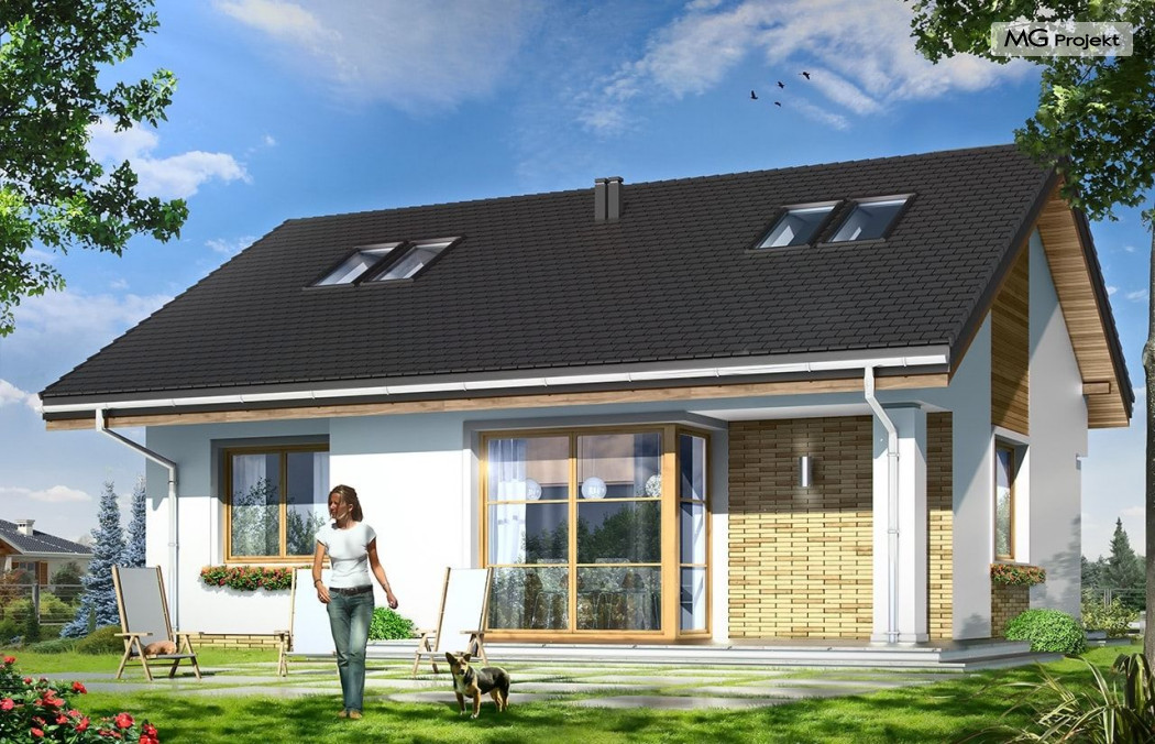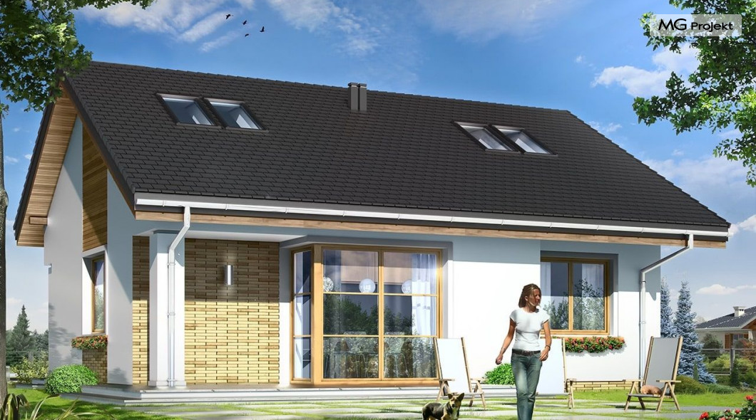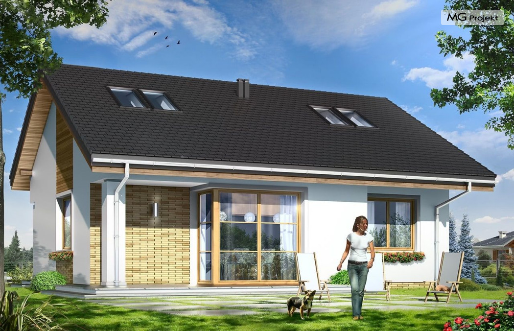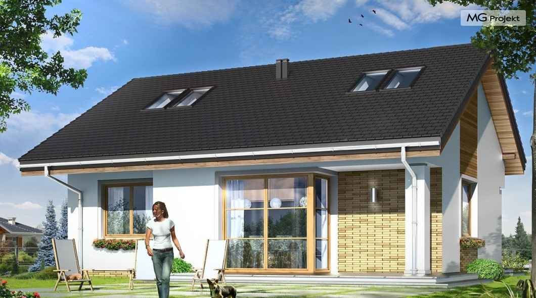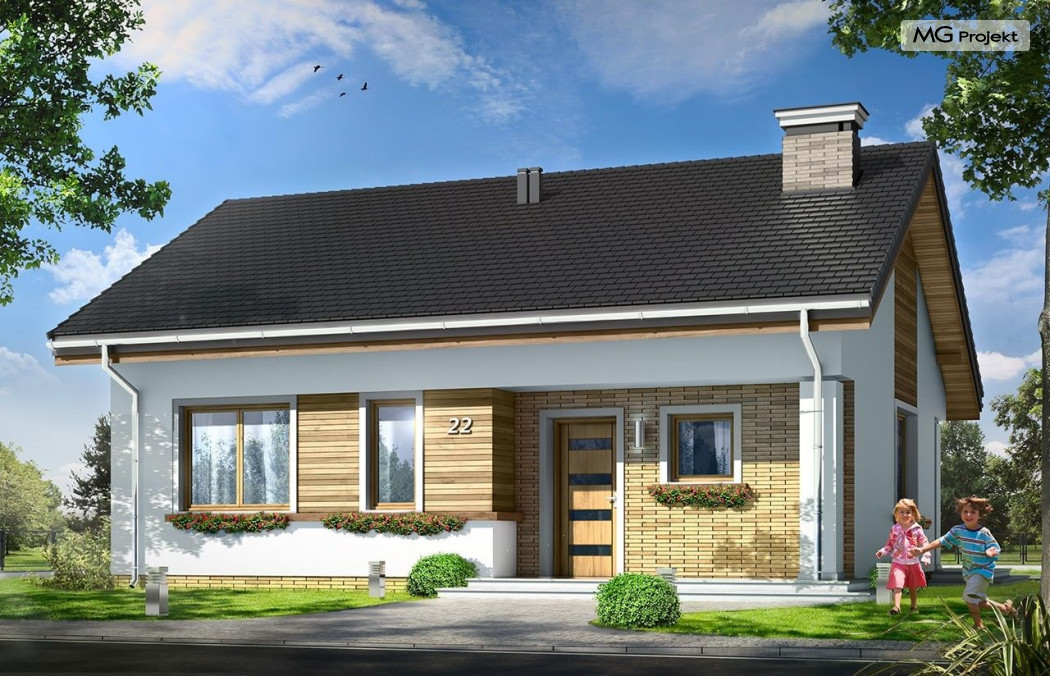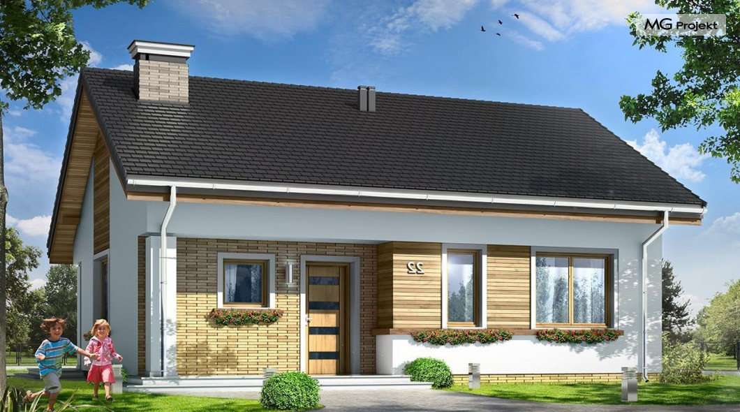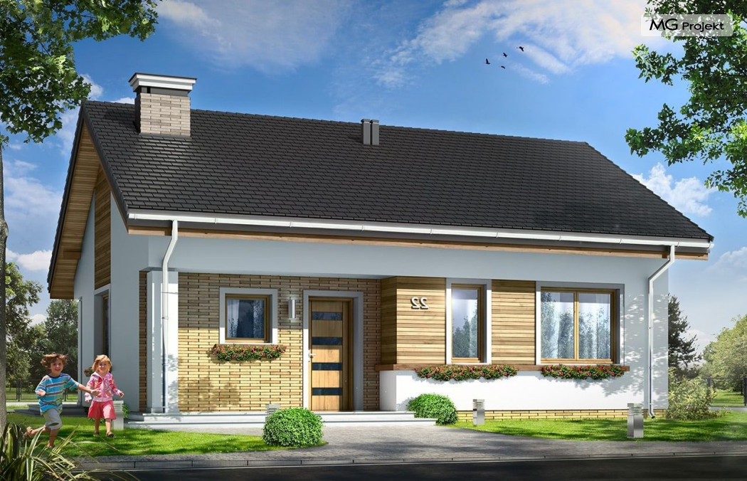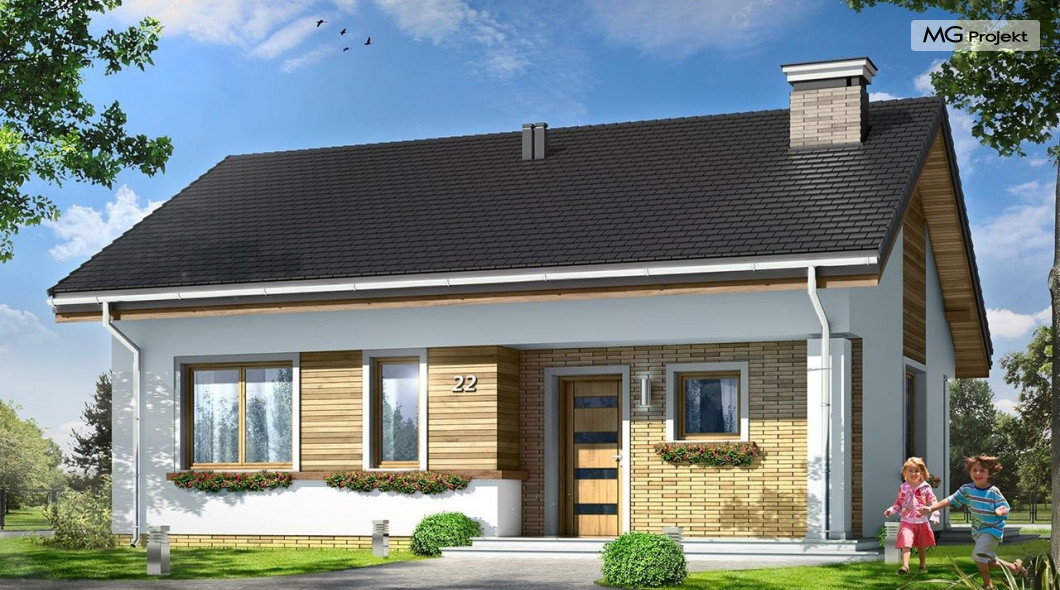 Projekt domu Bonifacy to niewielki, parterowy domek jednorodzinny, dla 3-4 osobowej rodziny. Dom przekryty został dwuspadowym dachem. Nad parterem zaprojektowano nieużytkowy strych, który z łatwością można zaadaptować na poddasze z dodatkowymi pokojami. Projekt domu Bonifacy, dzięki prostej bryle jest łatwy i niedrogi w budowie. Będzie też tani w późniejszej eksploatacji. Ładnie zaakcentowany podest wejściowy, fragmenty ścian z okładziną drewnianą oraz płytkami klinkierowymi, podcień i taras ogrodowy z ślicznym narożnym oknem z salonu - wszystkie te elementy powodują, że na domek patrzy się z przyjemnością. We wnętrzu zaprojektowane zostały trzy pokoje - dwie sypialnie i pokój dzienny, połączony z holem i kuchnią z kącikiem jadalnym. Dodatkowe pomieszczenia to kotłownia dostępna z przedsionka i łazienka. Strych, na który wchodzimy schodami z holu można zaadaptować na poddasze użytkowe, lub można go w ogóle zamknąć - likwidując też schody. Pracownia posiada też wersję odbicia lustrzanego projektu Bonifacy.