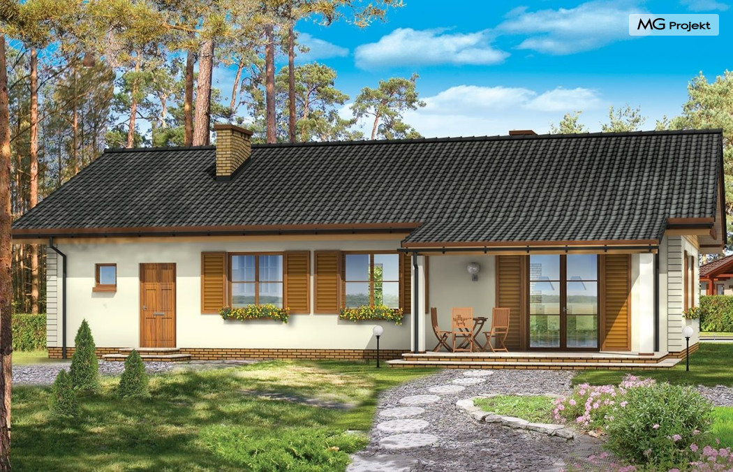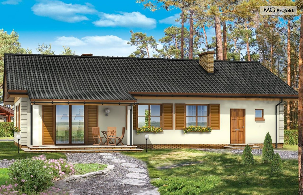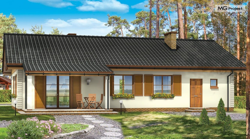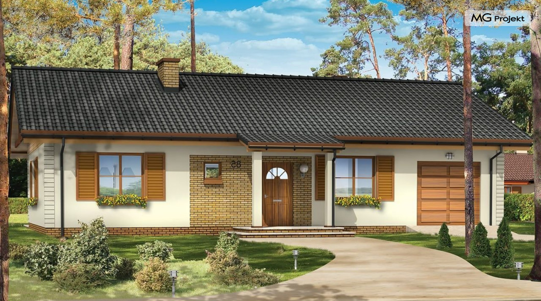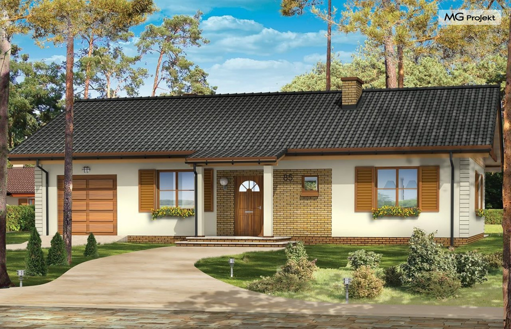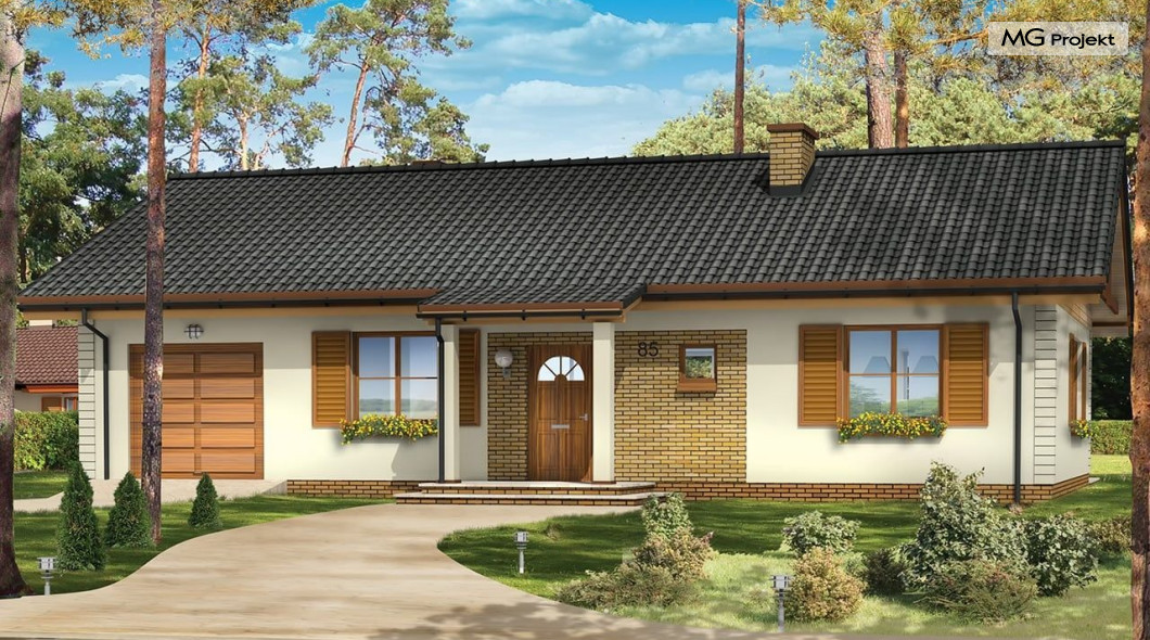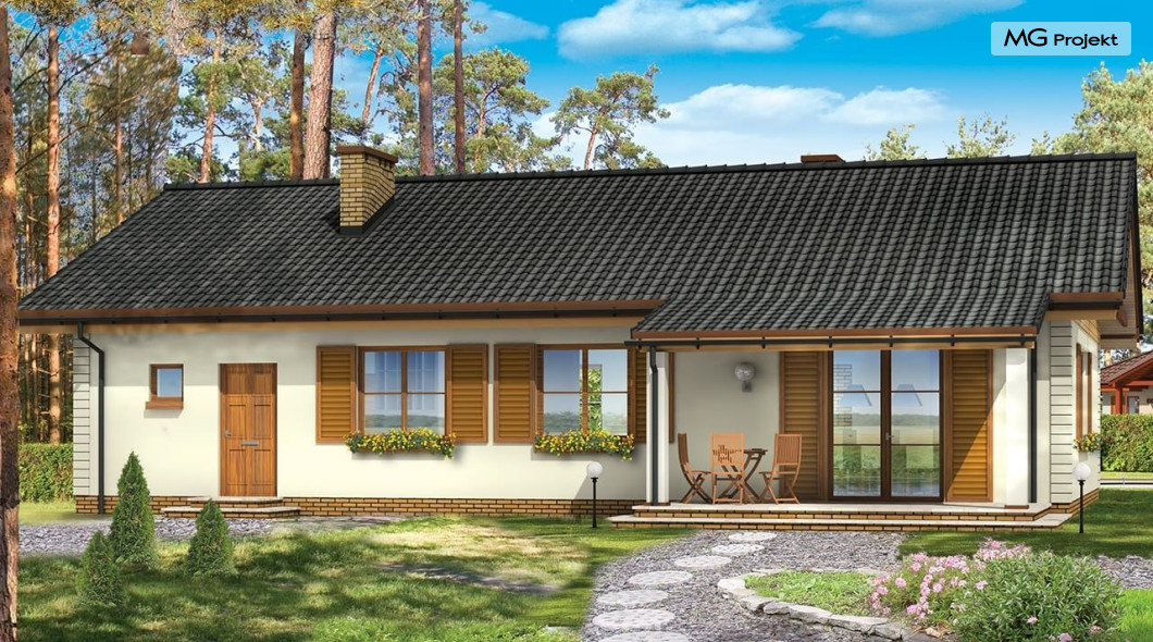 Gotowy projekt Bursztyn to dom o prostej bryle, przekryty dwuspadowym dachem. Ekonomiczny i nieskomplikowany w budowie. We wnętrzu projektu Bursztyn przewidziano oprócz obszernego salonu trzy sypialnie, łazienki oraz pomieszczenie gospodarcze. W projekcie Bursztyn kocioł c.o. może znajdować się wariantowo w pomieszczeniu przy wejściu, lub w przypadku kotłowni na paliwo stałe - w pomieszczeniu za garażem. Pracownia MGProjekt dysponuje także projektem Bursztyn w odbiciu lustrzanym. Zapraszamy do zapoznania się również z projektem domu Bursztyn 2 oraz projekt domu Szpak czyli wersja podstawowa bez garażu.