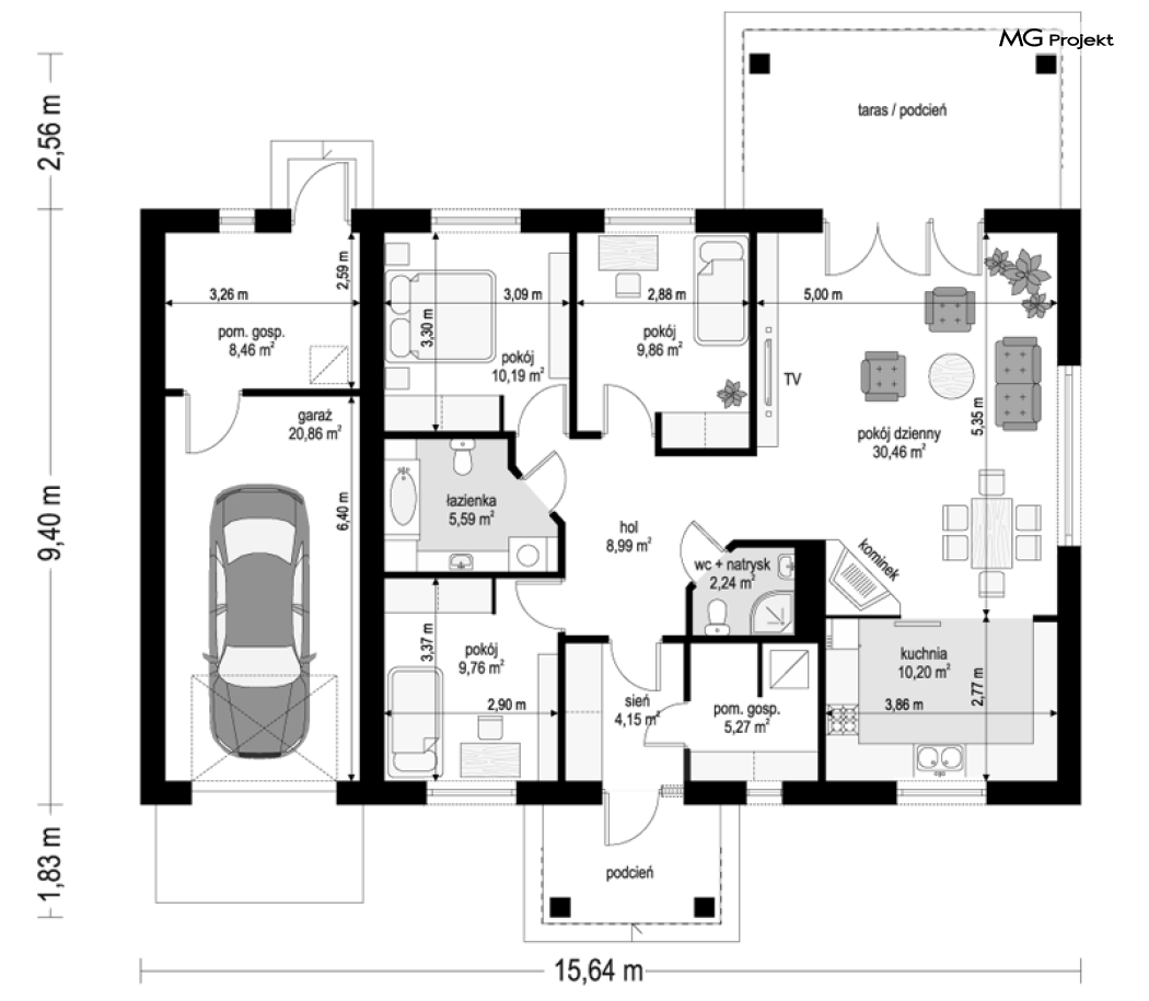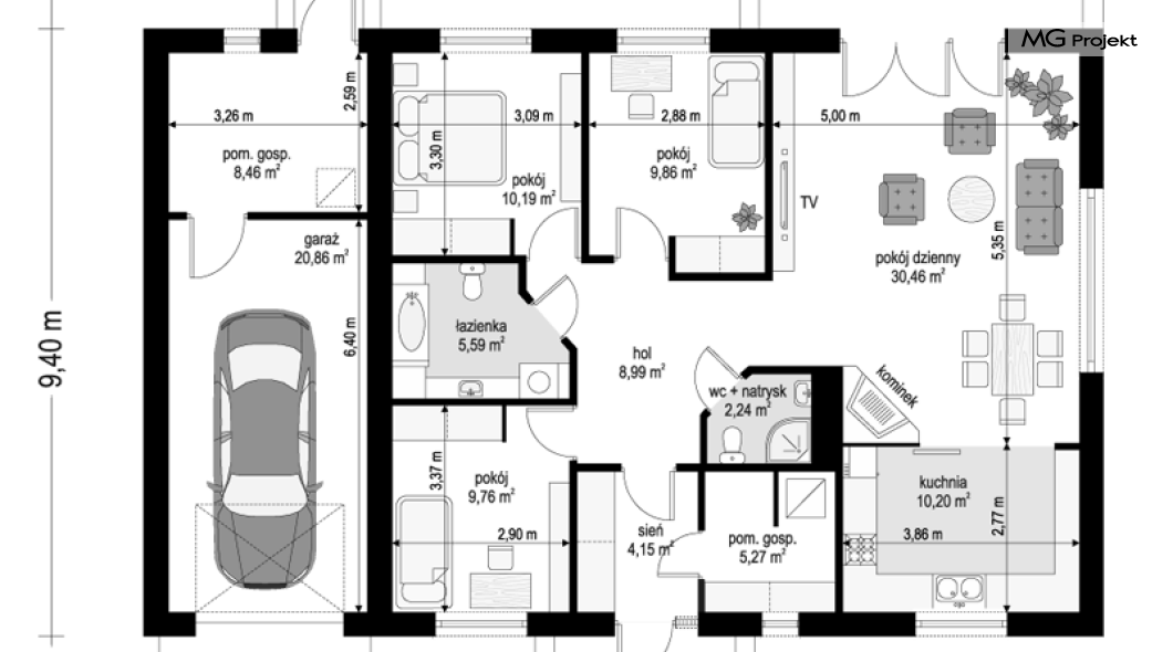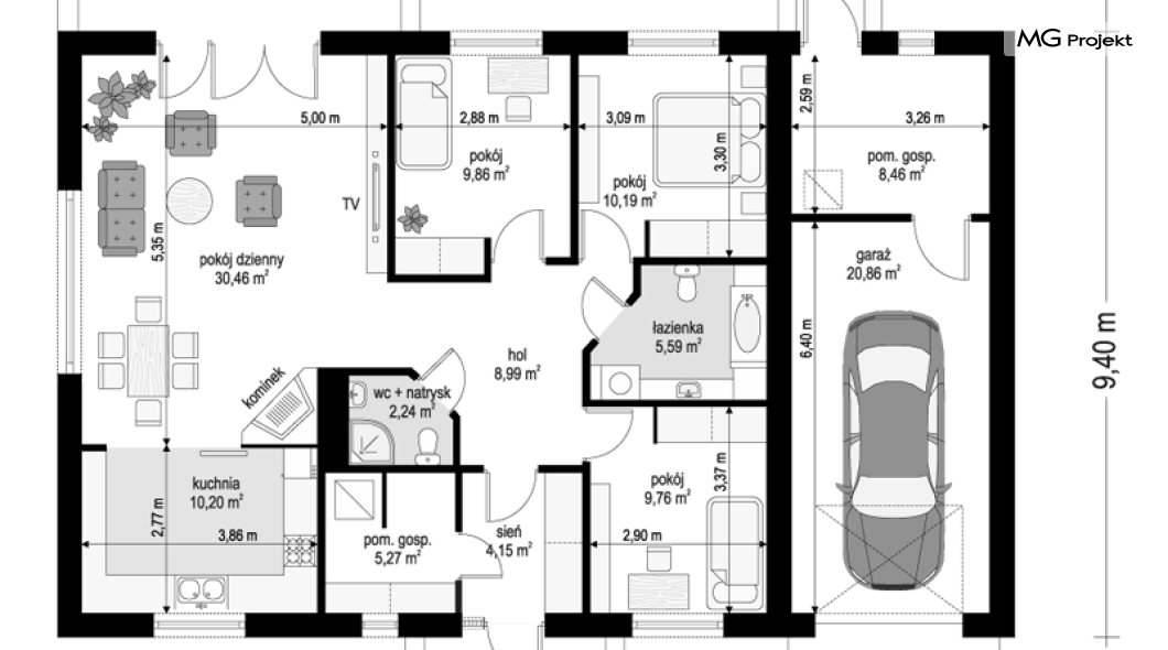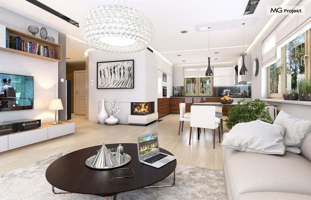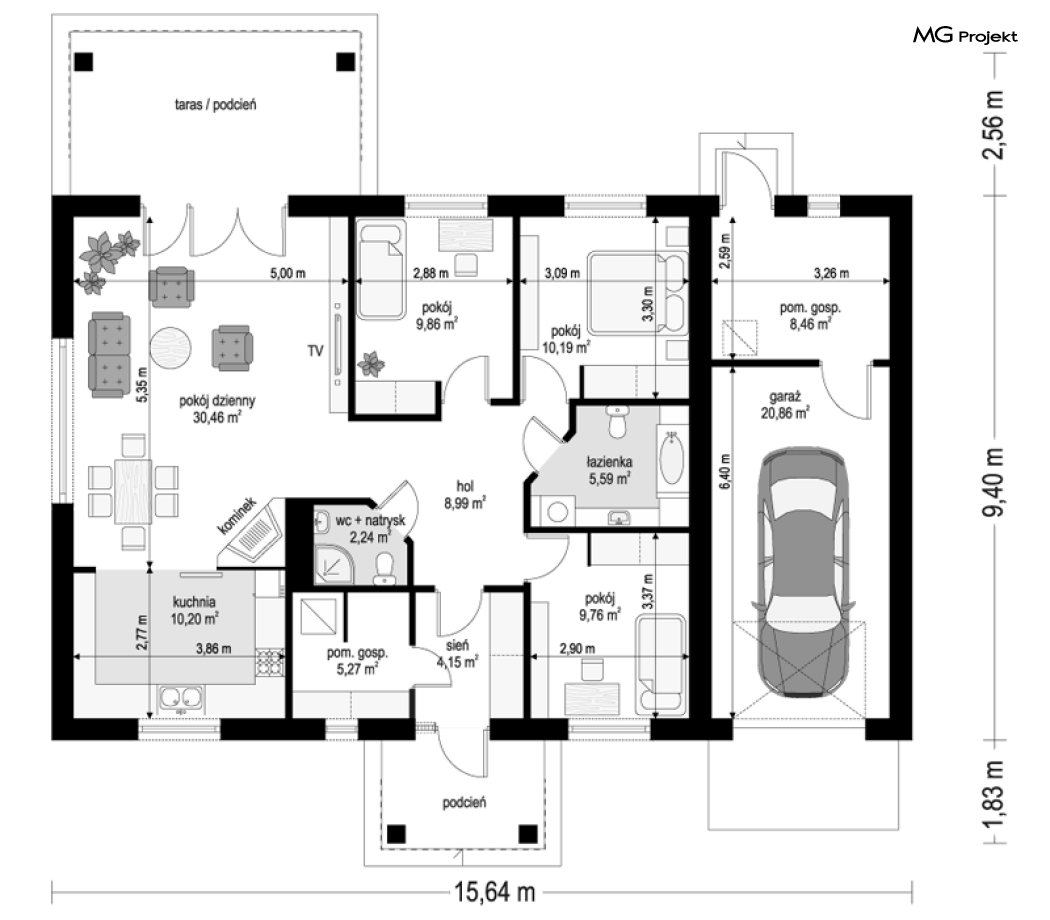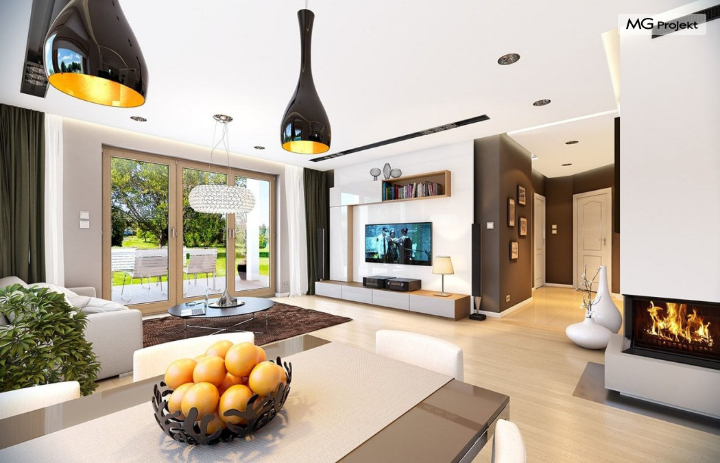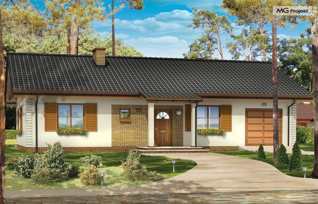 Gotowy projekt Bursztyn to dom o prostej bryle, przekryty dwuspadowym dachem. Ekonomiczny i nieskomplikowany w budowie. We wnętrzu projektu Bursztyn przewidziano oprócz obszernego salonu trzy sypialnie, łazienki oraz pomieszczenie gospodarcze. W projekcie Bursztyn kocioł c.o. może znajdować się wariantowo w pomieszczeniu przy wejściu, lub w przypadku kotłowni na paliwo stałe - w pomieszczeniu za garażem. Pracownia MGProjekt dysponuje także projektem Bursztyn w odbiciu lustrzanym. Zapraszamy do zapoznania się również z projektem domu Bursztyn 2 oraz projekt domu Szpak czyli wersja podstawowa bez garażu.