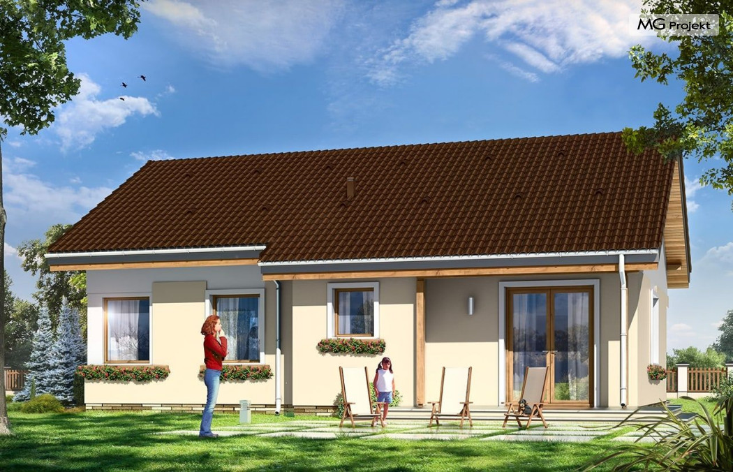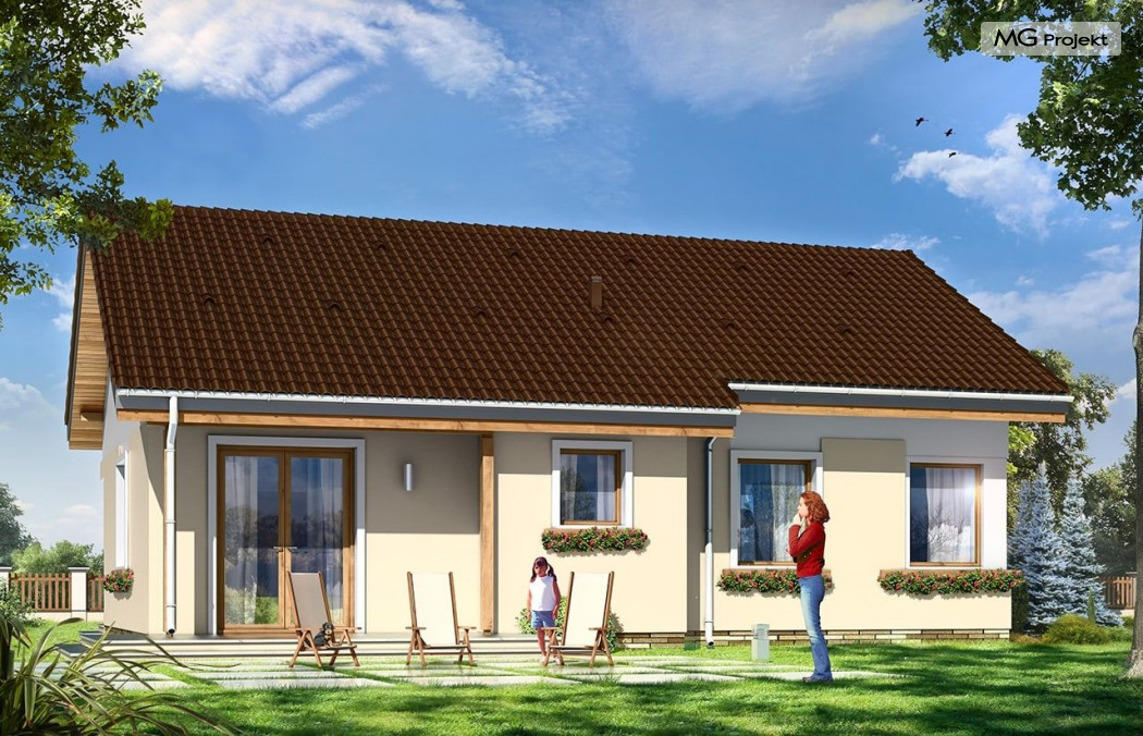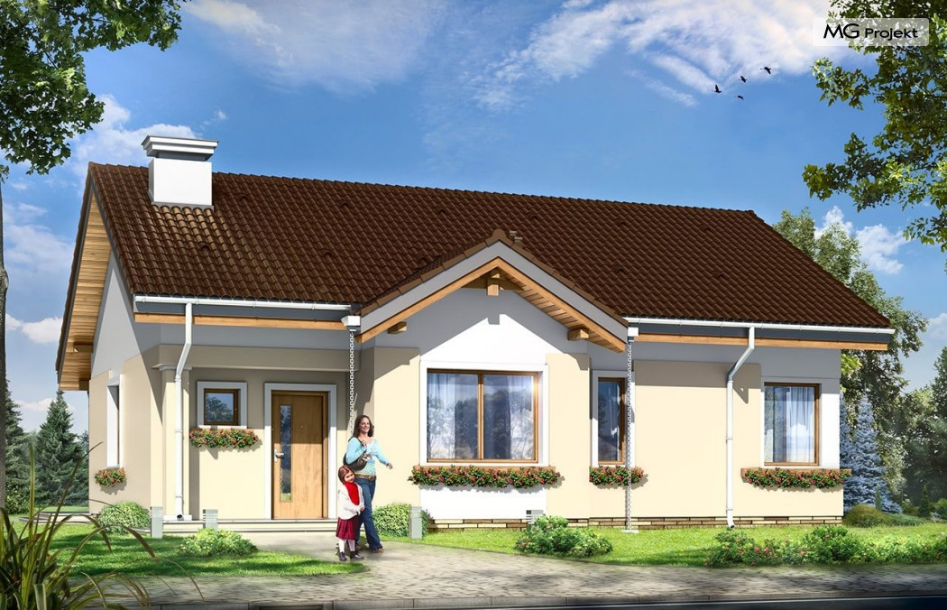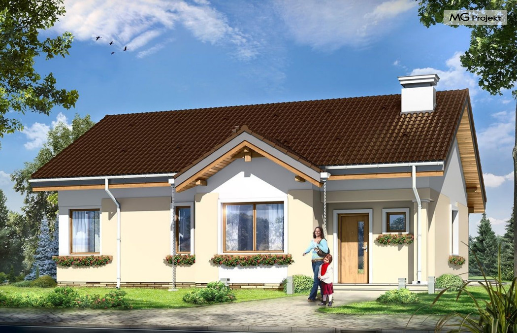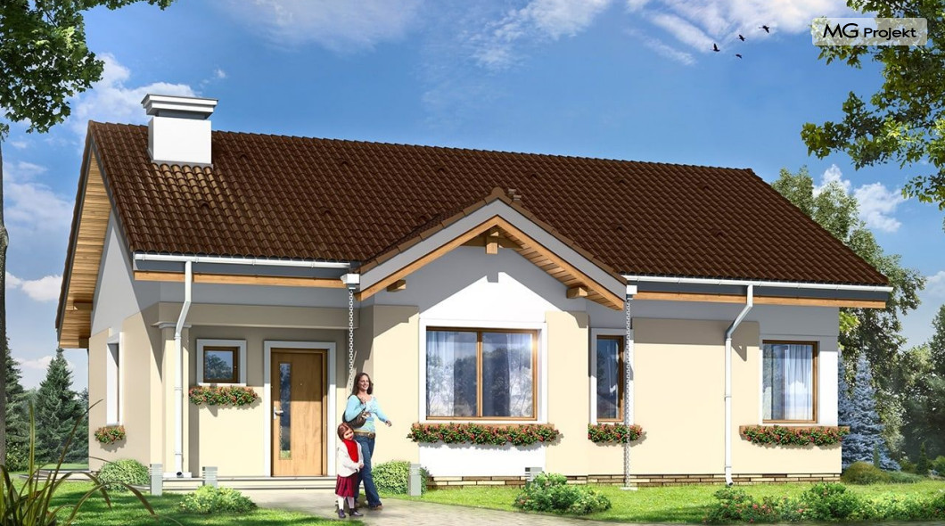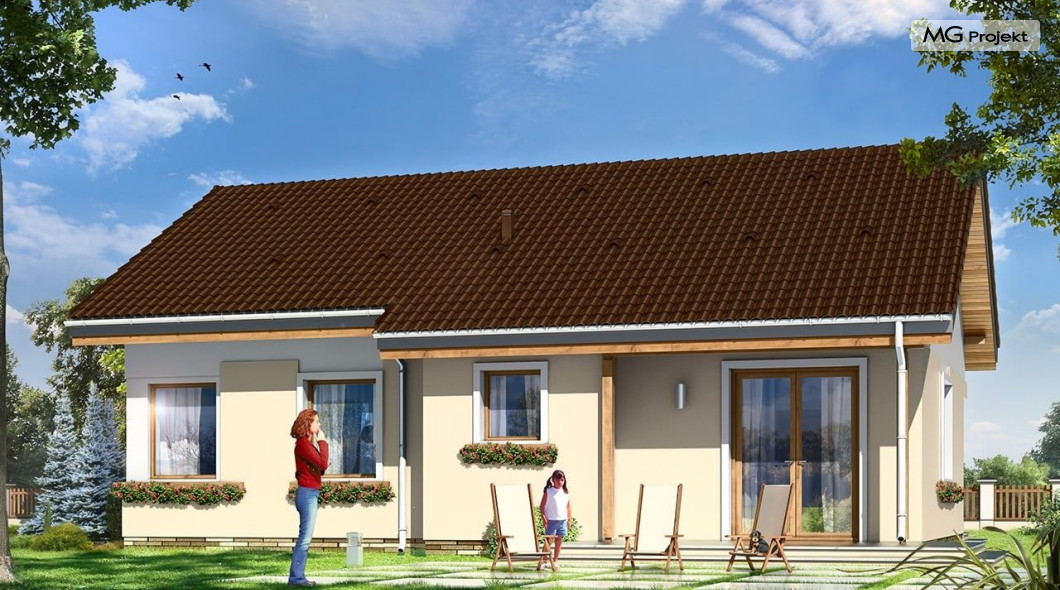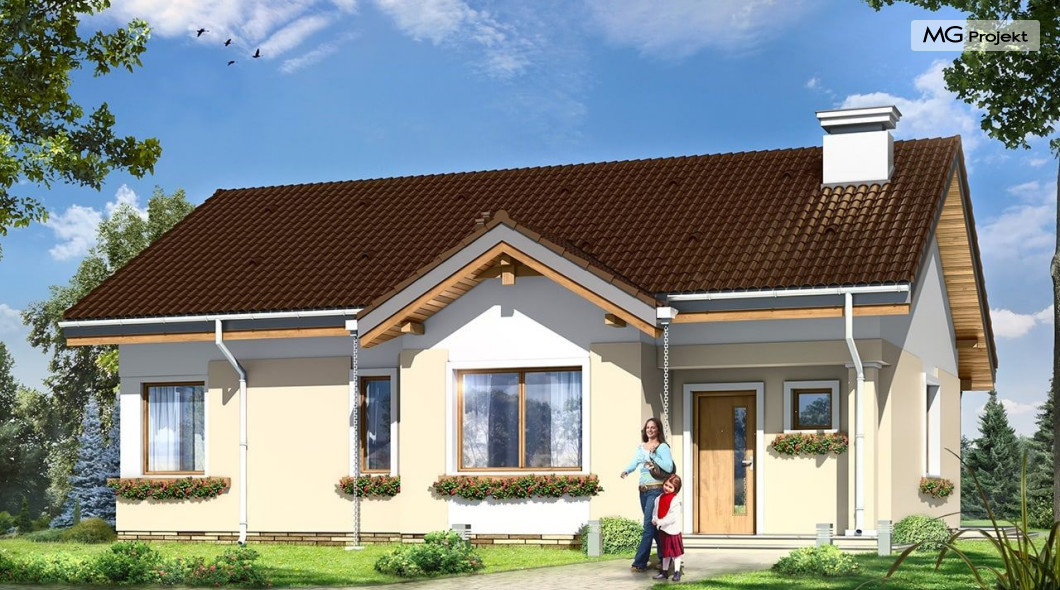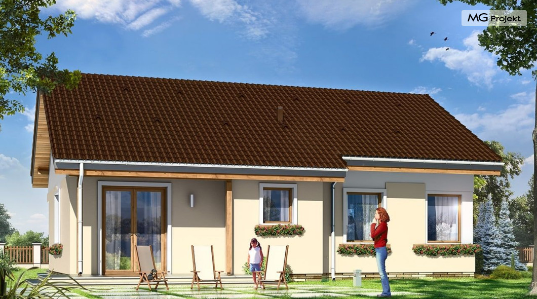 Projekt domu Cypisek 2 to powiększona wersja projektu Cypisek. Parterowy dom dla 4-osobowej rodziny, przekryty prostym, dwuspadowym dachem, z nieużytkowym strychem, który można zaadaptować na poddasze. Elewacja frontowa domu została urozmaicona narożnym podcieniem wejściowym, oraz zadaszonym wykuszem kuchni. Elewację ogrodową wzbogacają szerokie drzwi wyjściowe z salonu na taras, oraz podcień nad częścią tarasu. Cała bryła budynku - choć prosta, została ciekawie skomponowana. Tradycyjne dachy łączą się tutaj z nowoczesnym detalem i materiałami. Wnętrze parteru w domku Cypisek 2 podzielono na część dzienną i nocną - z trzema sypialniami i łazienką. W części dziennej zaprojektowano salon z narożnym kominkiem i wygodną kuchnię z kącikiem jadalnym w wykuszu. Schodki z holu prowadzą na strych nieużytkowy, który można z łatwością można zaadaptować na dodatkowe poddasze. Dostępna jest także wersja projektu Cypisek 2 w odbiciu lustrzanym. Zapraszamy do zapoznania się z pełną ofertą pracowni MG Projekt: projekt domu Cypisek, projekt domu Cypisek 2, projekt domu Cypisek 3, projekt domu Cypisek 4.