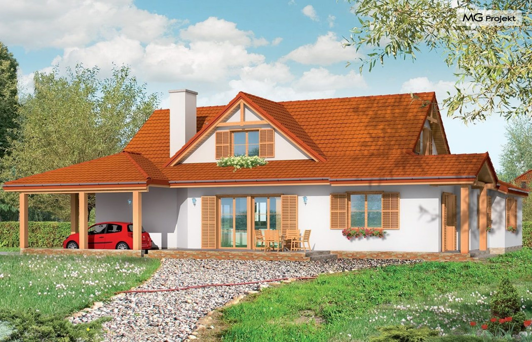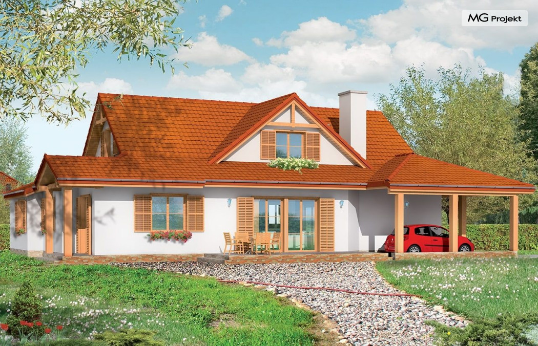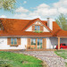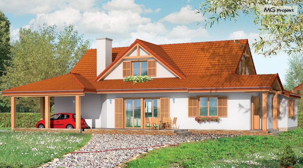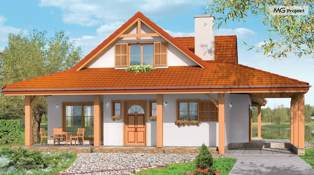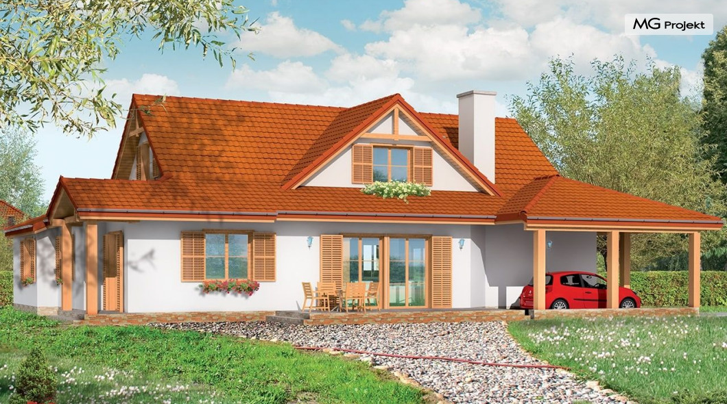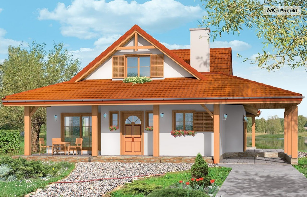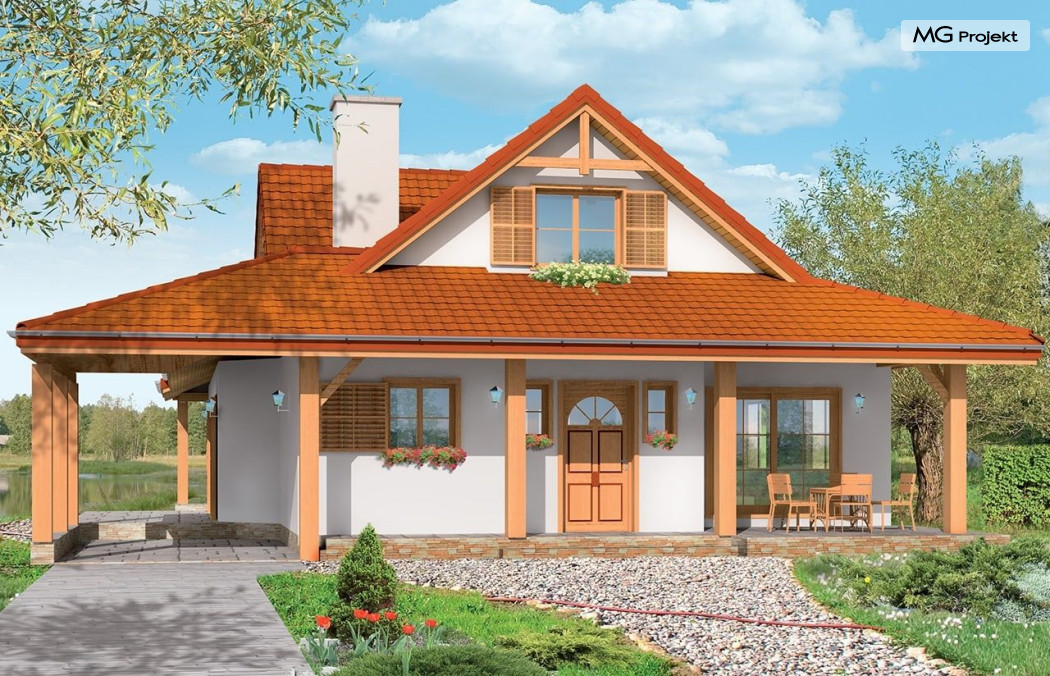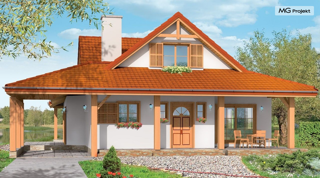 Projekt domu Czapla to niezwykły domek. Jest tak uroczy i oryginalny, że trudno jest na niego nie zwrócić uwagi. Budynek zaprojektowany został w technologii szkieletowej drewnianej. Dom przeznaczony jest dla rodziny 4-5 osobowej. Projekt domu Czapla ma rozbudowany rzut parteru i mniejsze poddasze użytkowe. Otoczony jest bocznymi daszkami, werandami, podcieniami i wiatami. Podcienie podparte są rzędami drewnianych kolumn. Z dachu wystają na trzech elewacjach malownicze szczyciki z środkowo osadzonymi oknami. Dachy o różnych kształtach i kątach nachylenia dają bardzo ciekawy efekt. Dom nie należy do małych, ale dzięki dobrze dobranym proporcjom całość bryły ma skalę człowieka. Sylwetka domu zdaje się wrastać w ziemię, wtapiać w otoczenie. Nie ma tu dużych pustych ścian, a wszystkie drzwi i okna otwierają wnętrze na otaczający ogród. Wnętrze domu Czapla również jest nietuzinkowe. Na parterze zaprojektowano jednoprzestrzenną część dzienną, której centralnym miejscem jest salon z reprezentacyjnymi schodami. Z salonu przechodzi się do kuchni połączonej z jadalnią - z własnym podcienionym tarasem, również do apartamentu rodziców za schodami - z sypialnią, łazienką i garderobą, z salonu jest również połączenie z przytulnym gabinetem - także z własnym wyjściem do ogrodu. Wreszcie z salonu jest połączenie z sienią-holem, pełniącym funkcję szatni i strefy wejściowej domu. Z sieni natomiast możemy dostać się do kotłowni. Na parterze jest wiele wyjść na do ogrodu z różnych pomieszczeń, są trzy podcienie i jeden odsłonięty taras. Przy wejściu zaprojektowano wiatę na samochód. W projekcie Czapla, na poddaszu zaplanowano dwie sypialnie dziecięce i łazienkę. Z dużego holu na poddaszu można też wygrodzić dodatkowy trzeci pokój. Projekt domu Czapla jest również w wersji odbicia lustrzanego.