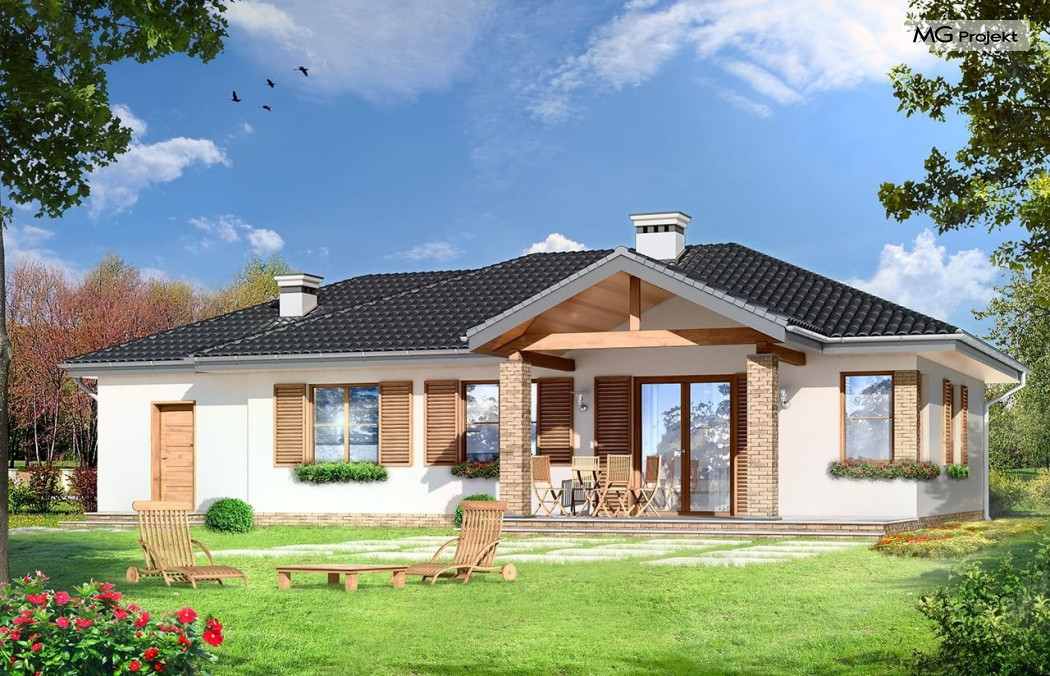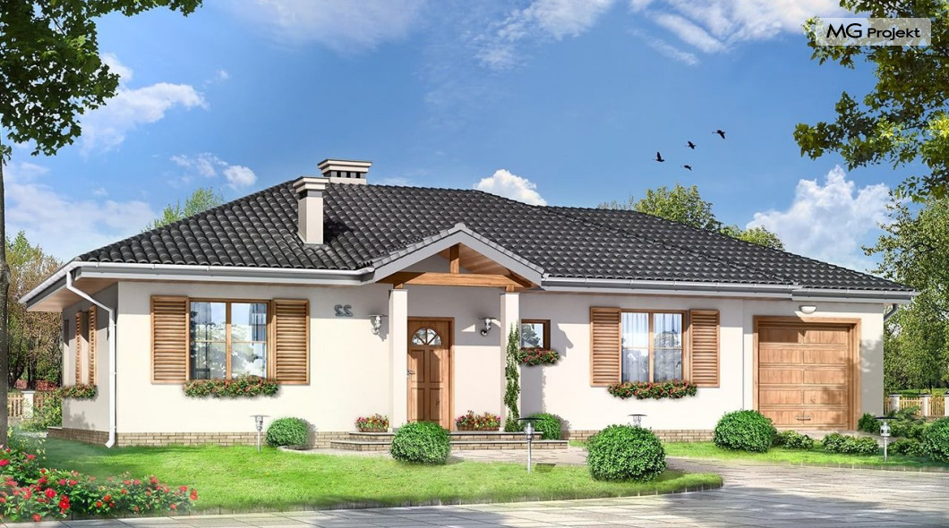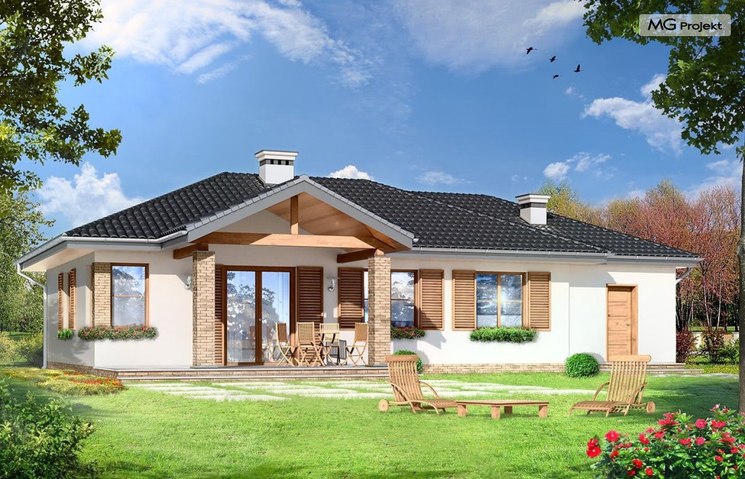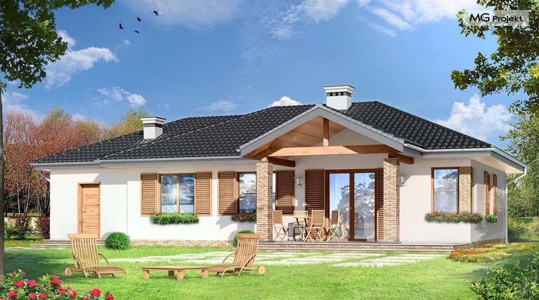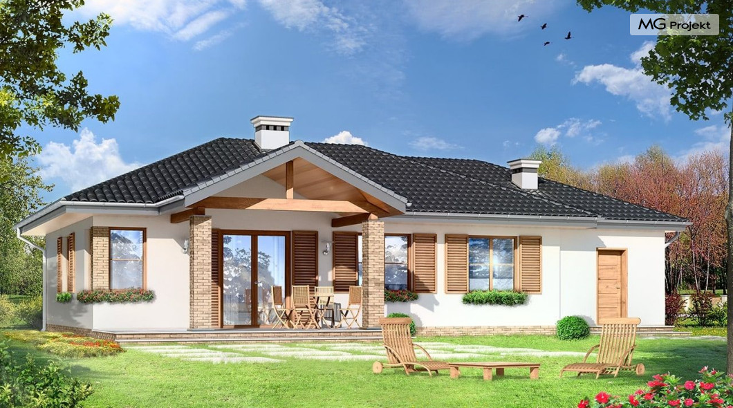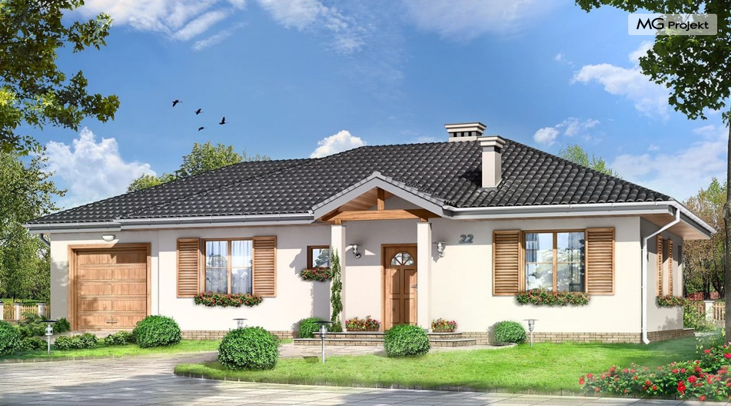 Projekt domu Czaruś to budynek jednorodzinny, parterowy, przykryty czterospadowym dachem, z dobudowanym garażem. Projekt domu Czaruś został zaprojektowany z myślą o 4-5 osobowej rodzinie. Prosta, nieskomplikowana w budowie bryła budynku, oraz bezpretensjonalna architektura, dają czytelny efekt współczesnego domu nawiązującego do tradycji dworkowej, ale z wykorzystaniem nowych materiałów i detali. Elewację frontową domu ozdabia - i jednocześnie akcentuje wejście - centralnie wkomponowany ganek wejściowy, wsparty na dwóch kolumnach. Od strony ogrodu urozmaiceniem bryły jest duży podcień, przekrywający częściowo taras. Wnętrze podzielono na część dzienną - z obszernym salonem, holem i kuchnią, oraz nocną - z trzema sypialniami i łazienką. W projekcie domu Czaruś garaż połączono z wnętrzem korytarzem - garderobą. Za garażem umieszczono kotłownię z wyjściem ogrodowym. Pracownia posiada wersję odbicia lustrzanego projektu.