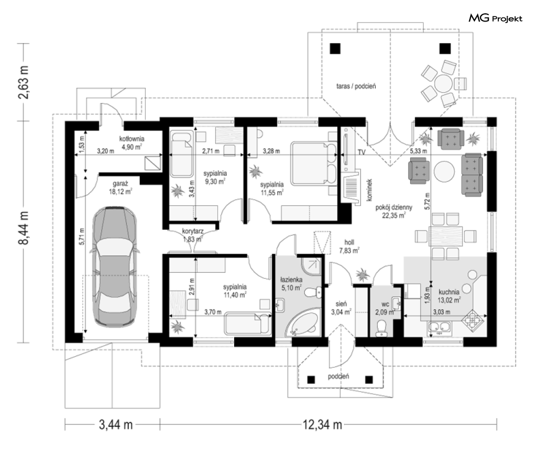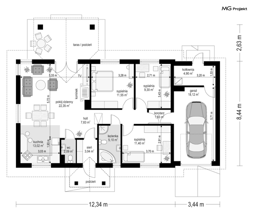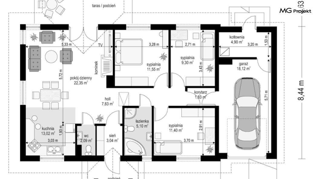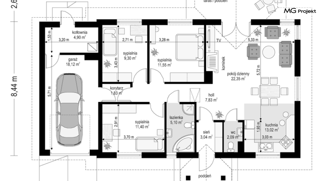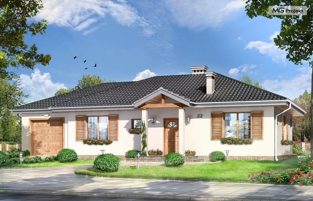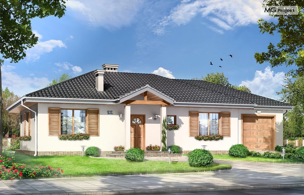 Projekt domu Czaruś to budynek jednorodzinny, parterowy, przykryty czterospadowym dachem, z dobudowanym garażem. Projekt domu Czaruś został zaprojektowany z myślą o 4-5 osobowej rodzinie. Prosta, nieskomplikowana w budowie bryła budynku, oraz bezpretensjonalna architektura, dają czytelny efekt współczesnego domu nawiązującego do tradycji dworkowej, ale z wykorzystaniem nowych materiałów i detali. Elewację frontową domu ozdabia - i jednocześnie akcentuje wejście - centralnie wkomponowany ganek wejściowy, wsparty na dwóch kolumnach. Od strony ogrodu urozmaiceniem bryły jest duży podcień, przekrywający częściowo taras. Wnętrze podzielono na część dzienną - z obszernym salonem, holem i kuchnią, oraz nocną - z trzema sypialniami i łazienką. W projekcie domu Czaruś garaż połączono z wnętrzem korytarzem - garderobą. Za garażem umieszczono kotłownię z wyjściem ogrodowym. Pracownia posiada wersję odbicia lustrzanego projektu.