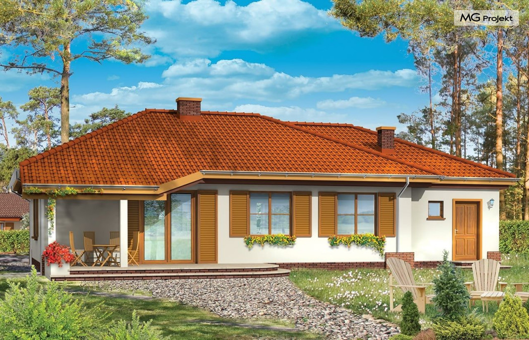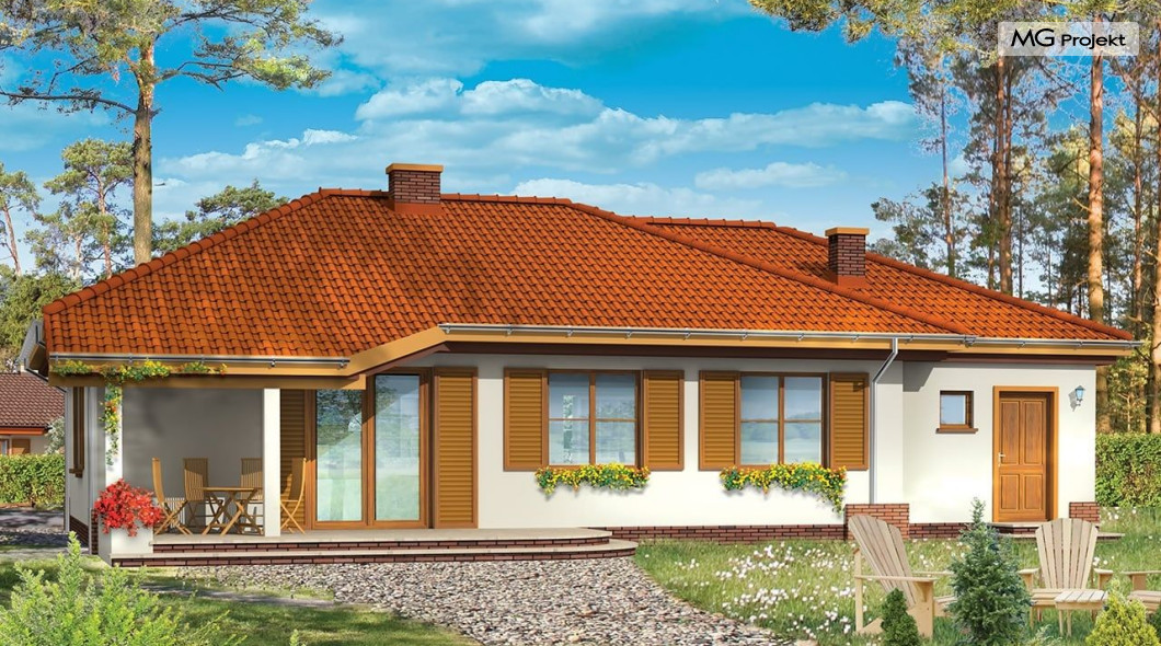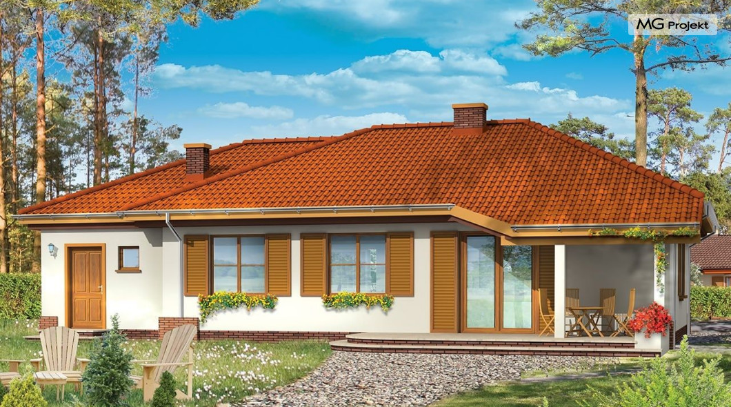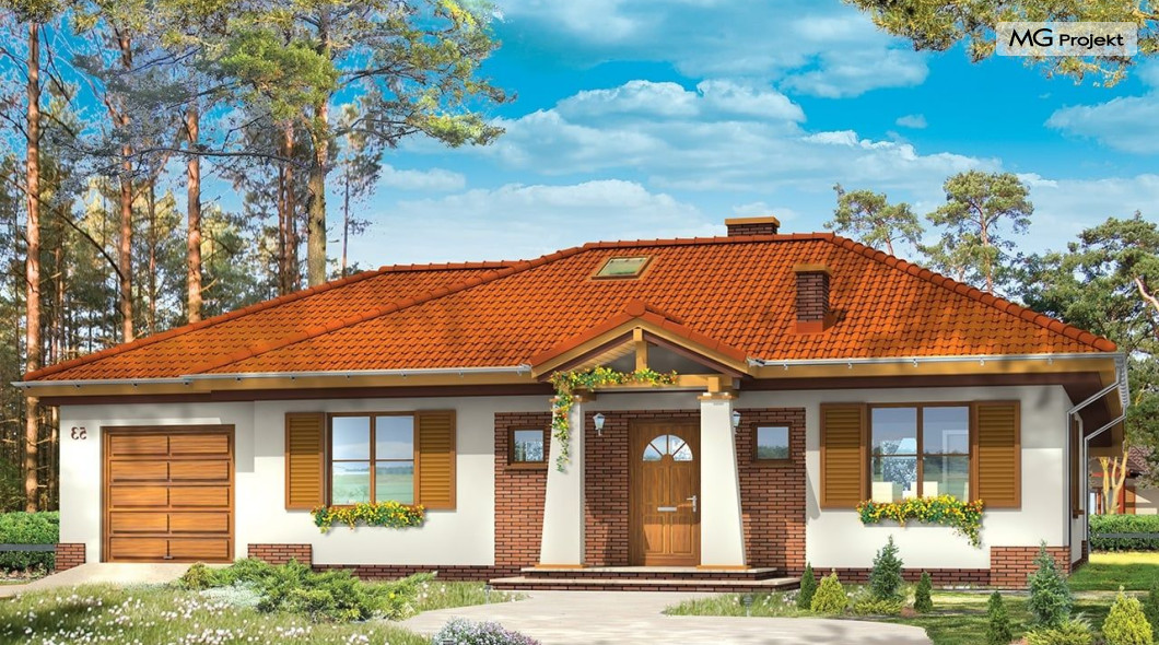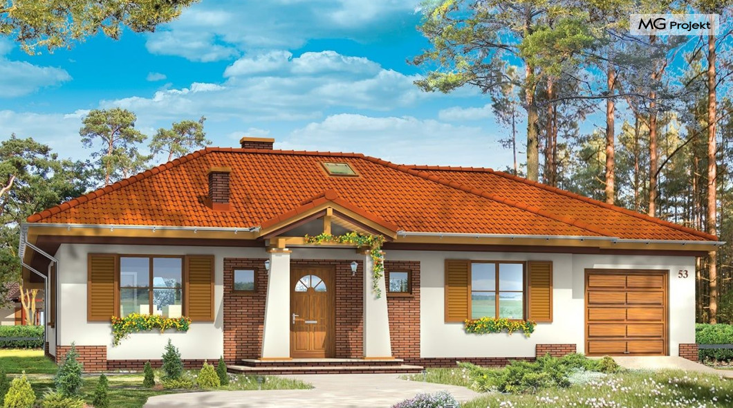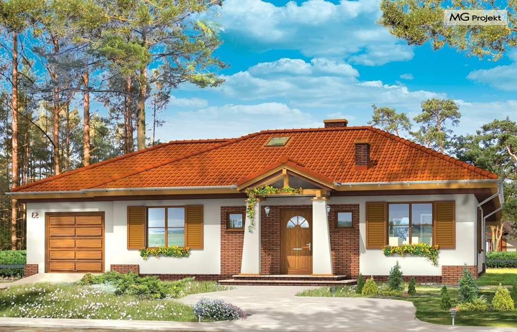Projekt domu Cztery Kąty 2 jest wariantem projektu Cztery Kąty - tym razem z pojedynczym garażem. Propozycja domu dla mniej zmotoryzowanych, ale przede wszystkim dla inwestorów mających węższą działkę, przez co mniej miejsca na sam dom. Część mieszkalna jest identyczna jak w podstawowym projekcie, jedynie garaż uległ zmniejszeniu. Zaprojektowany został również strych nad częścią domu, który można wykorzystać jako pomieszczenie magazynowe. Projekt jest propozycją dla 4-5 osobowej rodziny lubiącej życie na jednym poziomie, blisko ogrodu. Zapraszamy do zapoznania się z pełną ofertą pracowni MG Projekt: projekt domu Cztery Kąty w odbiciu lustrzanym oraz kilka wersji: z garażem jednostanowiskowym (projekt domu Cztery kąty 2), z poddaszem (projekt domu Cztery kąty 3), bez garażu (projekt domu Cztery kąty 4).