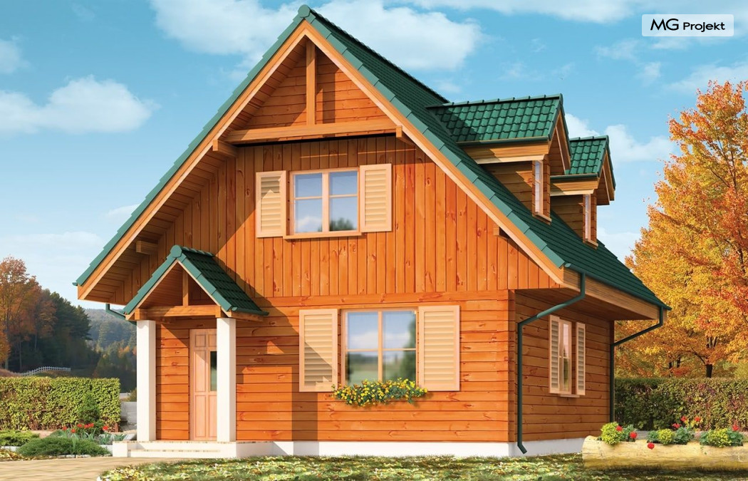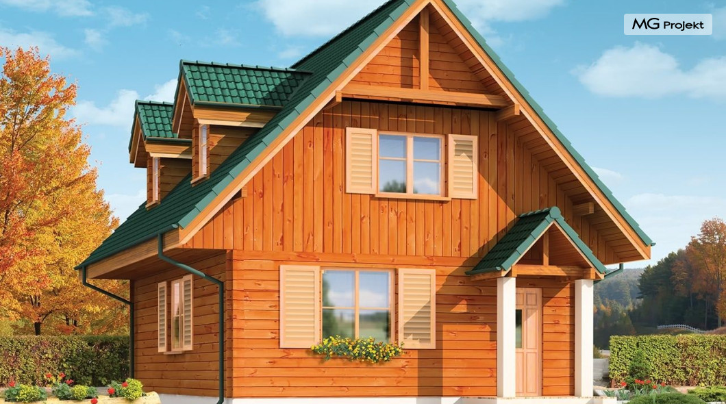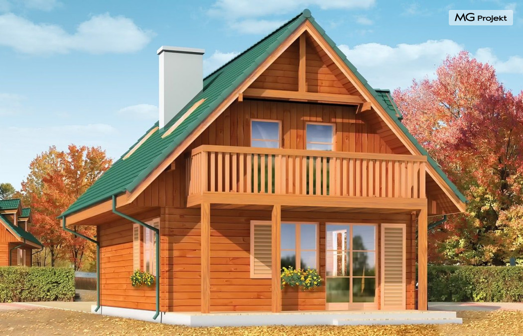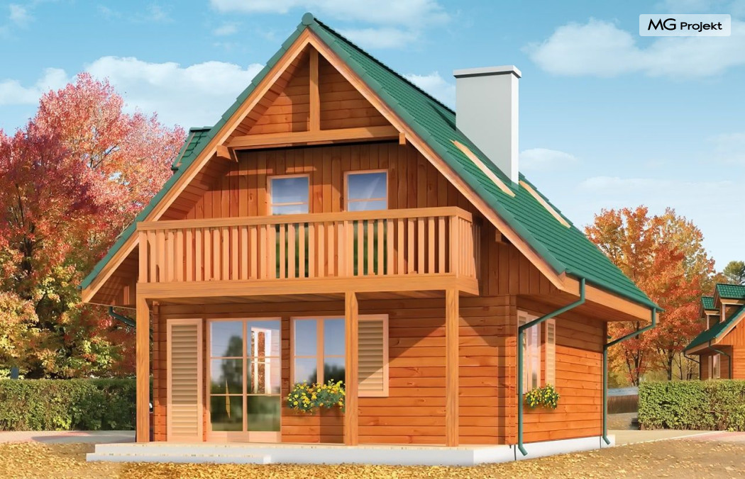 Projekt domu D03 Grześ Drewniany to dom jednorodzinny lub komfortowy domek letniskowy. Budynek o prostej bryle, przekryty dwuspadowym dachem. Idealnie pasuje na działkę z ogrodem z tyłu domu - od strony elewacji tylnej zaprojektowano duży taras, częściowo zadaszony przez obszerny balkon. Front domu Projekt domu D03 Grześ Drewniany zaakcentowany jest ścianą szczytową i wystającą bryłą ganku wejściowego. Mimo małej powierzchni dom prezentuje się okazale. Elewacja drewniana z bali może być zastąpiona tynkiem, możliwe jest również wykonanie elewacji mieszanej: parter tynkowany, poddasze drewniane. Wnętrze: na parterze zaprojektowano duży pokój dzienny z kominkiem, otwarty na kuchnię i holl ze schodami. W projekcie domu D03 Grześ Drewniany na poddaszu umieszczono trzy sypialnie i łazienkę. Dwa pokoje mają wyjście na balkon. Zapraszamy do zapoznania się z pełną ofertą pracowni MG Projekt: D03, D03 z garażem.