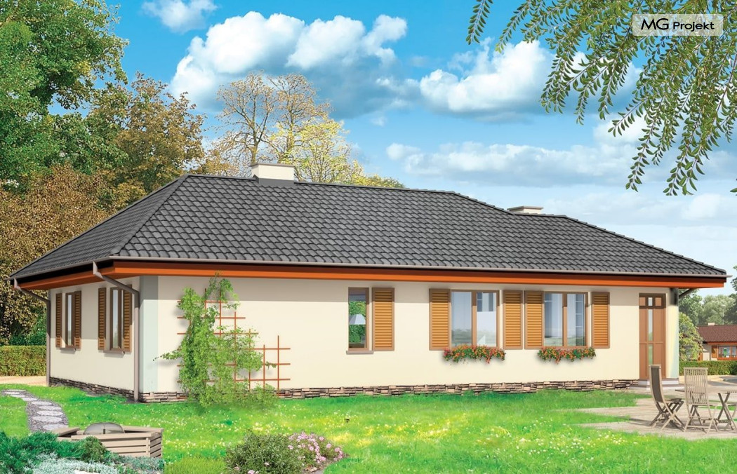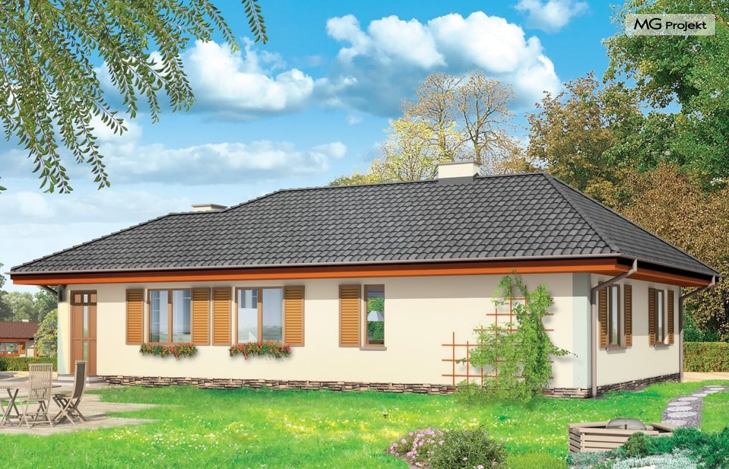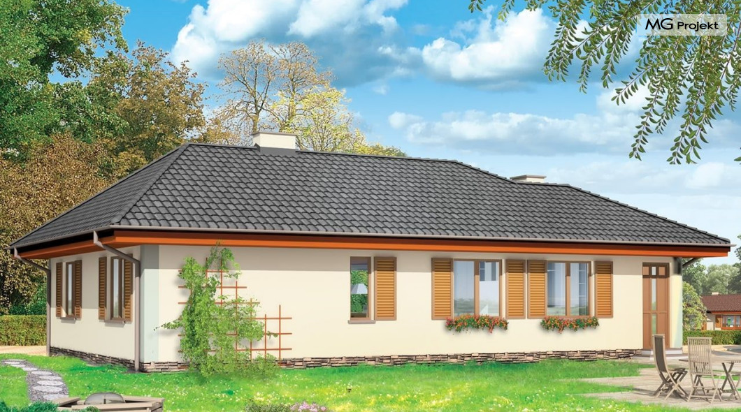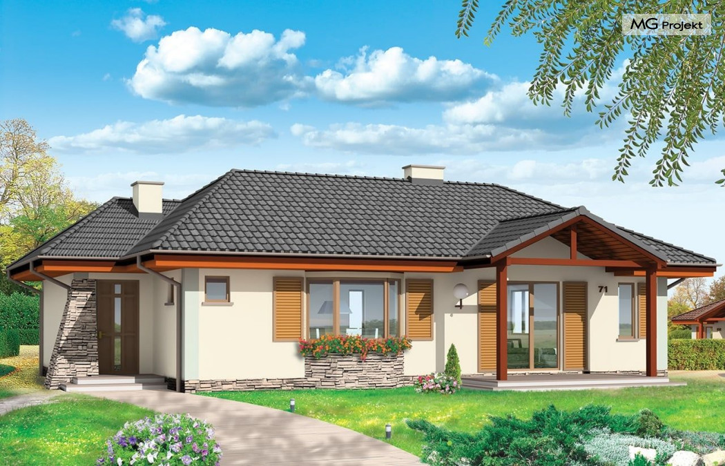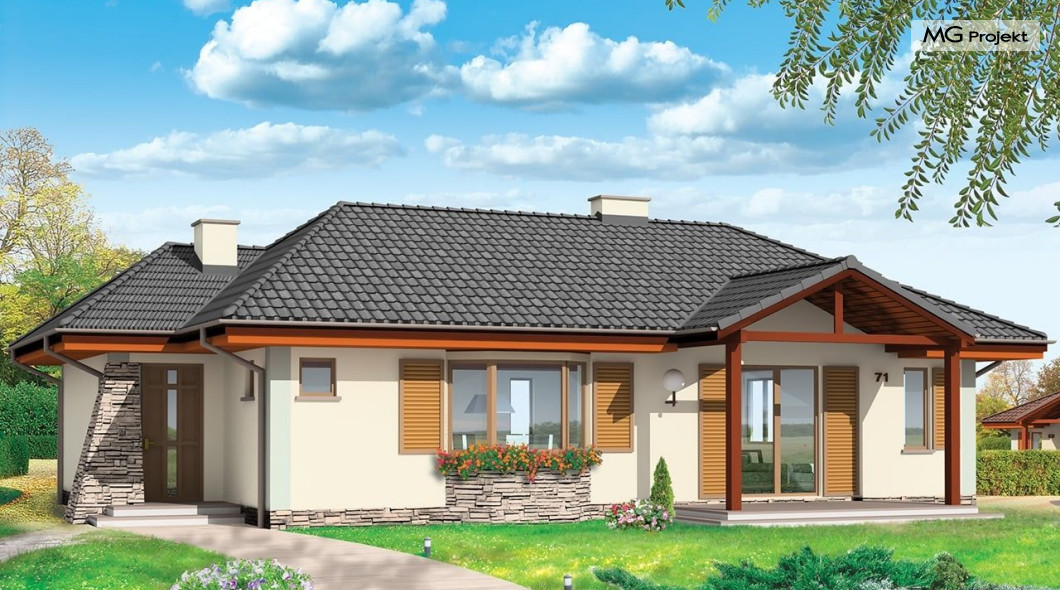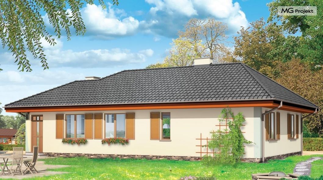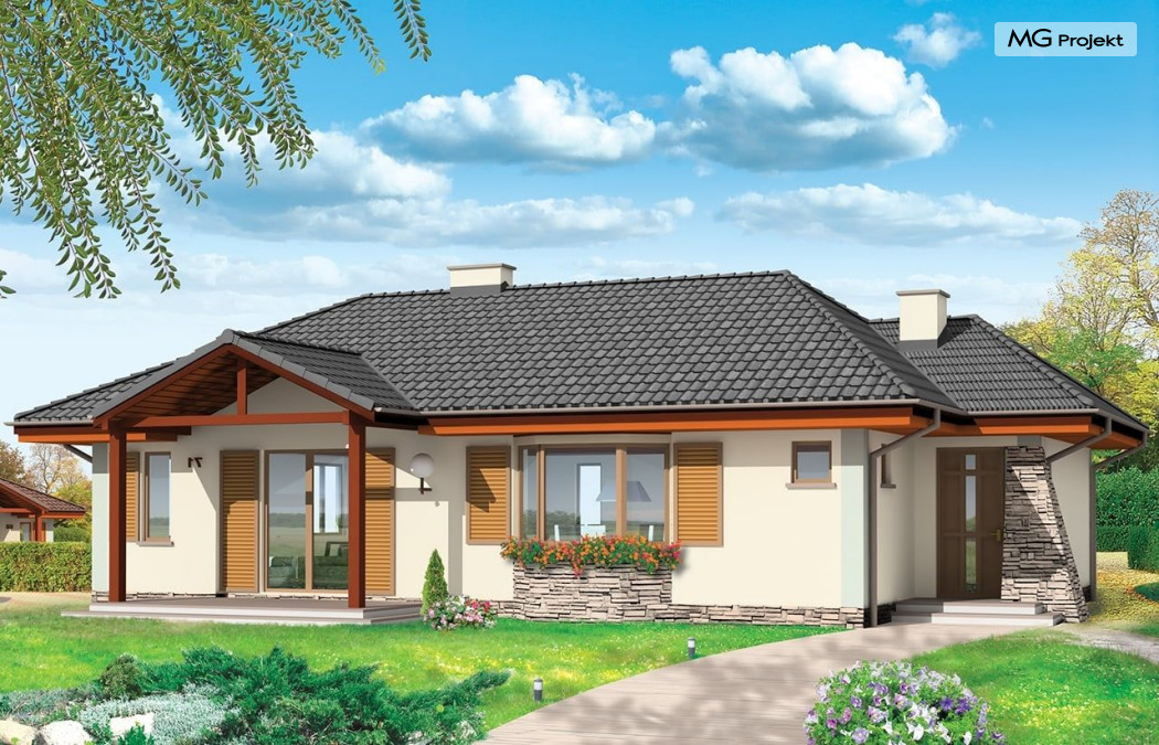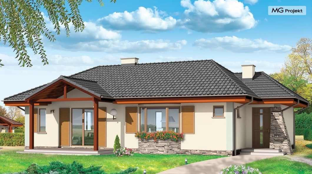 Projekt domu D05 to budynek parterowy dla rodziny 4-5 osobowej, zaprojektowany na trudną działkę z drogą dojazdową od strony południowej. W projekcie domu D05 istnieje możliwość zagospodarowania strychu. Na parterze budynku znajduje się pokój dzienny, częściowo połączony z holem i kuchnią z wyjściem na taras z podcieniem. Duża kuchnia z aneksem jadalnym otwiera się na przestrzeń przed domem przez przeszklony wykusz. Kotłownia dostępna jest z przedsionka i posiada osobne wyjście na zewnątrz. Pomieszczenie gospodarcze przy kuchni może służyć za pralnię lub spiżarnię. Pracownia posiada projekt D05 w odbiciu lustrzanym.