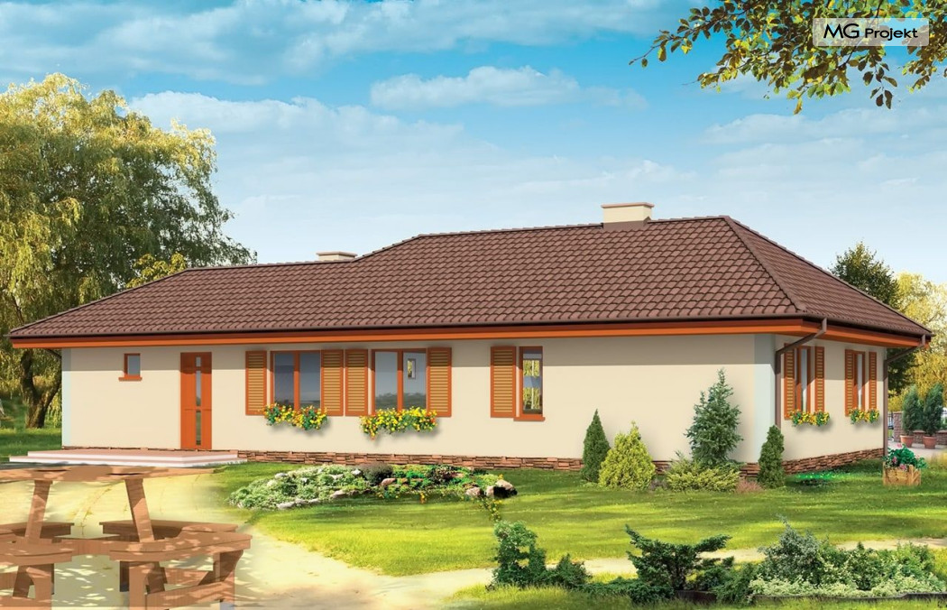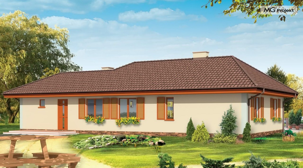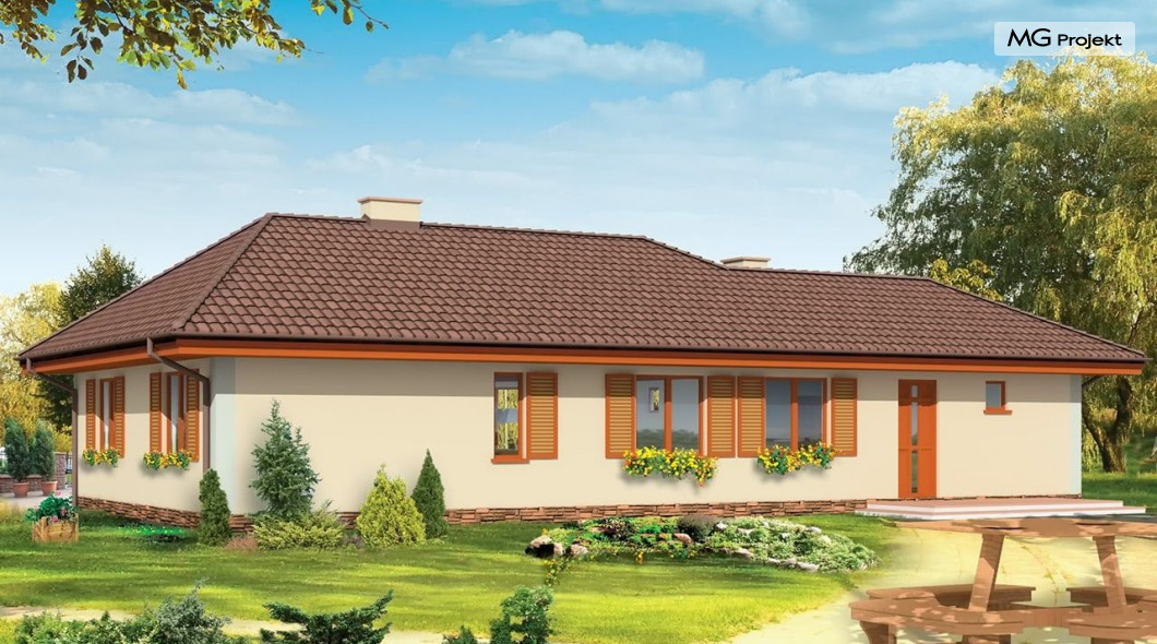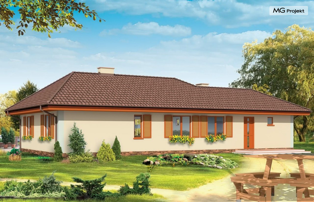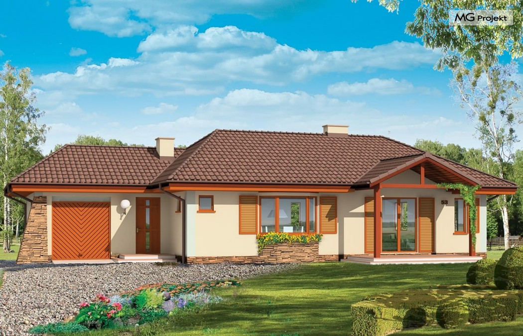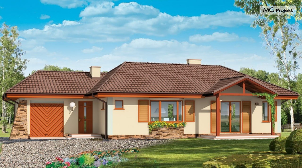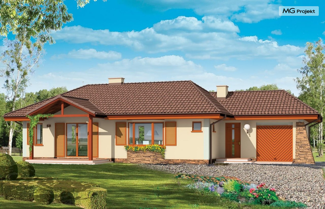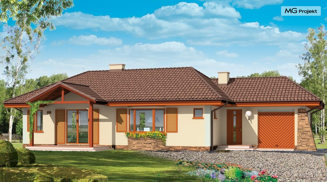 Projekt domu D05 z Garażem to parterowy budynek z garażem, odpowiedni dla rodziny 4-5 osobowej. Zaprojektowany został na trudną działkę z drogą dojazdową od strony południowej. W domu D05 Z Garażem istnieje możliwość zagospodarowania strychu. Na parterze zaprojektowano pokój dzienny częściowo połączony z holem i kuchnią z wyjściem na taras z podcieniem. Duża kuchnia z aneksem jadalnym otwiera się na przestrzeń przed domem przez przeszklony wykusz. Kotłownia dostępna jest z przedsionka i posiada osobne wyjście na zewnątrz. Pomieszczenie gospodarcze przy kuchni może być wykorzystane jako pralnia lub spiżarnia. Dostępna jest też wersja projektu D05 z Garażem w odbiciu lustrzanym. Zapraszamy do zapoznania się z pełną ofertą pracowni MG Projekt: D05.