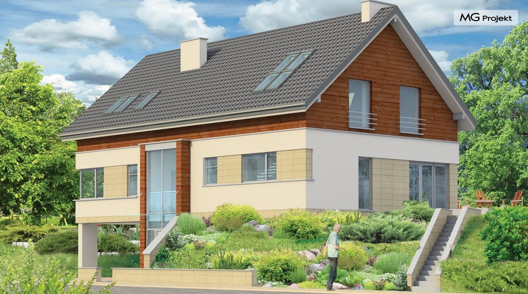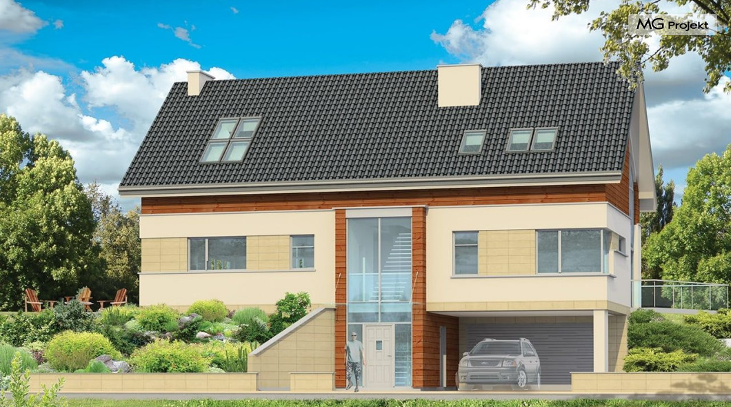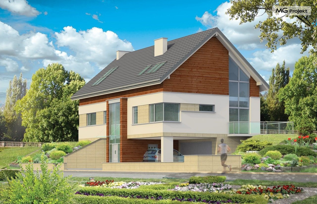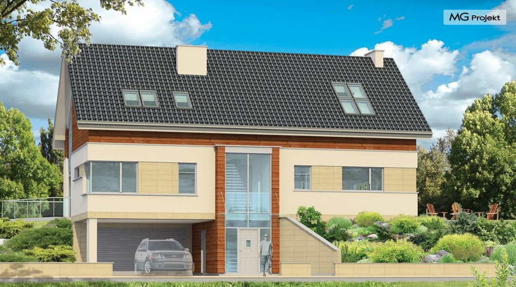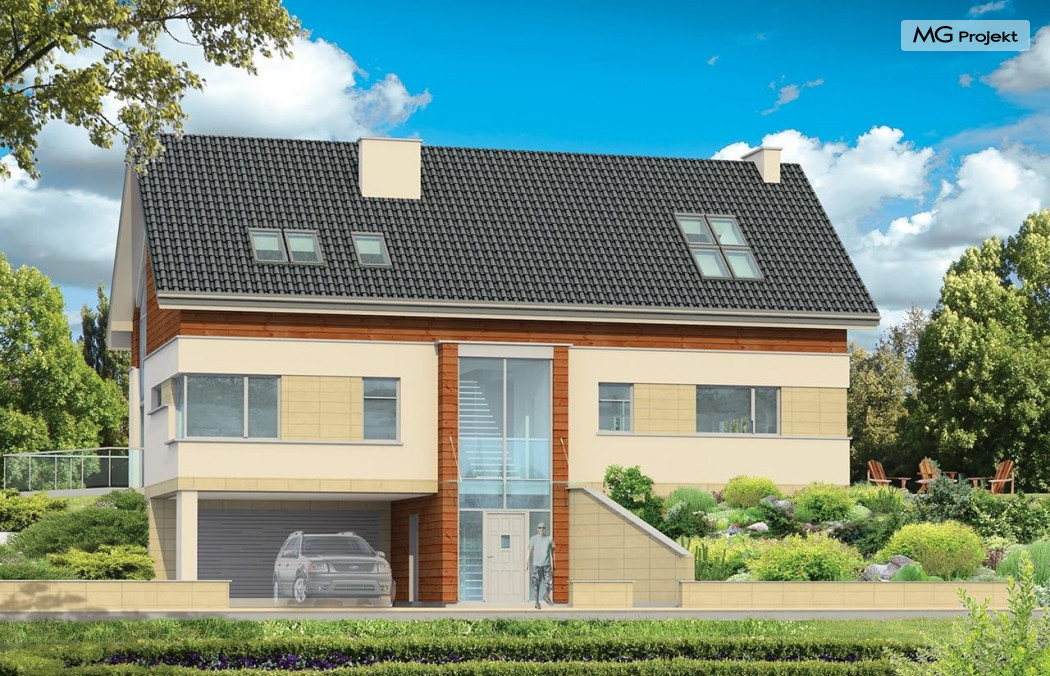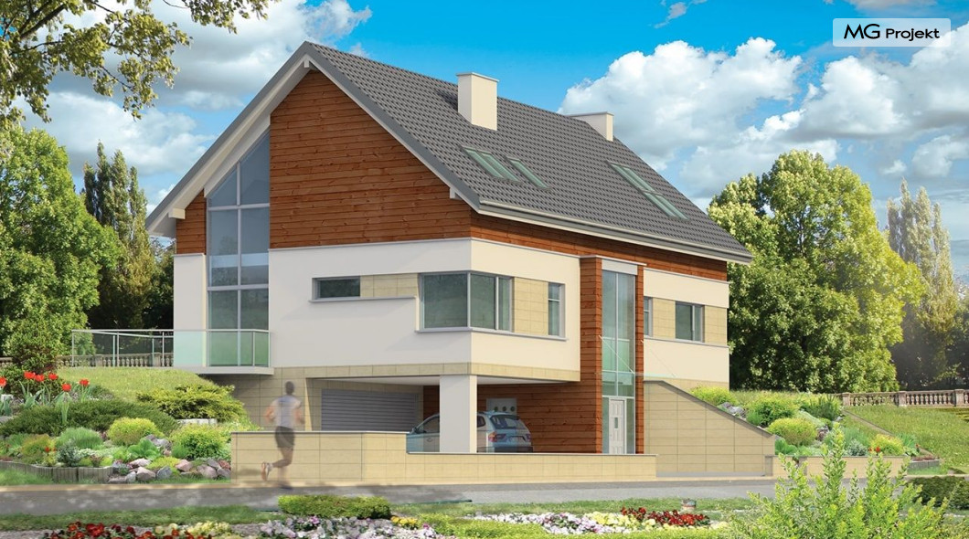 Projekt domu Dom Na Górce to bardzo funkcjonalny dom o zwartej bryle, nowoczesnym wyrazie i prostej formie. Bryła budynku została wkomponowana w skarpę na działce - naturalną lub sztuczną. Ukryto dzięki temu obszerną piwnicę z garażem i wiatą. Dzięki zaprojektowanej wiacie garażowej, która wycina narożnik domu u jego podstawy, bryła stała się bardziej dynamiczna. Wnętrze domu rozwiązano w autorski sposób, wprowadzając wiele oryginalnych rozwiązań, przez co dom będzie sprawiał wrażenie niepowtarzalności. Projekt domu Dom na Górce wyróżnia się przede wszystkim dużą frontową taflą szkła, łączącego holl na parterze z holem i przedsionkiem wejściowym w przyziemiu - piwnicy. Schody - o jasnym prostym układzie są widoczne również od zewnątrz domu. Cechą charakterystyczną projektu Dom Na Górce jest centralne ustawienie holu i schodów oraz wyraźne oddzielenie funkcji dziennej, nocnej i technicznej domu. Jednoprzestrzenna bardzo wygodna w użytkowaniu część dzienna. Wiele szaf, schowków, pomieszczeń pomocniczych - jak spiżarnia, pralnia. Duży wygodny garaż, oraz wiata na dodatkowe auta, do tego bardzo wyraźne podziały w ścian na puste i przeszklone powierzchnie - wszystko to tworzy niepowtarzalny wygląd. Pracownia posiada odbicie lustrzane projektu domu Dom Na Górce.