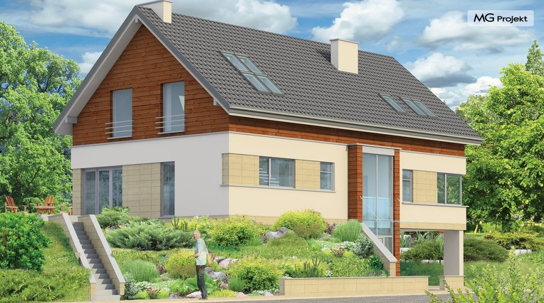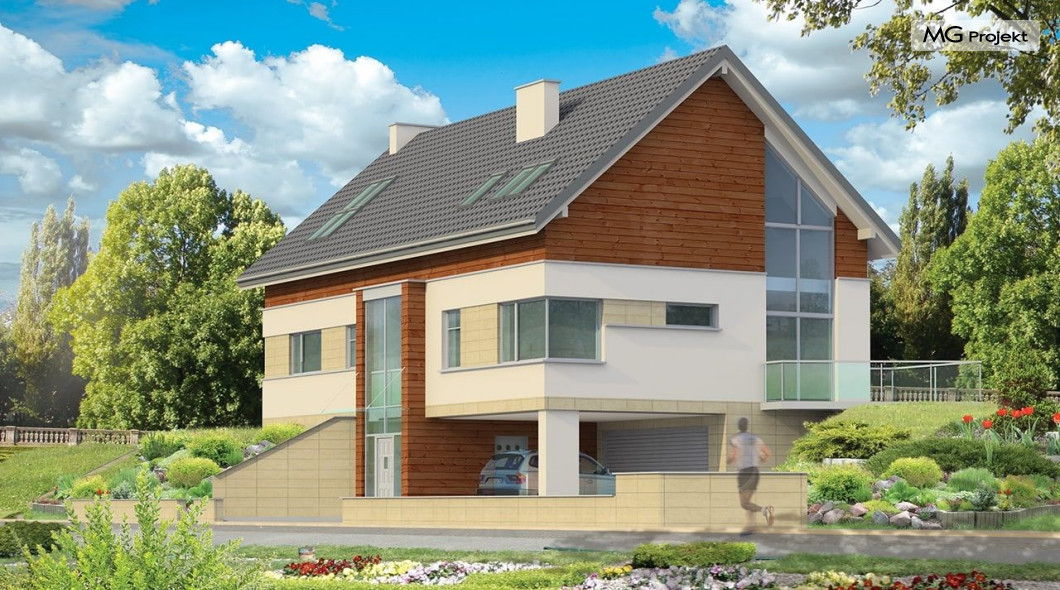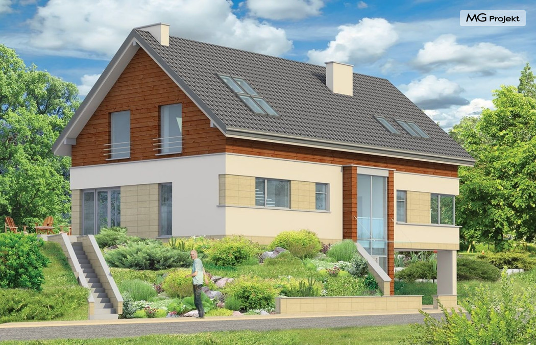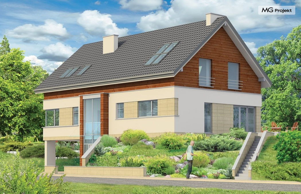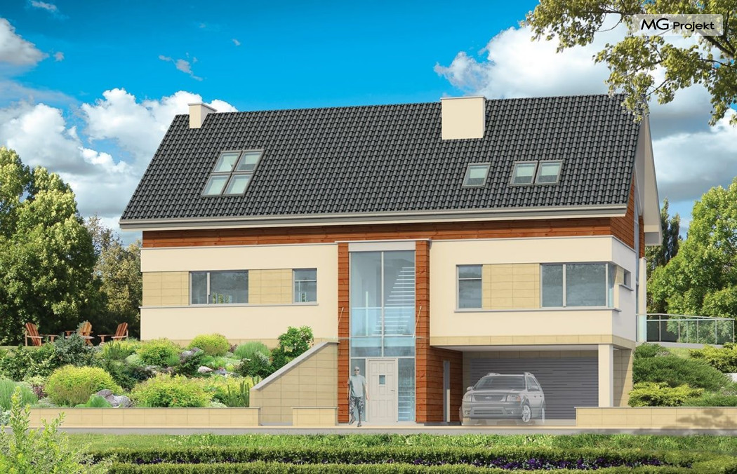 Projekt domu Dom Na Górce to bardzo funkcjonalny dom o zwartej bryle, nowoczesnym wyrazie i prostej formie. Bryła budynku została wkomponowana w skarpę na działce - naturalną lub sztuczną. Ukryto dzięki temu obszerną piwnicę z garażem i wiatą. Dzięki zaprojektowanej wiacie garażowej, która wycina narożnik domu u jego podstawy, bryła stała się bardziej dynamiczna. Wnętrze domu rozwiązano w autorski sposób, wprowadzając wiele oryginalnych rozwiązań, przez co dom będzie sprawiał wrażenie niepowtarzalności. Projekt domu Dom na Górce wyróżnia się przede wszystkim dużą frontową taflą szkła, łączącego holl na parterze z holem i przedsionkiem wejściowym w przyziemiu - piwnicy. Schody - o jasnym prostym układzie są widoczne również od zewnątrz domu. Cechą charakterystyczną projektu Dom Na Górce jest centralne ustawienie holu i schodów oraz wyraźne oddzielenie funkcji dziennej, nocnej i technicznej domu. Jednoprzestrzenna bardzo wygodna w użytkowaniu część dzienna. Wiele szaf, schowków, pomieszczeń pomocniczych - jak spiżarnia, pralnia. Duży wygodny garaż, oraz wiata na dodatkowe auta, do tego bardzo wyraźne podziały w ścian na puste i przeszklone powierzchnie - wszystko to tworzy niepowtarzalny wygląd. Pracownia posiada odbicie lustrzane projektu domu Dom Na Górce.