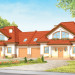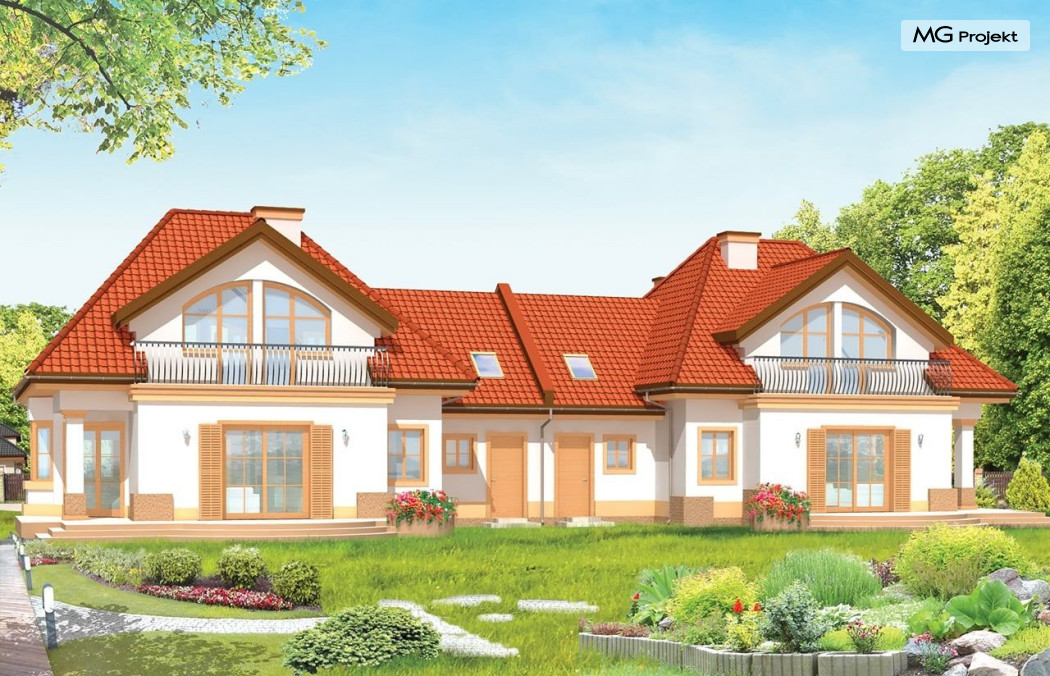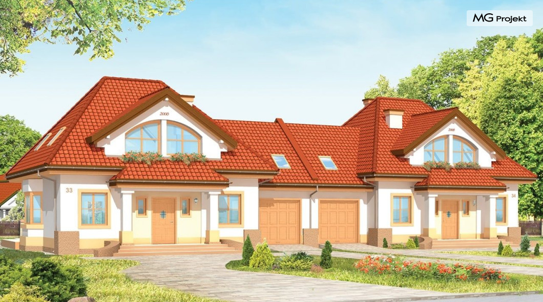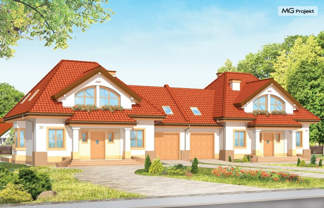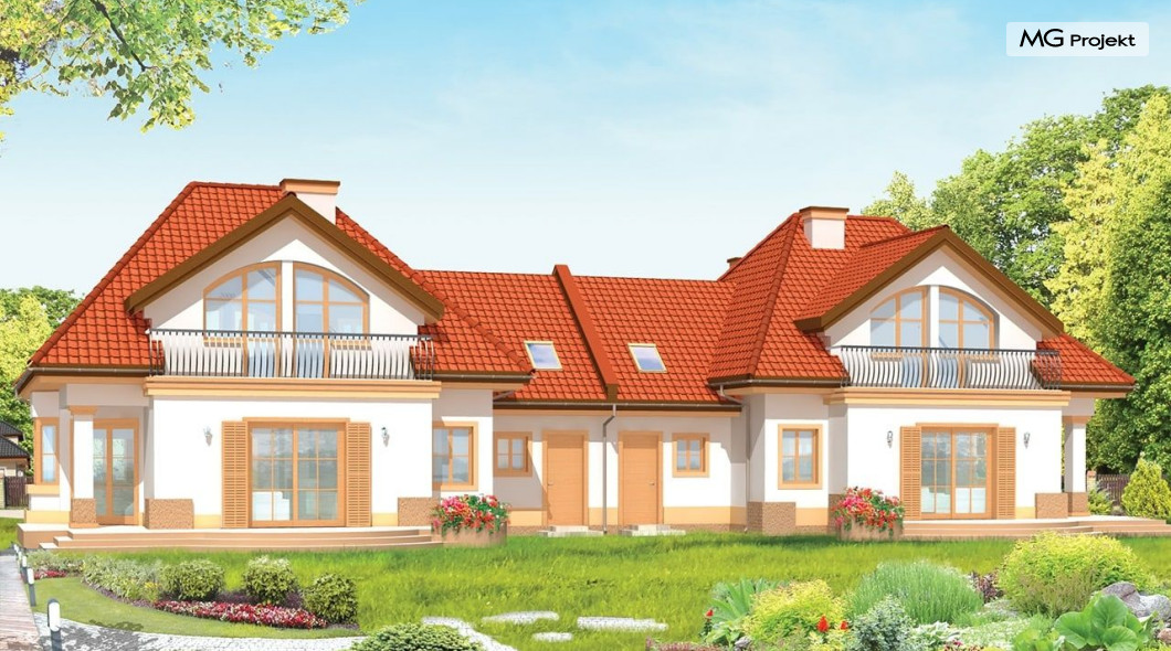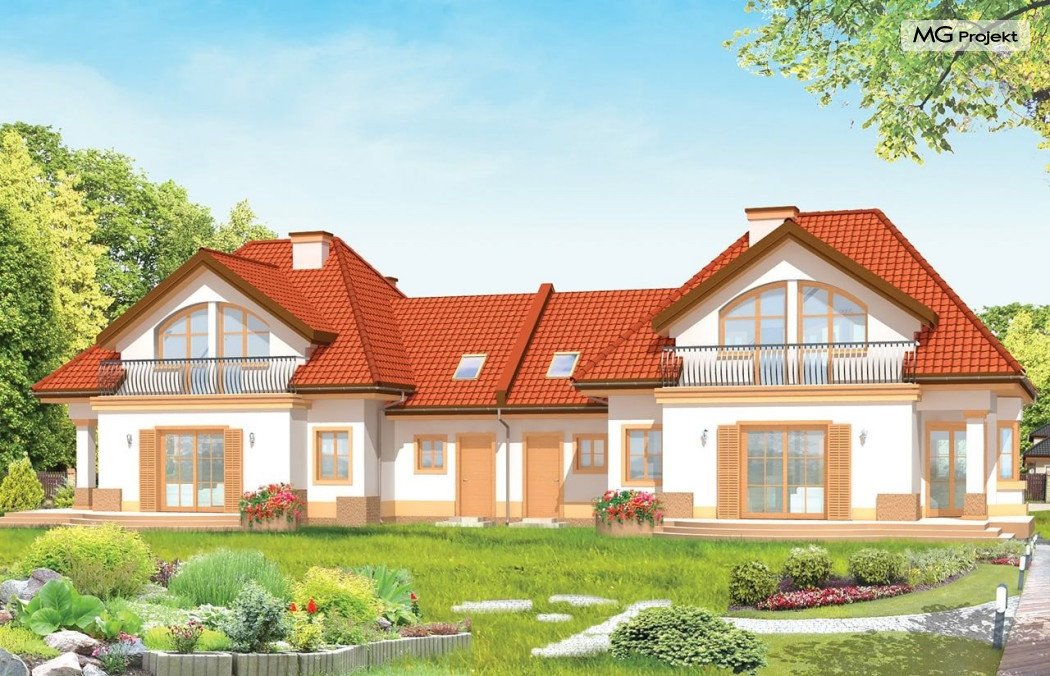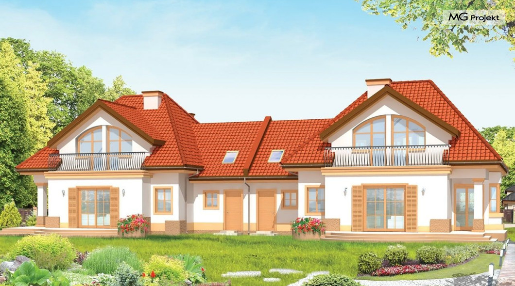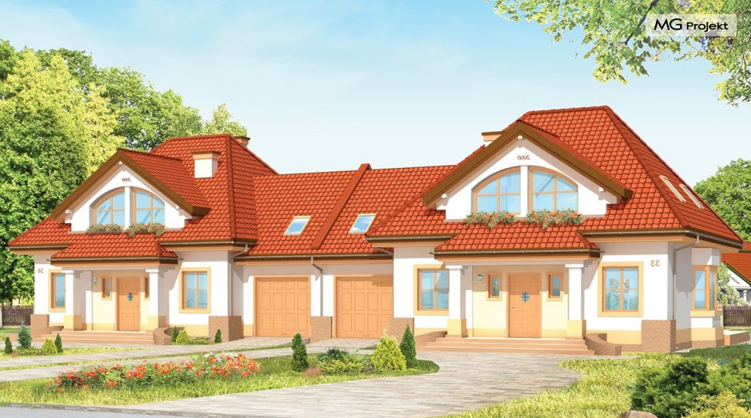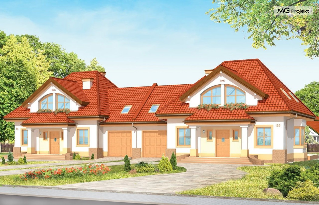 Projekt domu Dom Na Medal - Bliźniak to bliźniaczy budynek jednorodzinny, występujący również w wersji wolnostojącej. Dom przeznaczony dla dwóch rodzin 4-5 osobowych. Domek został zaprojektowany na planie prostokąta, przekrytego wielospadowym dachem z dobudowanym garażem, jako łącznikiem dwóch połówek bliźniaka. Wnętrze: na parterze zaprojektowano salon z aneksem jadalnym i niewielkim podcieniem, półotwartą kuchnię ze spiżarnią, dodatkowy pokój z łazienką - oddzielony od części dziennej, kotłownię i garaż. Na poddaszu umieszczono trzy sypialnie, wygodną łazienkę i dodatkowy pokój nad garażem. Dom jest funkcjonalnie i oszczędnie zaprojektowany. Ciekawe lukarny, podcień wejściowy i ogrodowy, wykusz jadalni i duże przeszklenie z salonu na taras - dają atrakcyjny wygląd zewnętrzny. Zapraszamy do zapoznania się z pełną ofertą pracowni MG Projekt: Dom na medal 2 - połowa bliźniaka.