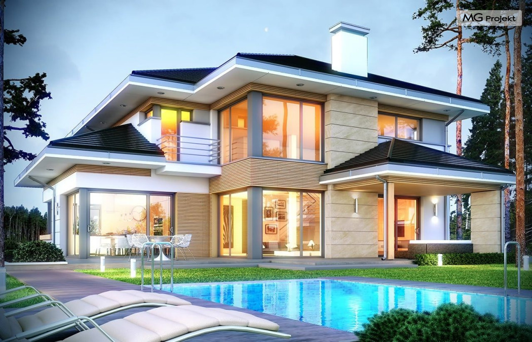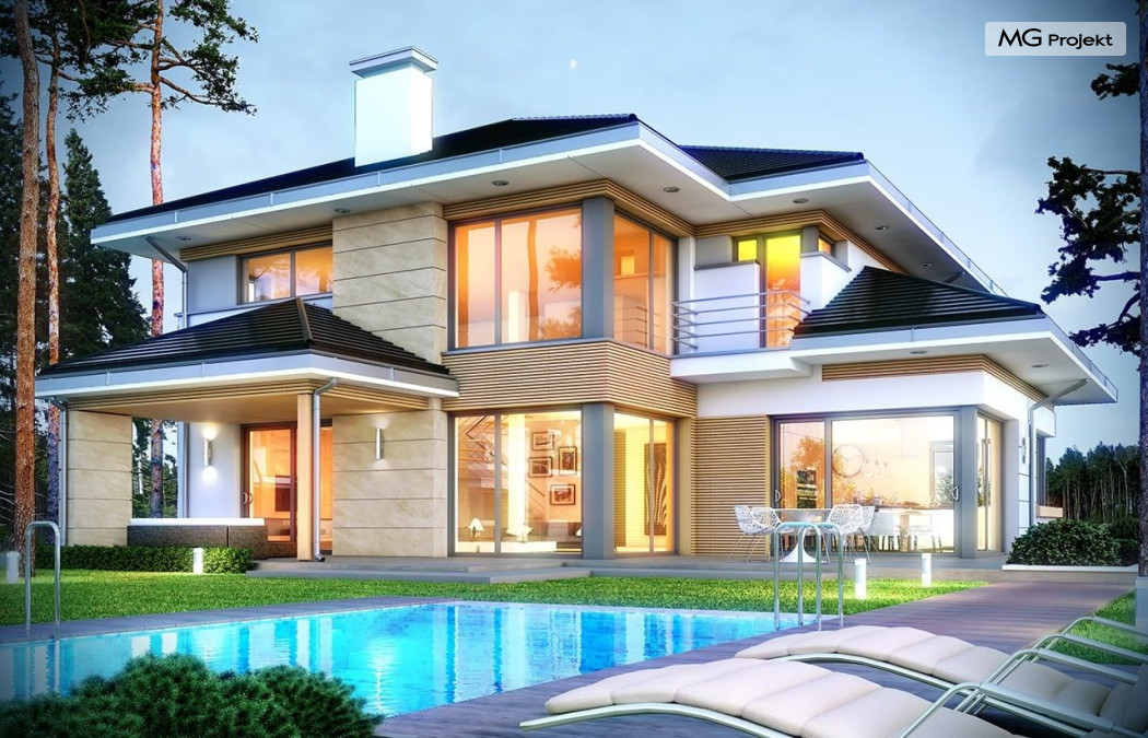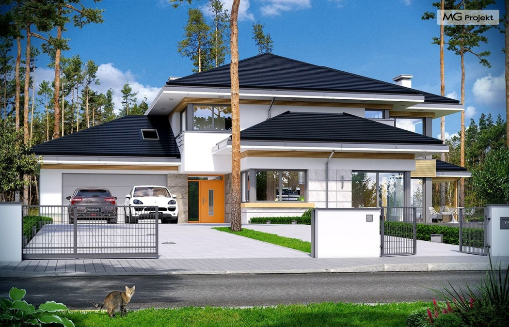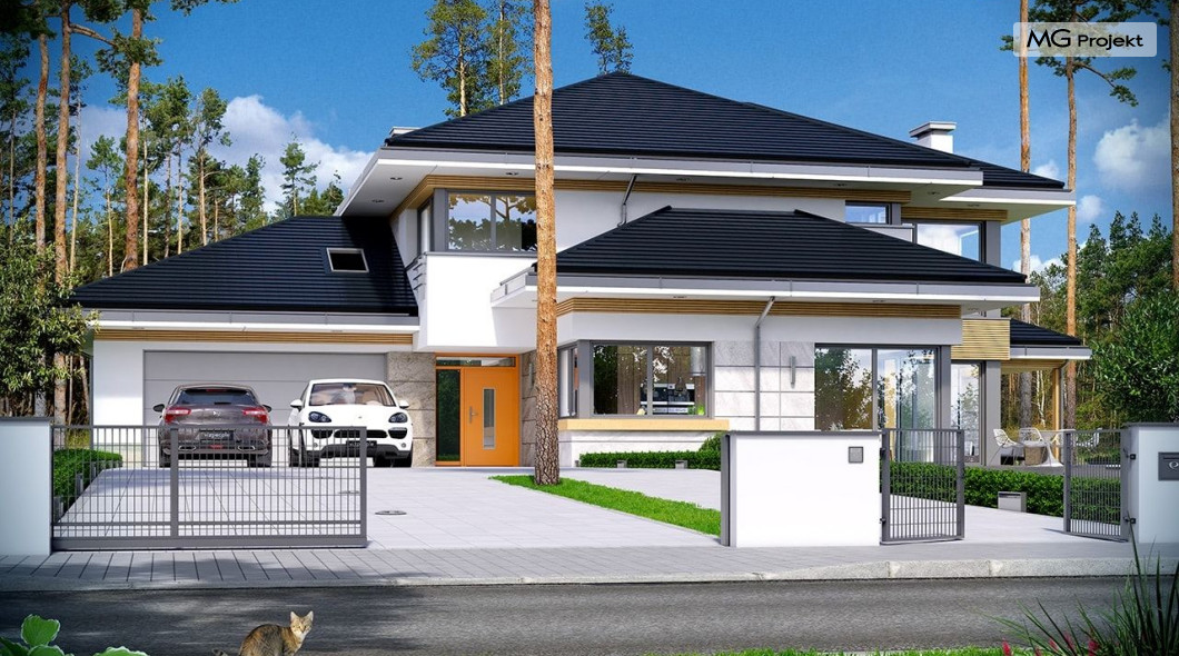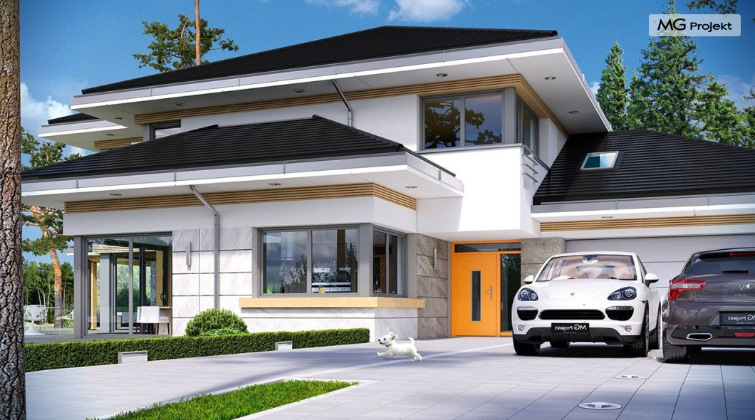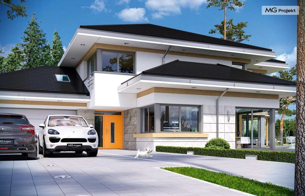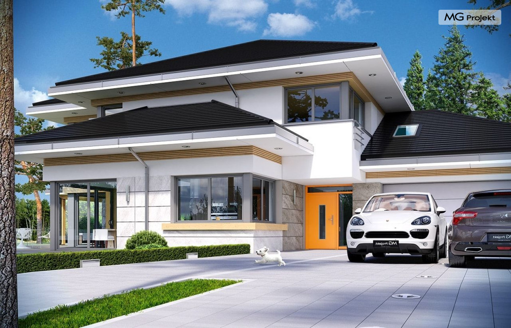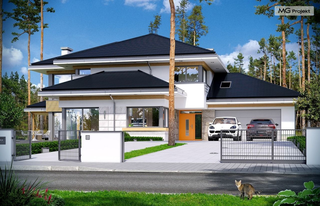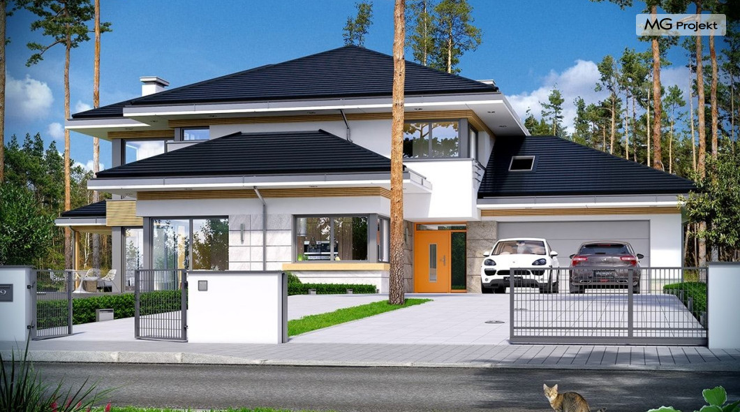 Projekt domu Dom z widokiem 2 jest wariantową pomniejszoną wersją cieszącego się popularnością projektu Dom z widokiem. Dom został nieco zmniejszony w stosunku do swojego pierwowzoru. Powierzchnia została zmniejszona o niecałe 20%. Podobnie koszty realizacji - również udało się ograniczyć o jedną piątą budżetu. Projekt domu Dom z widokiem 2 to nowoczesna miejska willa, o dynamicznej ciekawej architekturze, otwarta na ogród, z mnóstwem atrakcyjnych detali i ciekawą bryłą. Dobrze zestawione ze sobą materiały, detale i kolorystyka tworzą niepowtarzalne wrażenie komfortu, wygody i niezależności. Program użytkowy został nieco okrojony w stosunku do bazowego projektu, ale dom nic nie stracił na swojej funkcjonalności. Jego wnętrze nadal jest pełne przestrzeni. Wchodząc do wnętrza domu czujemy luz i rozkoszujemy się niczym nie ograniczonym komfortem. Na parterze zaprojektowano otwartą część dzienną, z salonem z pustką i otwarciem na antresolę na piętrze, z jadalnią, holem z reprezentacyjnymi schodami, oraz dużą kuchnią z wyspą. Wnętrze przedziela prostopadłościan spiżarni i zabudowy kuchennej. Do domu wchodzimy przez otwarty, przeszklony wiatrołap z szatnią. Na parterze dodatkowo mieści się kotłownia, wc, oraz garaż z pomieszczeniem magazynowo-gospodarczym. Na piętrze zaprojektowano trzy sypialnie, z oddzielnym apartamentem rodziców z własną łazienką i garderobą, ogólnodostępną łazienkę, oraz strych - pralnię/suszarnię, lub po prostu magazyn, albo dodatkowy pokój. Dom z widokiem 2 jest energooszczędny - zastosowano w nim bardzo dobre ocieplenia i instalacje. Łatwo można projekt dostosować do standardu NF40. Budynek ma zwartą bryłę. Jest nieco tańszy w realizacji od projektu bazowego. Zapraszamy do zapoznania się z pełną ofertą pracowni MG Projekt tej serii: Dom z widokiem, Dom z widokiem 2, Dom z widokiem 2C, Dom z widokiem 3, Dom z widokiem 3F, Dom z widokiem 4, Dom z widokiem 5, Dom z widokiem 6, Dom z widokiem 6B, Dom z widokiem B, Dom z widokiem E.