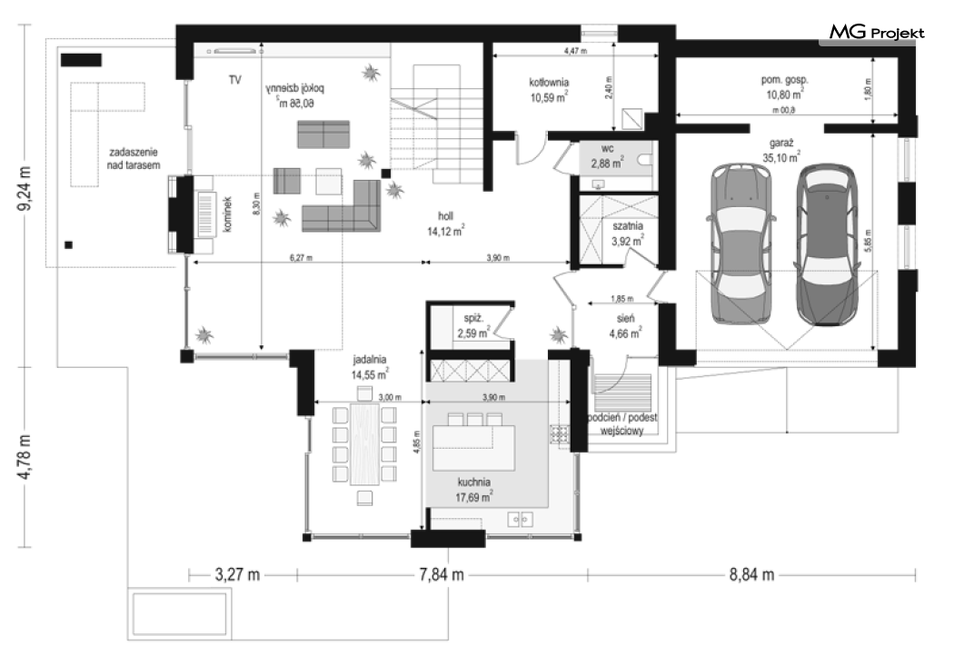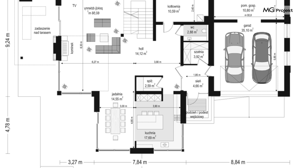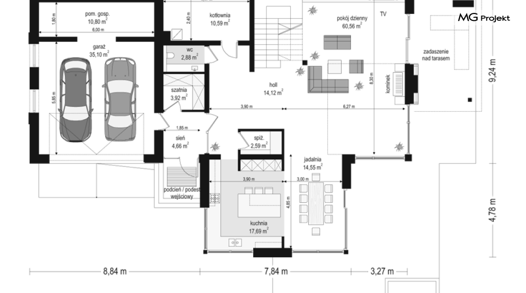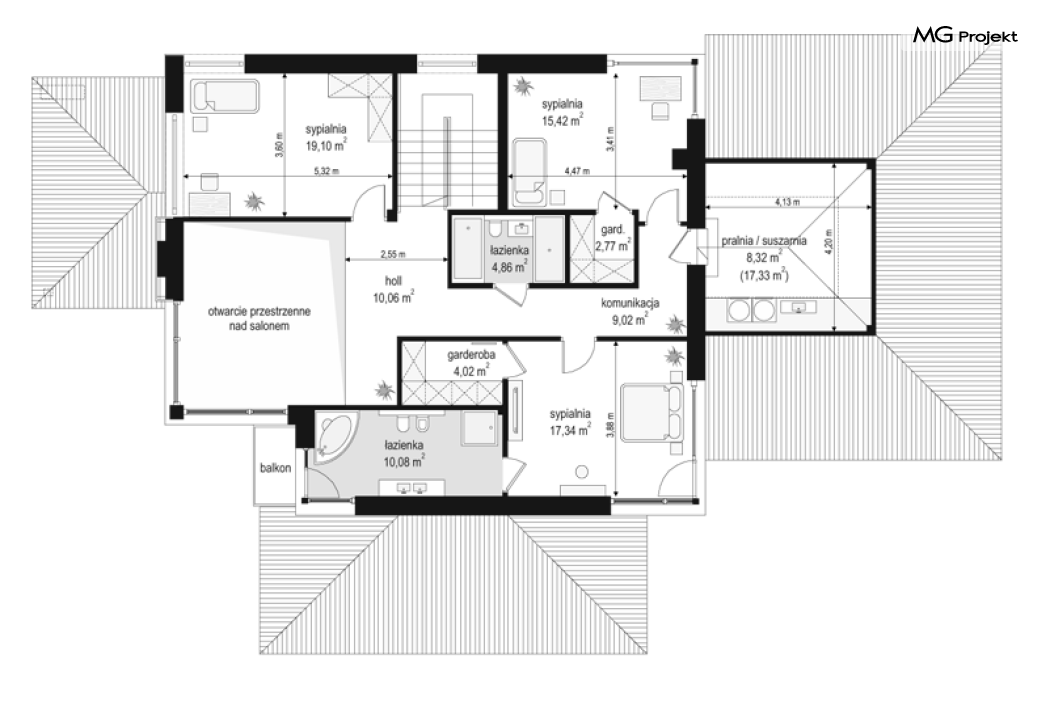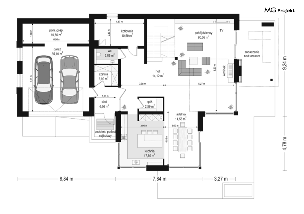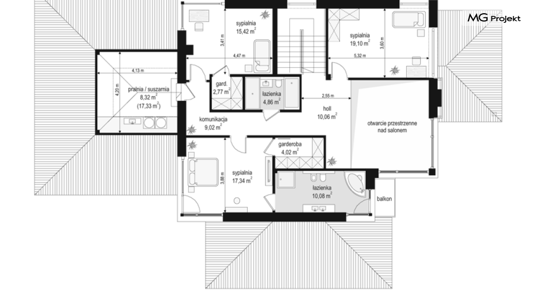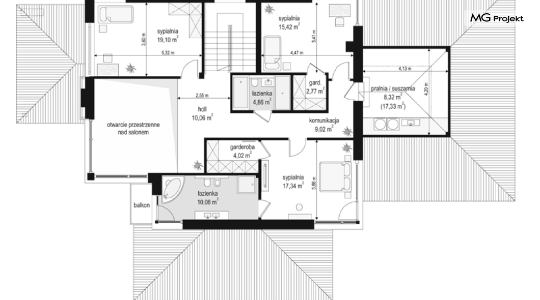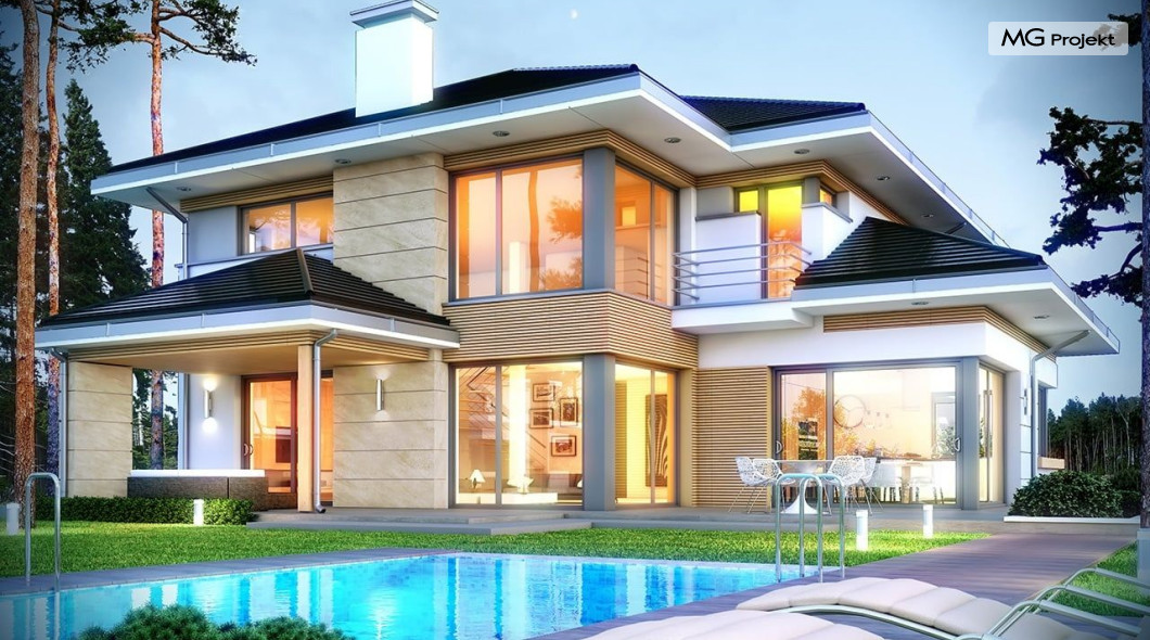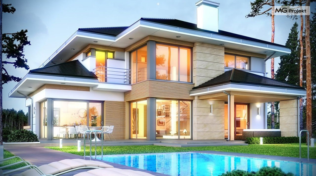 Projekt domu Dom z widokiem 2 jest wariantową pomniejszoną wersją cieszącego się popularnością projektu Dom z widokiem. Dom został nieco zmniejszony w stosunku do swojego pierwowzoru. Powierzchnia została zmniejszona o niecałe 20%. Podobnie koszty realizacji - również udało się ograniczyć o jedną piątą budżetu. Projekt domu Dom z widokiem 2 to nowoczesna miejska willa, o dynamicznej ciekawej architekturze, otwarta na ogród, z mnóstwem atrakcyjnych detali i ciekawą bryłą. Dobrze zestawione ze sobą materiały, detale i kolorystyka tworzą niepowtarzalne wrażenie komfortu, wygody i niezależności. Program użytkowy został nieco okrojony w stosunku do bazowego projektu, ale dom nic nie stracił na swojej funkcjonalności. Jego wnętrze nadal jest pełne przestrzeni. Wchodząc do wnętrza domu czujemy luz i rozkoszujemy się niczym nie ograniczonym komfortem. Na parterze zaprojektowano otwartą część dzienną, z salonem z pustką i otwarciem na antresolę na piętrze, z jadalnią, holem z reprezentacyjnymi schodami, oraz dużą kuchnią z wyspą. Wnętrze przedziela prostopadłościan spiżarni i zabudowy kuchennej. Do domu wchodzimy przez otwarty, przeszklony wiatrołap z szatnią. Na parterze dodatkowo mieści się kotłownia, wc, oraz garaż z pomieszczeniem magazynowo-gospodarczym. Na piętrze zaprojektowano trzy sypialnie, z oddzielnym apartamentem rodziców z własną łazienką i garderobą, ogólnodostępną łazienkę, oraz strych - pralnię/suszarnię, lub po prostu magazyn, albo dodatkowy pokój. Dom z widokiem 2 jest energooszczędny - zastosowano w nim bardzo dobre ocieplenia i instalacje. Łatwo można projekt dostosować do standardu NF40. Budynek ma zwartą bryłę. Jest nieco tańszy w realizacji od projektu bazowego. Zapraszamy do zapoznania się z pełną ofertą pracowni MG Projekt tej serii: Dom z widokiem, Dom z widokiem 2, Dom z widokiem 2C, Dom z widokiem 3, Dom z widokiem 3F, Dom z widokiem 4, Dom z widokiem 5, Dom z widokiem 6, Dom z widokiem 6B, Dom z widokiem B, Dom z widokiem E.