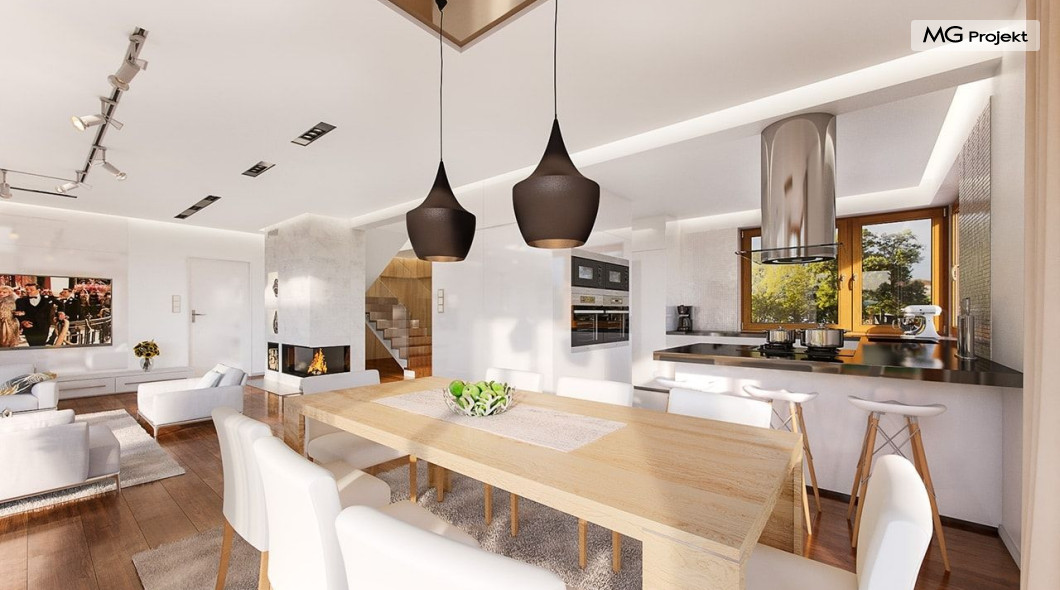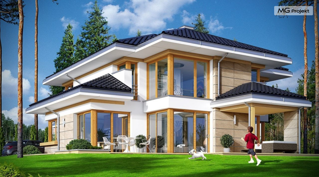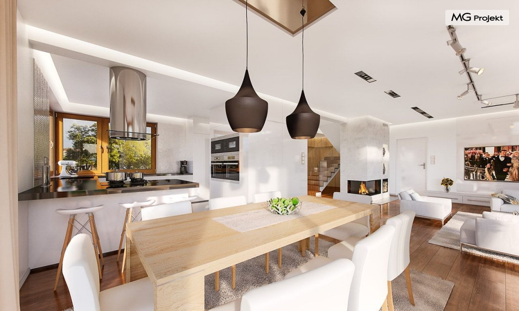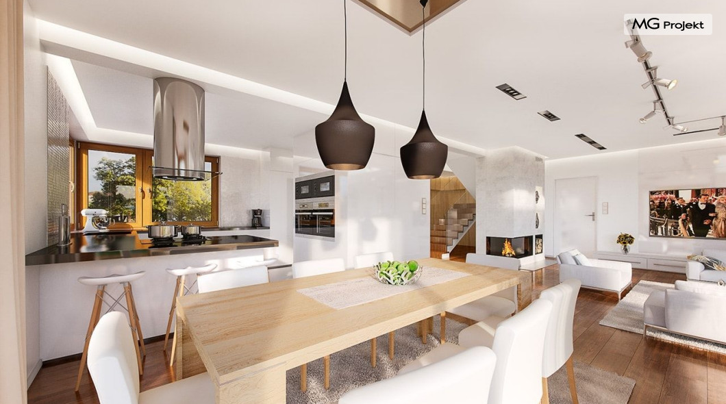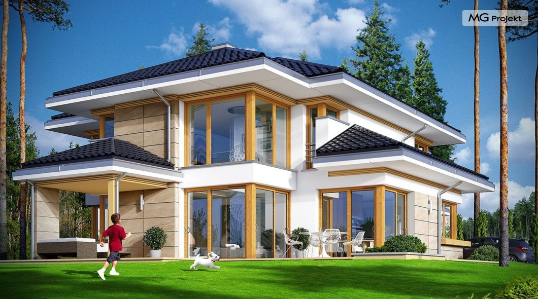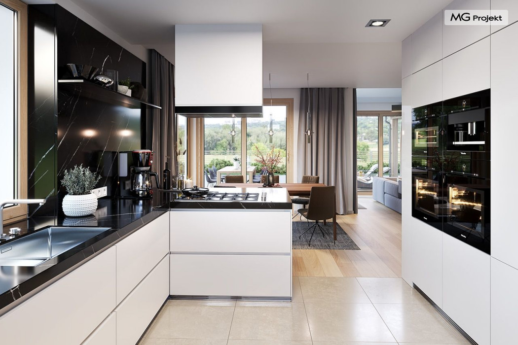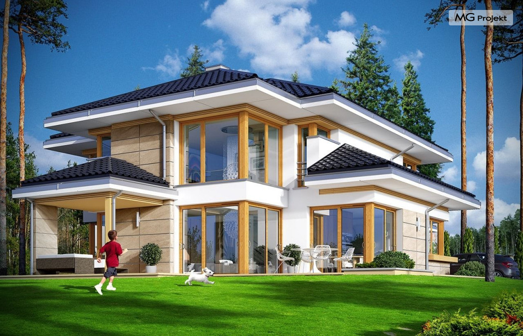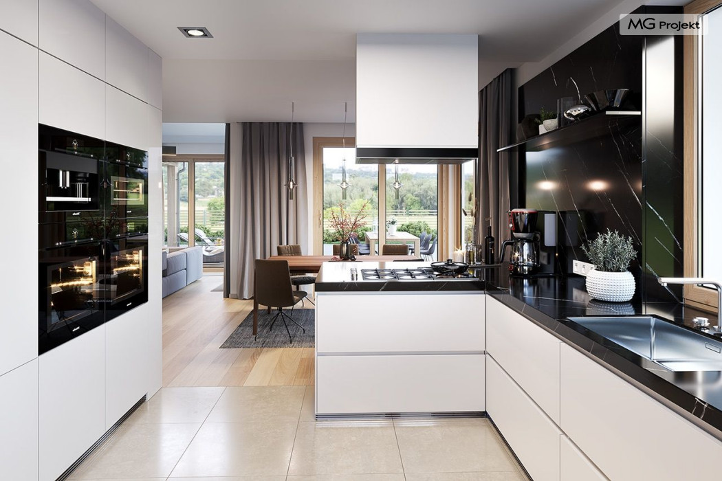 Projekt domu Dom z widokiem 3 jest wariantową wersją popularnego projektu Dom z widokiem. Dom z Widokiem 3 został dość znacznie zmniejszony, jego powierzchnia jest o 30 % mniejsza, podobnie jak koszty realizacji budynku. Jednocześnie dom nie stracił na reprezentacyjnym wyglądzie, ani na programie użytkowym i funkcjonalności wnętrz. Został po prostu "odchudzony" tam, gdzie można było sobie na to pozwolić. W rezultacie powstała elegancka niewielka miejska rezydencja - piętrowa, składająca się z zasadniczej dwukondygnacyjnej i kilku parterowych brył. Projekt domu Dom z widokiem 3 dedykowany jest w szczególności na trudniejsze działki, z niekorzystną orientacją wjazdu w stosunku do nasłonecznienia - z ogrodem z boku lub przodu domu. Architektura domostwa to spokojna nowoczesność, z dopasowanymi harmonijnie materiałami wykończeniowymi i detalami. Jedną z głównych atrakcji jest tutaj piękne okno narożne w salonie i pustka z przestrzennym otwarciem na antresolę na piętrze. To zasadniczy fragment kształtujący całość wnętrza domu. Uzupełnieniem są: przeszklony przestronny przedsionek, częściowo otwarta kuchnia oddzielona prostopadłościenną bryłą spiżarni i zabudowy kuchennej, reprezentacyjne schody połączone ze ścianą kominkową.