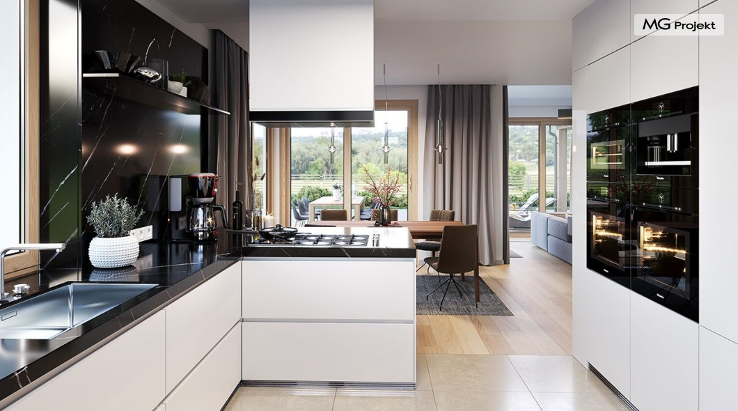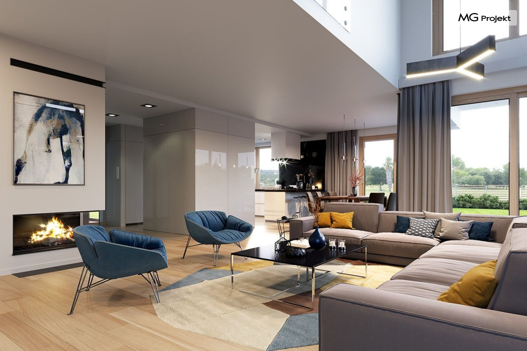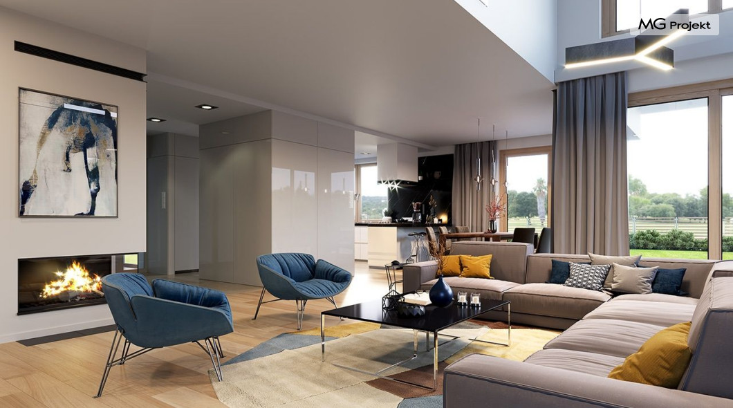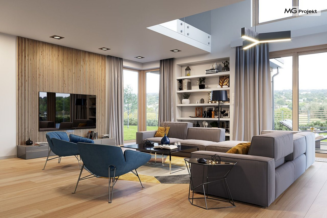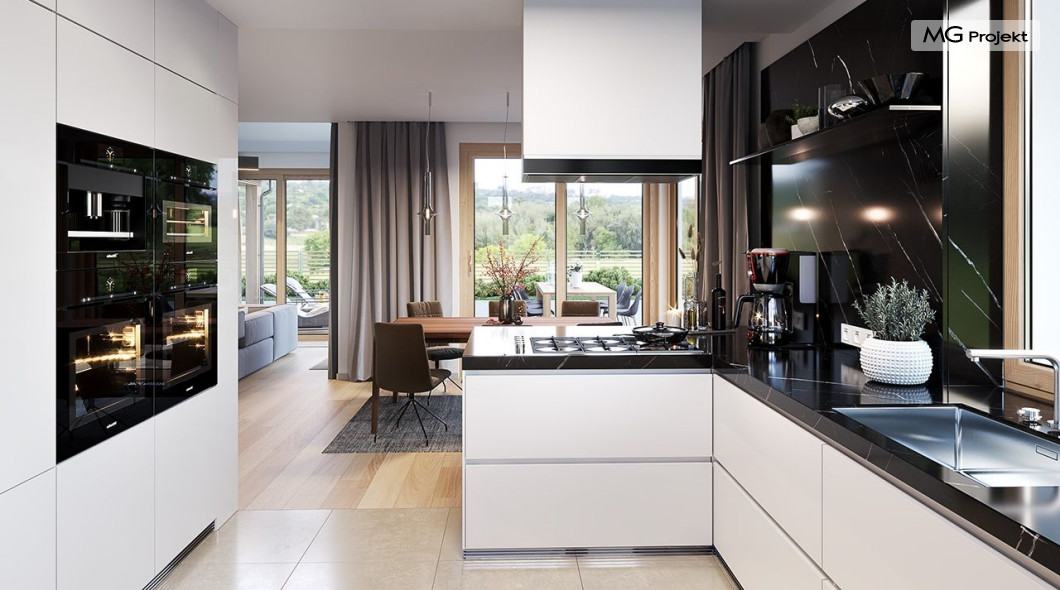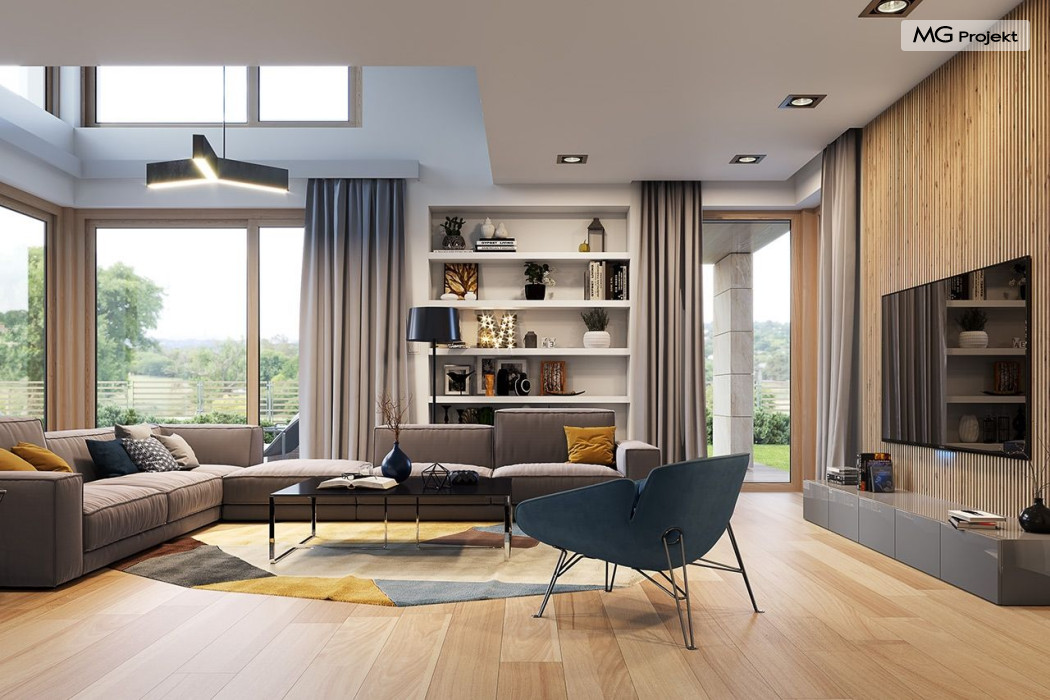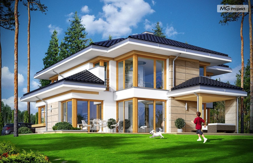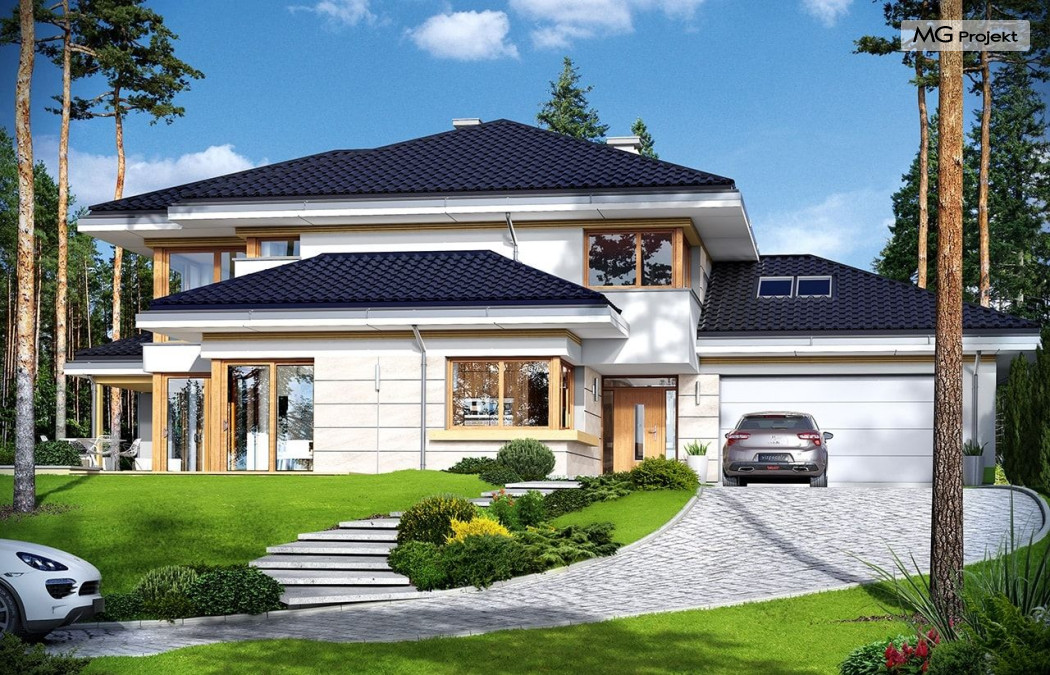 Projekt domu Dom z widokiem 3 jest wariantową wersją popularnego projektu Dom z widokiem. Dom z Widokiem 3 został dość znacznie zmniejszony, jego powierzchnia jest o 30 % mniejsza, podobnie jak koszty realizacji budynku. Jednocześnie dom nie stracił na reprezentacyjnym wyglądzie, ani na programie użytkowym i funkcjonalności wnętrz. Został po prostu "odchudzony" tam, gdzie można było sobie na to pozwolić. W rezultacie powstała elegancka niewielka miejska rezydencja - piętrowa, składająca się z zasadniczej dwukondygnacyjnej i kilku parterowych brył. Projekt domu Dom z widokiem 3 dedykowany jest w szczególności na trudniejsze działki, z niekorzystną orientacją wjazdu w stosunku do nasłonecznienia - z ogrodem z boku lub przodu domu. Architektura domostwa to spokojna nowoczesność, z dopasowanymi harmonijnie materiałami wykończeniowymi i detalami. Jedną z głównych atrakcji jest tutaj piękne okno narożne w salonie i pustka z przestrzennym otwarciem na antresolę na piętrze. To zasadniczy fragment kształtujący całość wnętrza domu. Uzupełnieniem są: przeszklony przestronny przedsionek, częściowo otwarta kuchnia oddzielona prostopadłościenną bryłą spiżarni i zabudowy kuchennej, reprezentacyjne schody połączone ze ścianą kominkową.