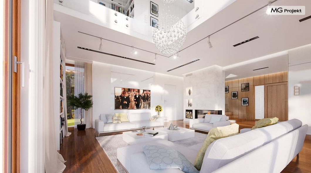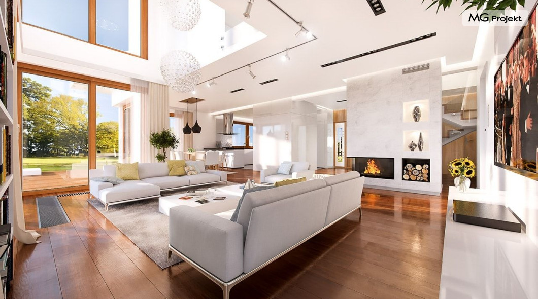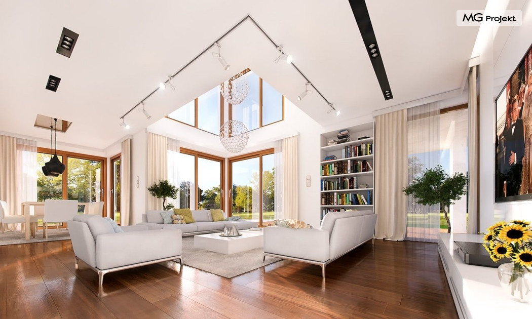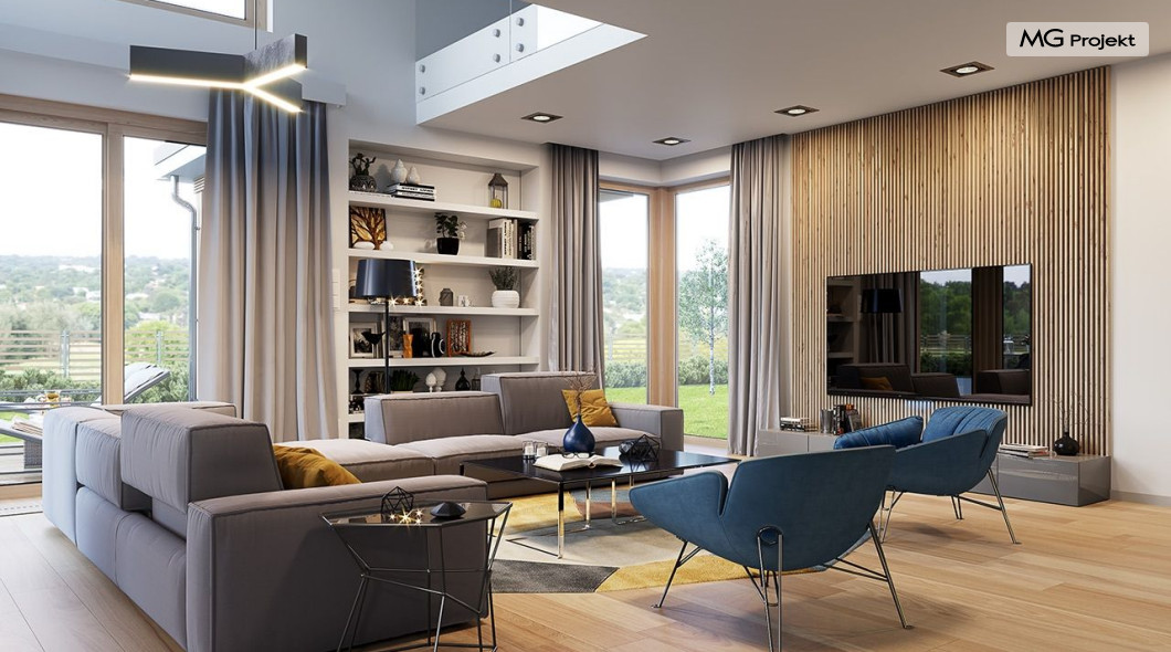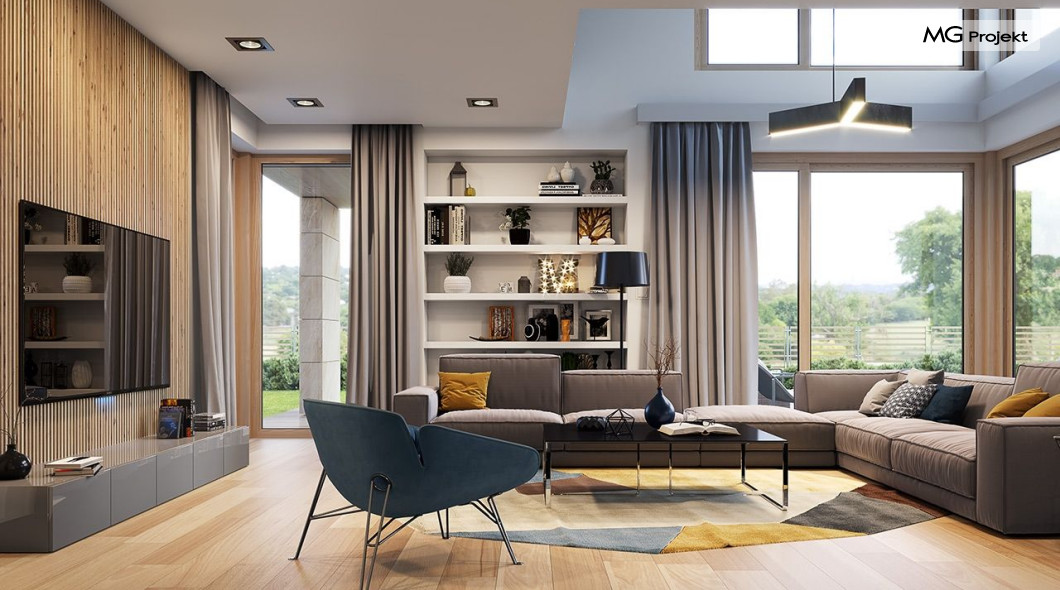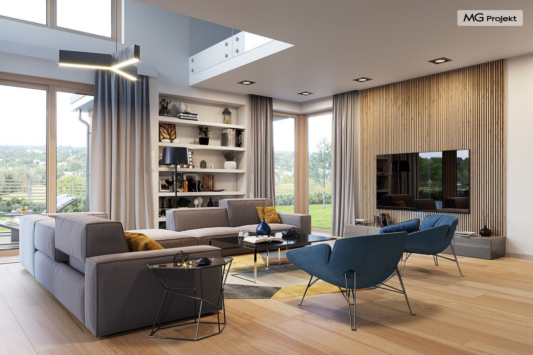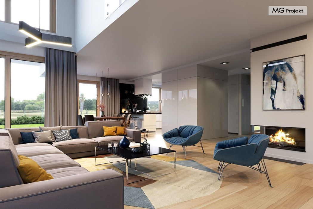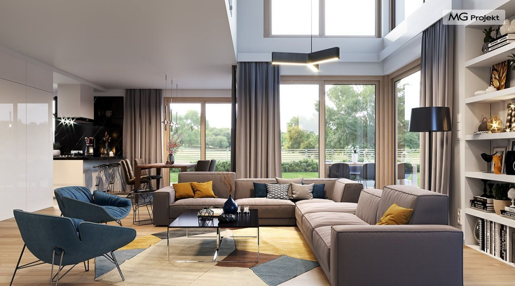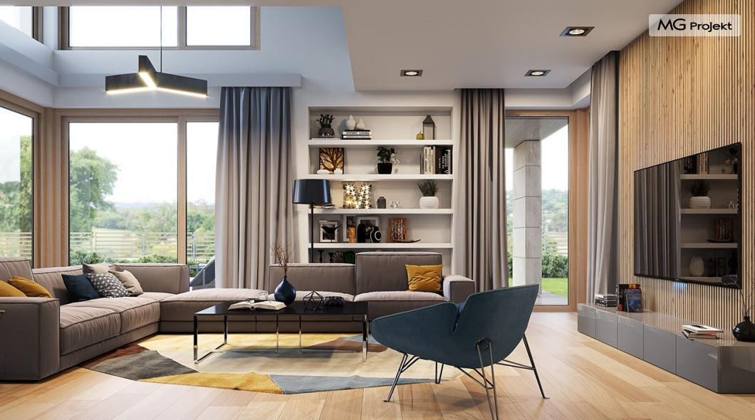 Projekt domu Dom z widokiem 3 jest wariantową wersją popularnego projektu Dom z widokiem. Dom z Widokiem 3 został dość znacznie zmniejszony, jego powierzchnia jest o 30 % mniejsza, podobnie jak koszty realizacji budynku. Jednocześnie dom nie stracił na reprezentacyjnym wyglądzie, ani na programie użytkowym i funkcjonalności wnętrz. Został po prostu "odchudzony" tam, gdzie można było sobie na to pozwolić. W rezultacie powstała elegancka niewielka miejska rezydencja - piętrowa, składająca się z zasadniczej dwukondygnacyjnej i kilku parterowych brył. Projekt domu Dom z widokiem 3 dedykowany jest w szczególności na trudniejsze działki, z niekorzystną orientacją wjazdu w stosunku do nasłonecznienia - z ogrodem z boku lub przodu domu. Architektura domostwa to spokojna nowoczesność, z dopasowanymi harmonijnie materiałami wykończeniowymi i detalami. Jedną z głównych atrakcji jest tutaj piękne okno narożne w salonie i pustka z przestrzennym otwarciem na antresolę na piętrze. To zasadniczy fragment kształtujący całość wnętrza domu. Uzupełnieniem są: przeszklony przestronny przedsionek, częściowo otwarta kuchnia oddzielona prostopadłościenną bryłą spiżarni i zabudowy kuchennej, reprezentacyjne schody połączone ze ścianą kominkową.