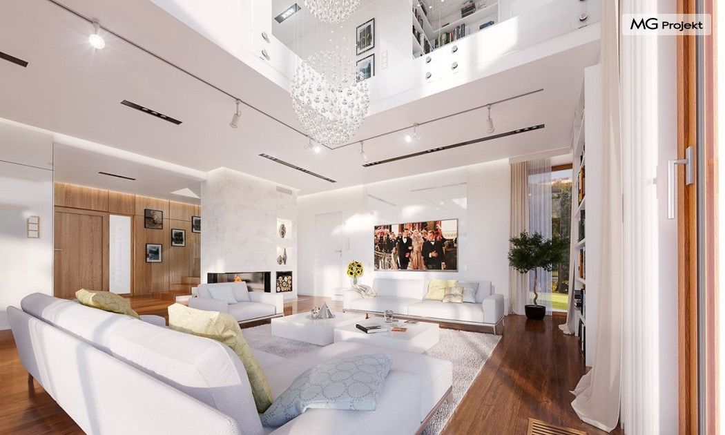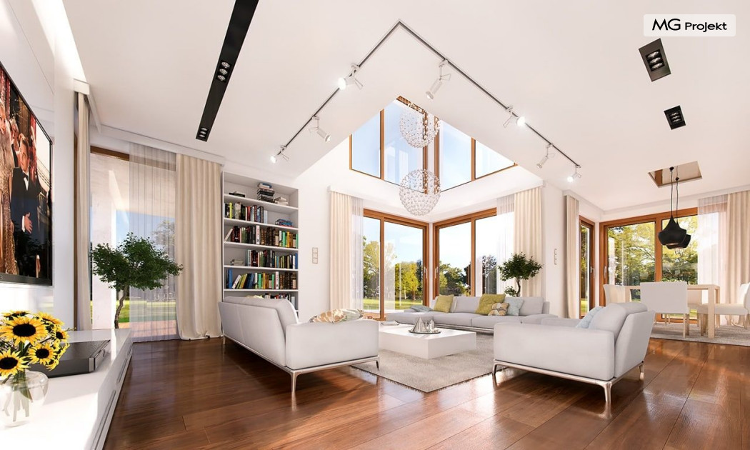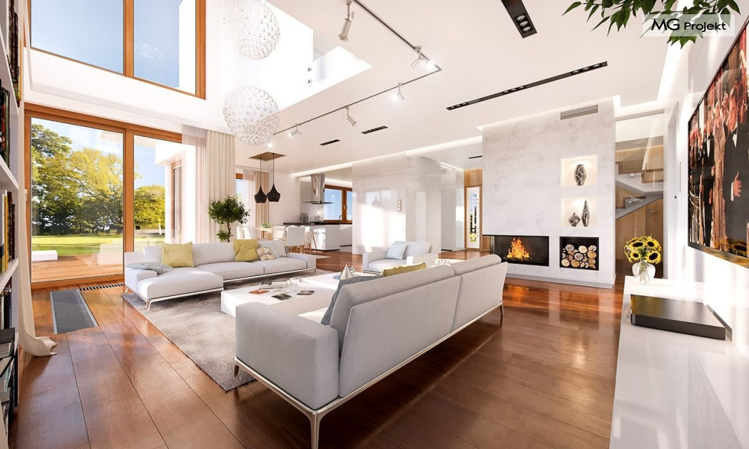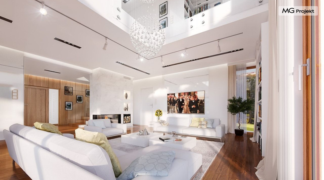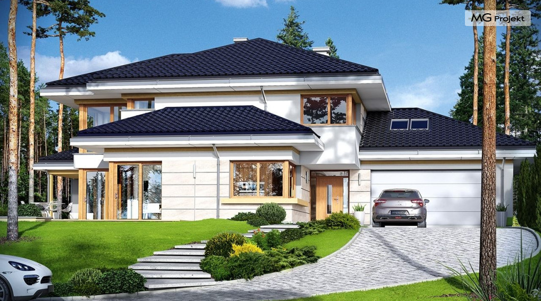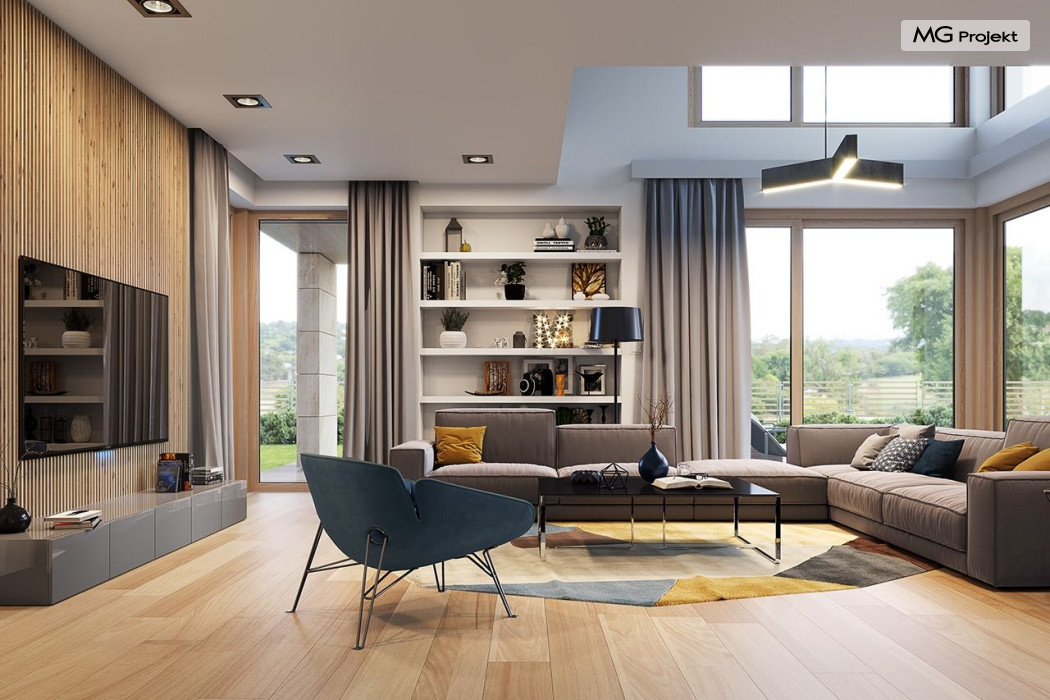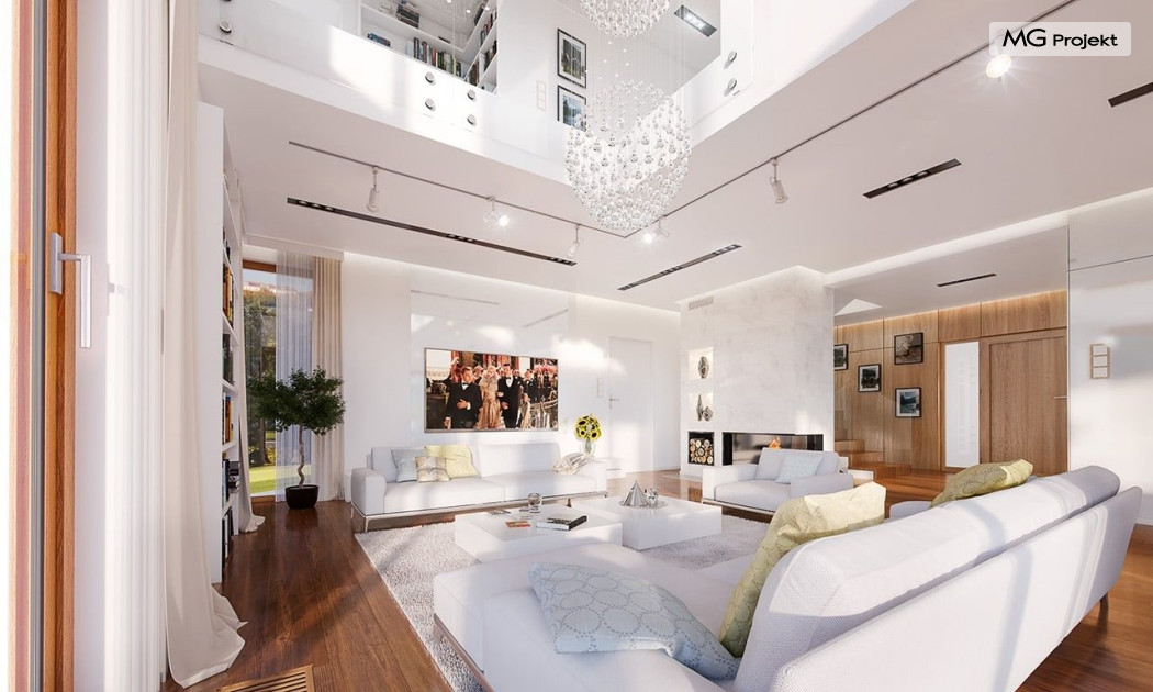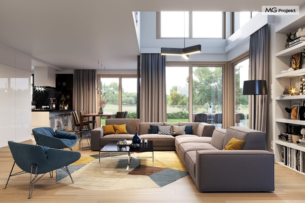Projekt domu Dom z widokiem 3 jest wariantową wersją popularnego projektu Dom z widokiem. Dom z Widokiem 3 został dość znacznie zmniejszony, jego powierzchnia jest o 30 % mniejsza, podobnie jak koszty realizacji budynku. Jednocześnie dom nie stracił na reprezentacyjnym wyglądzie, ani na programie użytkowym i funkcjonalności wnętrz. Został po prostu "odchudzony" tam, gdzie można było sobie na to pozwolić. W rezultacie powstała elegancka niewielka miejska rezydencja - piętrowa, składająca się z zasadniczej dwukondygnacyjnej i kilku parterowych brył. Projekt domu Dom z widokiem 3 dedykowany jest w szczególności na trudniejsze działki, z niekorzystną orientacją wjazdu w stosunku do nasłonecznienia - z ogrodem z boku lub przodu domu. Architektura domostwa to spokojna nowoczesność, z dopasowanymi harmonijnie materiałami wykończeniowymi i detalami. Jedną z głównych atrakcji jest tutaj piękne okno narożne w salonie i pustka z przestrzennym otwarciem na antresolę na piętrze. To zasadniczy fragment kształtujący całość wnętrza domu. Uzupełnieniem są: przeszklony przestronny przedsionek, częściowo otwarta kuchnia oddzielona prostopadłościenną bryłą spiżarni i zabudowy kuchennej, reprezentacyjne schody połączone ze ścianą kominkową.