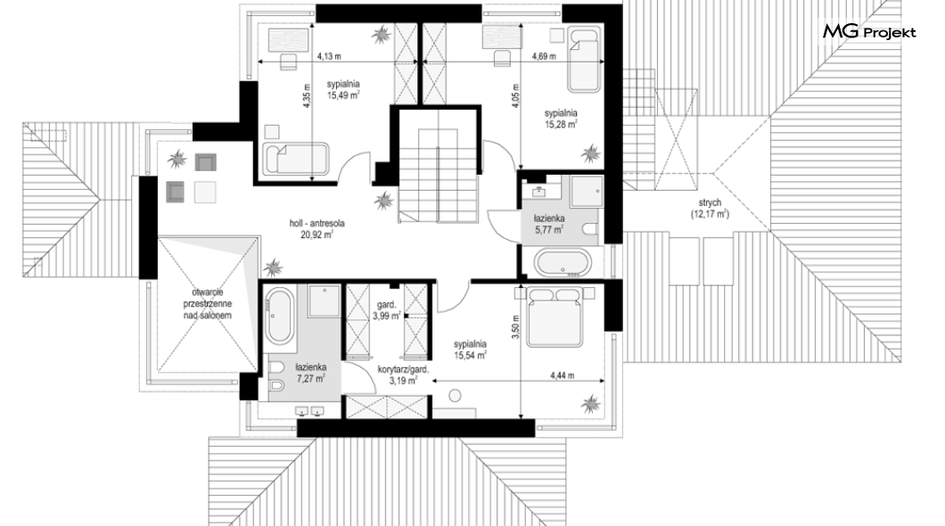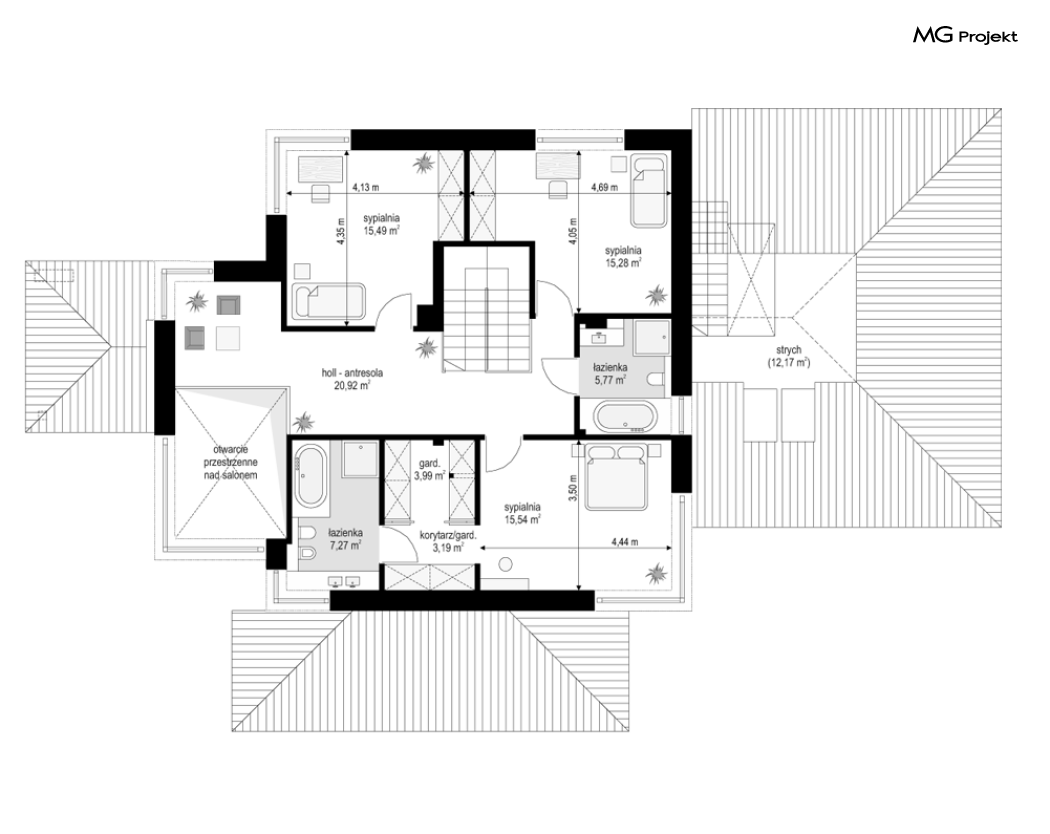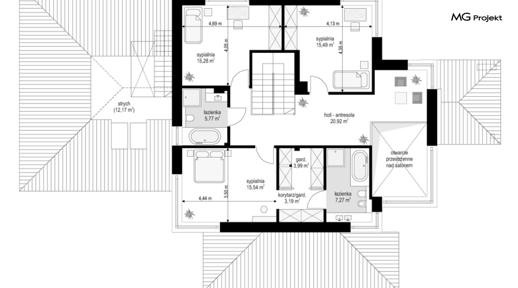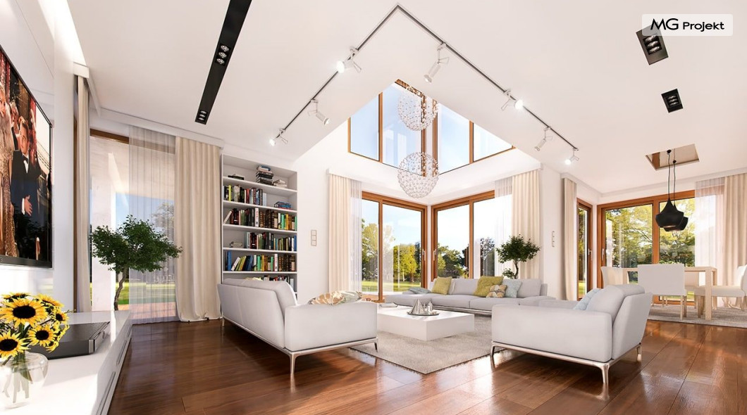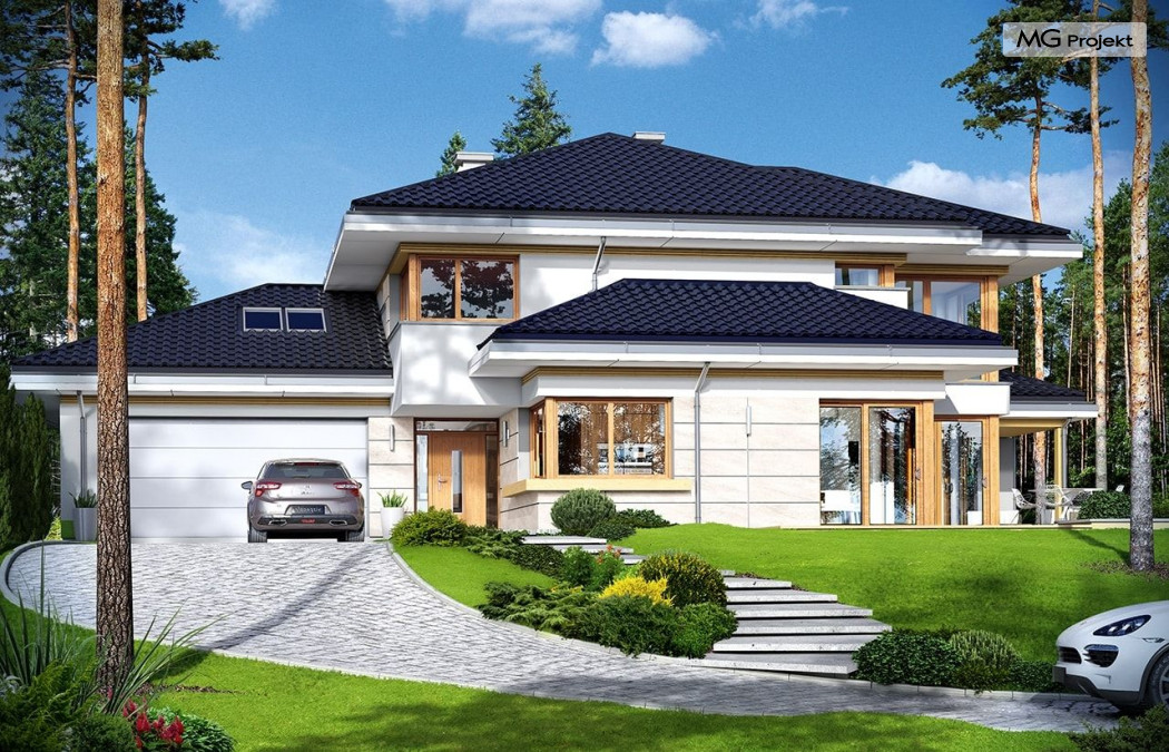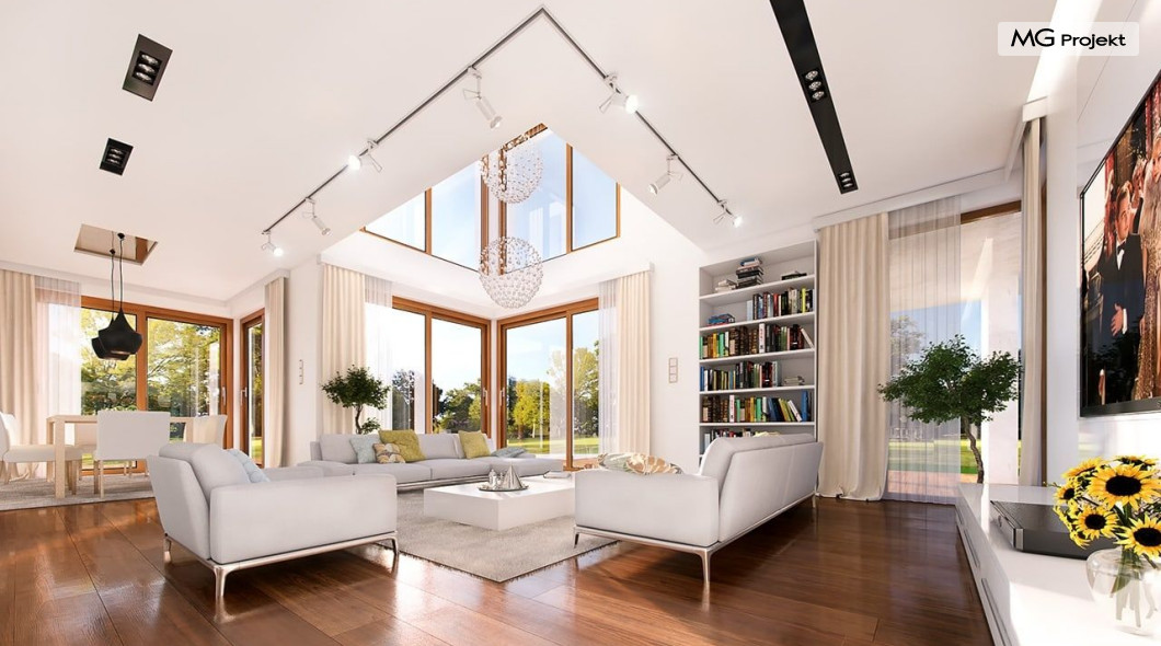 Parter Domu z Widokiem to także jadalnia, dodatkowy pokój (gabinet, lub sypialnia gościnna), łazienka, kotłownia i garaż, z dodatkową przestrzenią magazynowo-gospodarczą i własnym strychem. Na piętrze przewidziano trzy sypialnie, w tym apartament rodziców z własną oddzielną łazienką i garderobą, ogólnodostępną łazienkę i antresolę - bibliotekę. We wnętrzu przewidziano wszystko, co może być potrzebne do komfortowego życia 4-5 domownikom. Dom z widokiem 3, tak jak pozostałe projekty domów z serwii, dzięki tarasom i podcieniowi, pięknie łączy się z otaczającym ogrodem. Duże przeszklenia dodatkowo otwierają budynek na otaczającą przyrodę. Dom został zaprojektowany jako energooszczędny (bardzo łatwo zaadaptować go do standardu NF40). Stosunek powierzchni do uzyskanego efektu jest w projekcie bardzo korzystny. Projekt domu Dom z widokiem 3 będzie niedrogi w eksploatacji, a sama budowa będzie zdecydowanie mniej kosztowna niż w przypadku pierwszego projektu. Pracownia oferuje też wersję domku w odbiciu lustrzanym, wariant projektu głębszy o 100+120 cm, ze zmienionym układem pomieszczeń na parterze i piętrze, pompą ciepła oraz dostosowaniem do NF40 (Dom z Widokiem 3 wariant B). Zapraszamy do zapoznania się z pełną ofertą pracowni MG Projekt tej serii: Dom z widokiem, Dom z widokiem 2, Dom z widokiem 2C, , Dom z widokiem 3F, Dom z widokiem 4, Dom z widokiem 5, Dom z widokiem 6, Dom z widokiem 6B, Dom z widokiem B, Dom z widokiem E