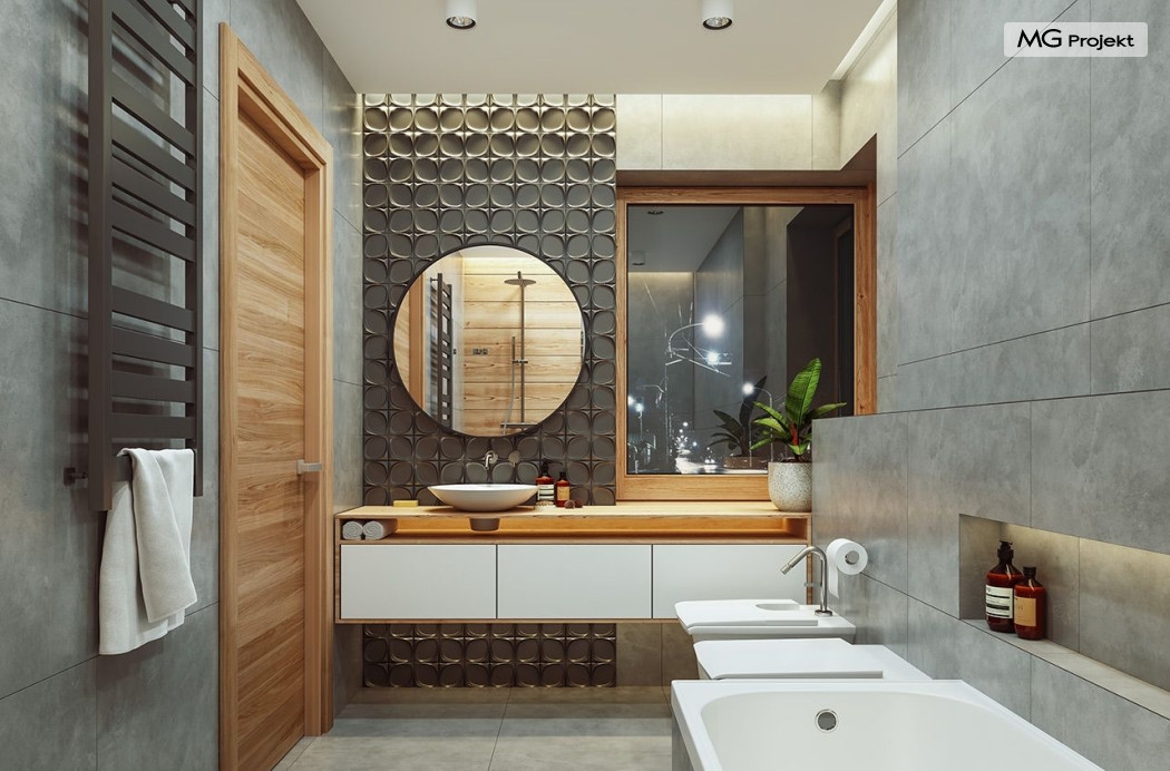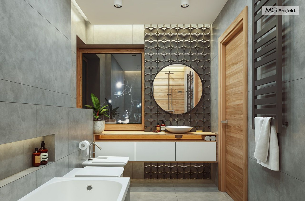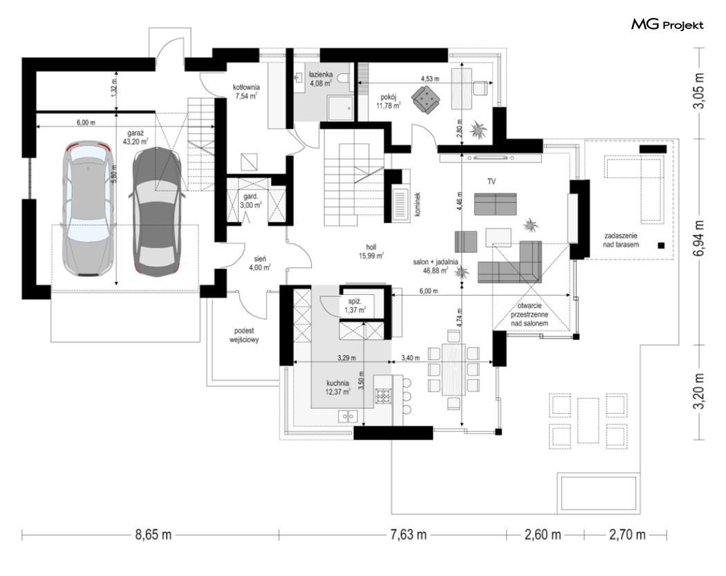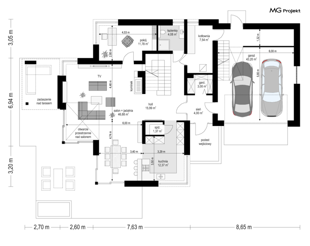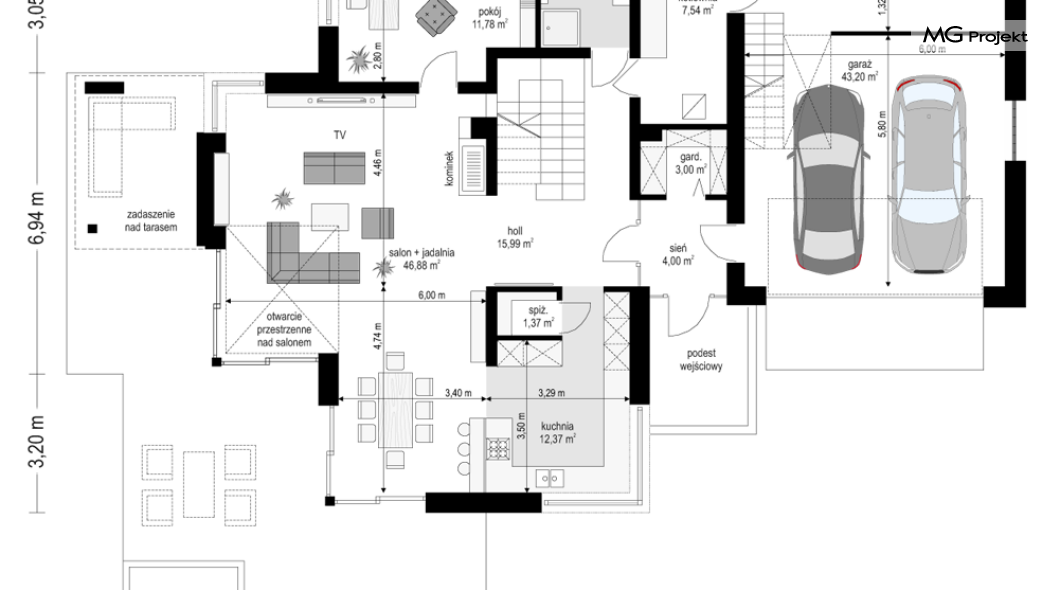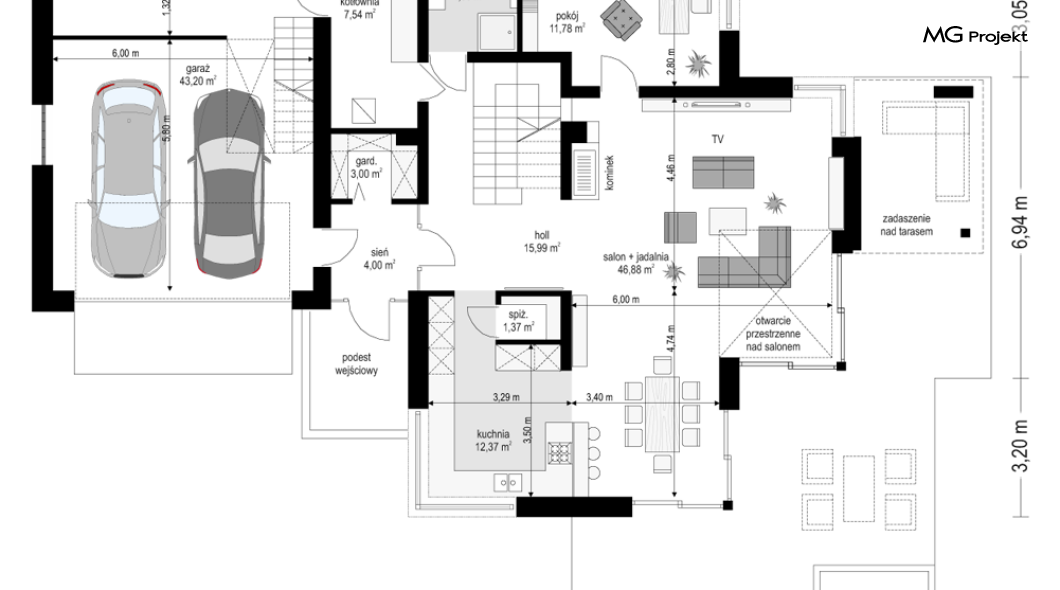 Parter Domu z Widokiem to także jadalnia, dodatkowy pokój (gabinet, lub sypialnia gościnna), łazienka, kotłownia i garaż, z dodatkową przestrzenią magazynowo-gospodarczą i własnym strychem. Na piętrze przewidziano trzy sypialnie, w tym apartament rodziców z własną oddzielną łazienką i garderobą, ogólnodostępną łazienkę i antresolę - bibliotekę. We wnętrzu przewidziano wszystko, co może być potrzebne do komfortowego życia 4-5 domownikom. Dom z widokiem 3, tak jak pozostałe projekty domów z serwii, dzięki tarasom i podcieniowi, pięknie łączy się z otaczającym ogrodem. Duże przeszklenia dodatkowo otwierają budynek na otaczającą przyrodę. Dom został zaprojektowany jako energooszczędny (bardzo łatwo zaadaptować go do standardu NF40). Stosunek powierzchni do uzyskanego efektu jest w projekcie bardzo korzystny. Projekt domu Dom z widokiem 3 będzie niedrogi w eksploatacji, a sama budowa będzie zdecydowanie mniej kosztowna niż w przypadku pierwszego projektu. Pracownia oferuje też wersję domku w odbiciu lustrzanym, wariant projektu głębszy o 100+120 cm, ze zmienionym układem pomieszczeń na parterze i piętrze, pompą ciepła oraz dostosowaniem do NF40 (Dom z Widokiem 3 wariant B). Zapraszamy do zapoznania się z pełną ofertą pracowni MG Projekt tej serii: Dom z widokiem, Dom z widokiem 2, Dom z widokiem 2C, , Dom z widokiem 3F, Dom z widokiem 4, Dom z widokiem 5, Dom z widokiem 6, Dom z widokiem 6B, Dom z widokiem B, Dom z widokiem E