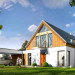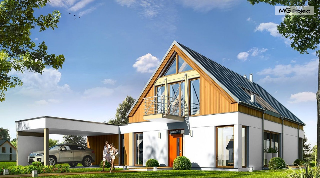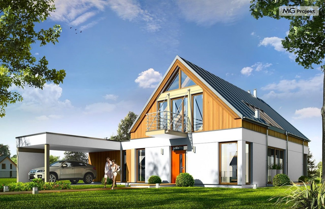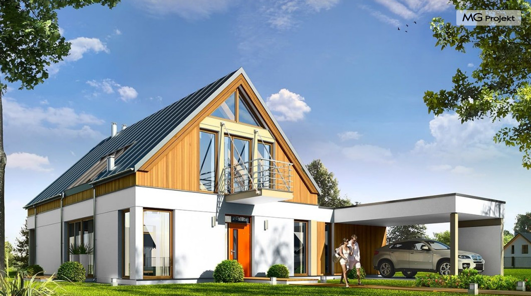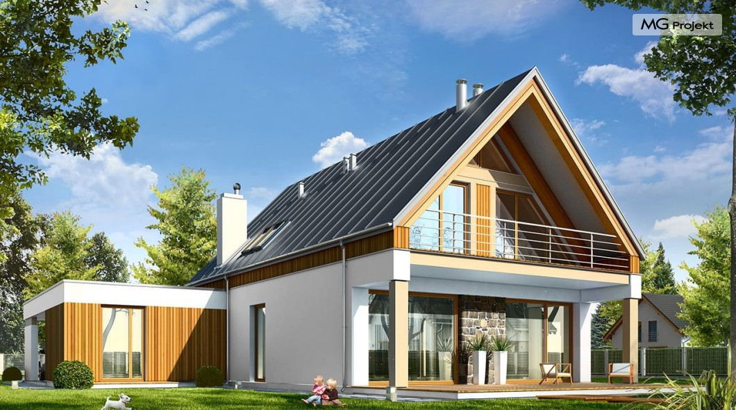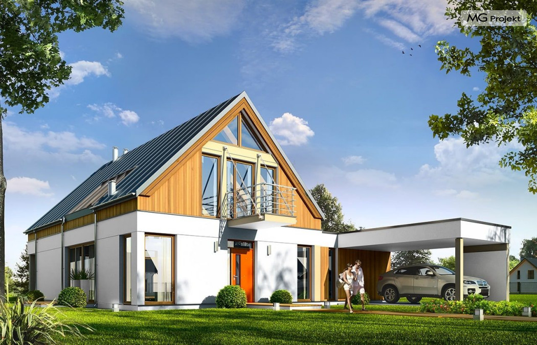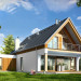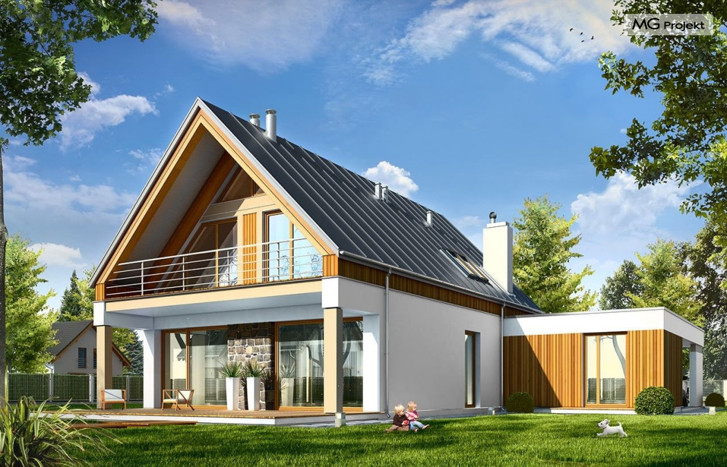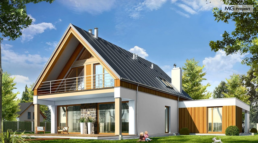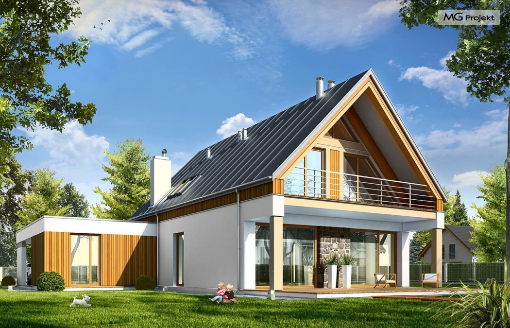 Projekt domu Domino to wyjątkowy dom jednorodzinny, o ciekawej, nietuzinkowej architekturze. Zarówno jego forma architektoniczna, układ brył, detale wykończeniowe i zastosowane materiały - czynią z niego budynek oryginalny i niepowtarzalny. Nowoczesna stylistyka idzie tutaj w parze z funkcjonalnością, oraz z energooszczędnością budynku. Głównym założeniem projektu było uzyskanie prostej bryły przykrytej dwuspadowym dachem z minimalnymi okapami i zaplanowanie wnętrz domu na osi wzdłuż kalenicy - od wejścia, do ściany ogrodowej salonu, z dużymi przeszkleniami i centralnie umieszczonym kominkiem. Frontowy „balkon-mostek”, będący jednocześnie zadaszeniem nad wejściem, oraz wyciągnięty dach nad tarasem od strony ogrodu, powiększają efekt wizualny wydłużenia budynku. Uzupełnienie i przełamanie kompozycji stanowi dobudowana z boku parterowa bryła z płaskim dachem, kryjąca wiatę garażową i dodatkowy pokój. Wnętrze domu zaplanowano w taki sposób, aby maksymalnie uatrakcyjnić przestrzeń dzienną. Mamy tutaj : jednobiegowe nowoczesne schody połączone z pustką nad jadalnią, jadalnię z pięknym przeszkleniami i świetlikiem w dachu, salon z dużymi przeszkleniami na zadaszony taras i ogród, oraz centralnie ustawionym kominkiem, holl i częściowo otwartą kuchnię. Na parterze mamy aż dwa dodatkowe pokoje, łazienkę i kotłownię. Na poddaszu z kolei przewidziano trzy sypialnie, łazienkę i garderobę rodziców. Zarówno wnętrze jak i wygląd zewnętrzny domu zaprojektowano z myślą o Inwestorach lubiących ciekawe, nietuzinkowe rozwiązania i nowoczesną architekturę. Dom jest przy tym łatwy w budowie, ma prostą konstrukcję. Projekt domu Domino dzięki swojej prostocie i zwartości, oraz świetnym izolacjom jest też energooszczędny i będzie niedrogi w utrzymaniu ( można go łatwo dostosować do standardu NF40 ). Zapraszamy !