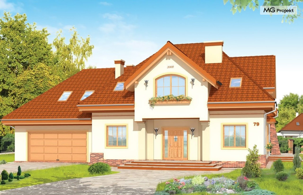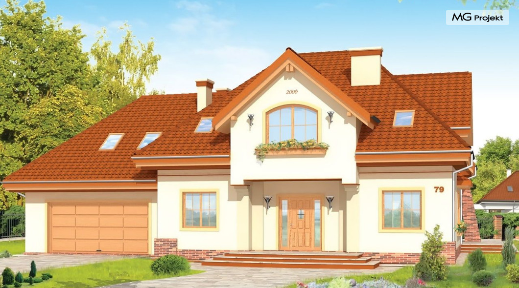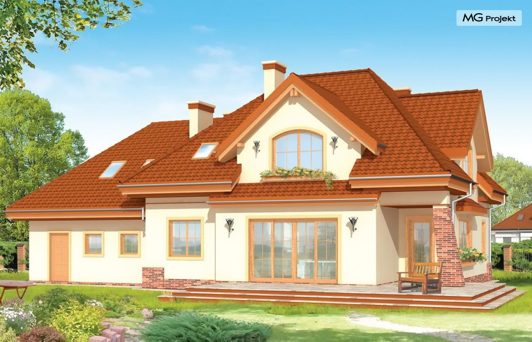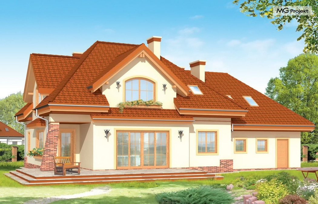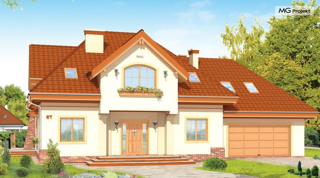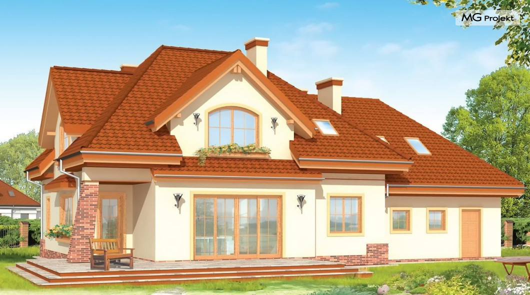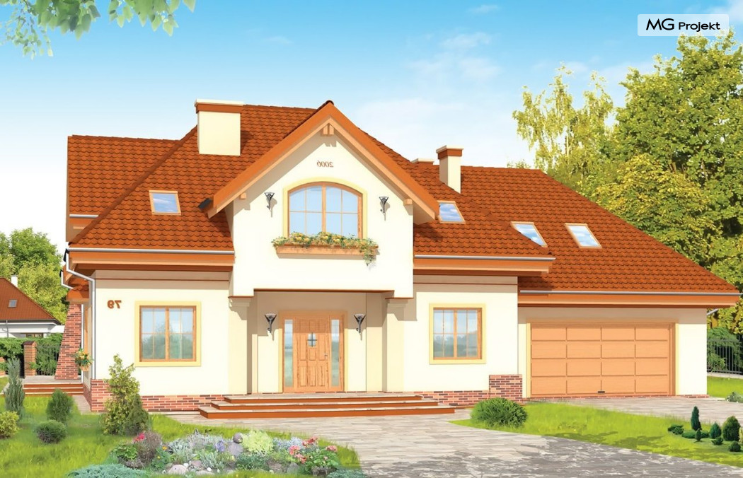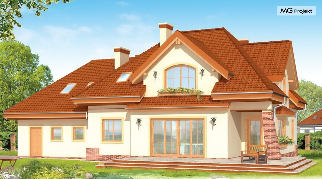 Projekt domu Edyta to wygodny domek jednorodzinny dla rodziny 4-5 osobowej. Posiada rozbudowaną częścią garażową ze strychem, która może być wykończona w późniejszym etapie. Budynek zaprojektowano na planie prostokąta przekrytego wielospadowym dachem z dużymi lukarnami. Do domu Edyta dobudowana jest część garażowa, z dużym strychem do dowolnego wykorzystania. Architektura domu jest tradycyjna, ale zawiera też elementy nowoczesne, takie jak duże przeszklenia salonu, czy finezyjna podpora podcienia. Wnętrze: na parterze zaprojektowano salon z jadalnią i częściowo otwartą kuchnią, holl z ozdobnymi schodami, dodatkowy pokój i duże zaplecze gospodarcze, z dużym garażem i kotłownią. Na poddaszu zaplanowano trzy sypialnie, w tym jedna z własną łazienką i garderobą. Strych można wykorzystać np. na domową siłownię i saunę. Projekt domu Edyta dostępny jest również w wersji odbicia lustrzanego.