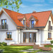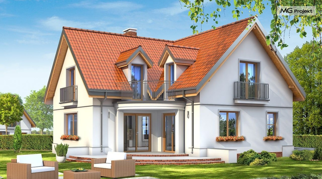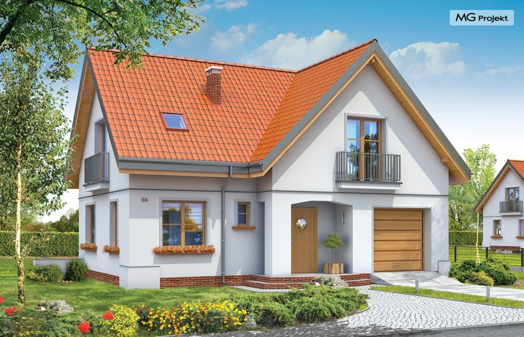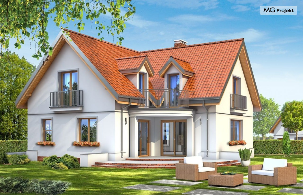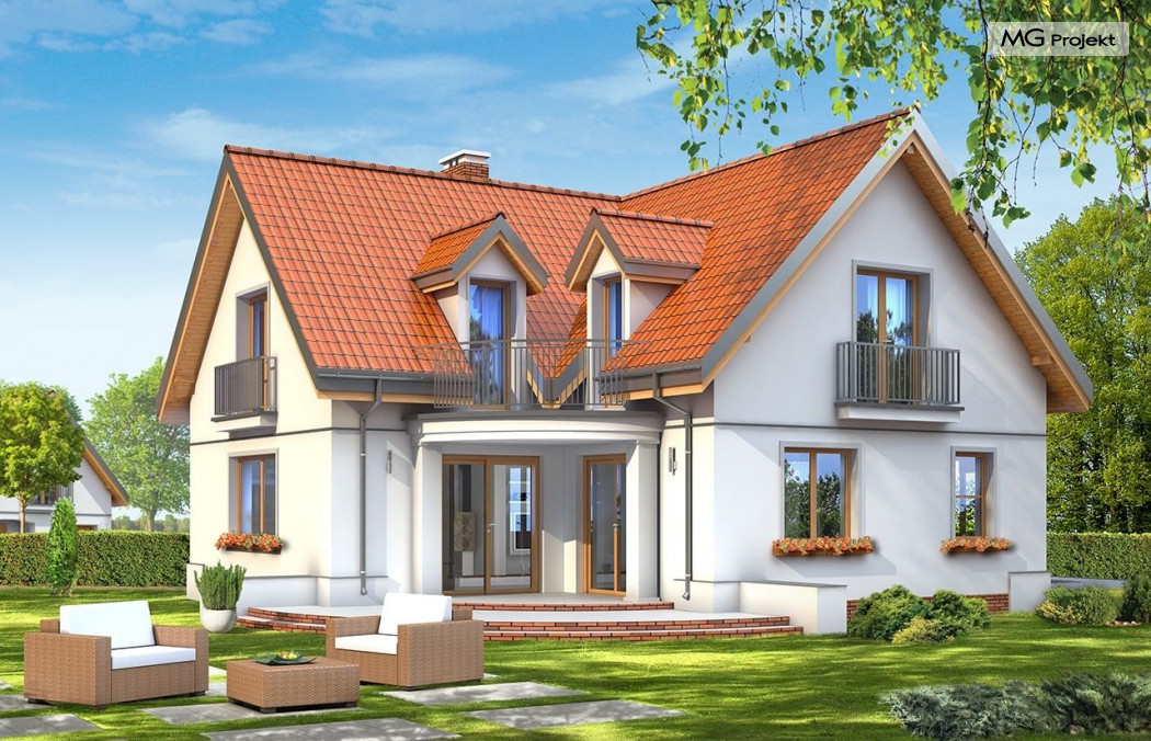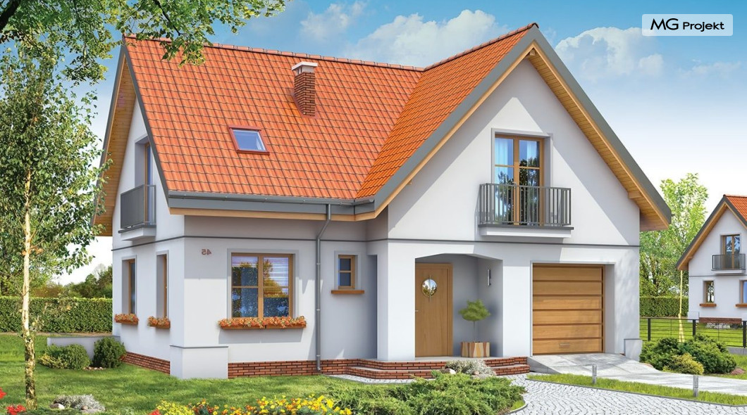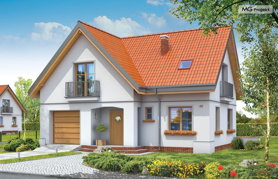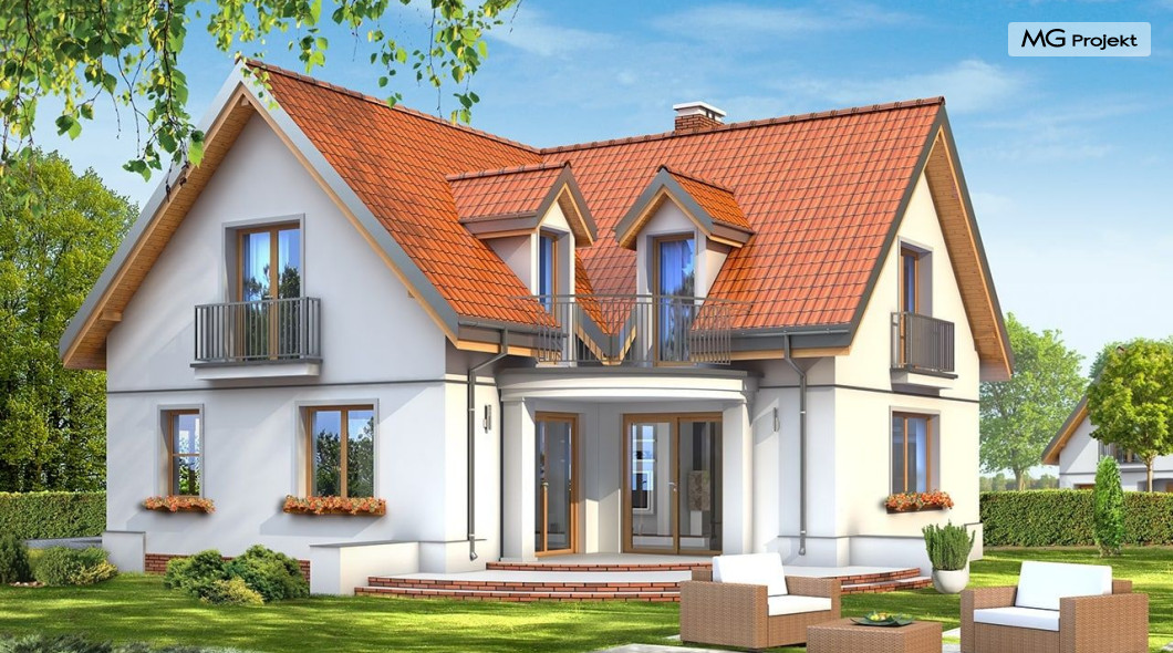 Projekt domu Elka to budynek jednorodzinny przewidziany dla rodziny cztero-pięcioosobowej. Projekt domu Elka to parterowy budynek z poddaszem użytkowym, z wbudowanym w bryłę garażem jednostanowiskowym. Dom ma rzut w kształcie litery "L" i przykryty jest dwuspadowymi symetrycznymi dachami. Bryła budynku tworzy intymny zakątek tarasowy od strony ogrodu - częściowo zadaszony. Tradycyjna forma domu w połączeniu z oszczędnym współczesnym detalem tworzą spójne, bardzo proporcjonalne elewacje zewnętrzne. Podcień drzwi frontowych, oraz balkony i lukarny urozmaicają bryłę. Duże przeszklone otwarcia wnętrza na taras zapewnią dobre doświetlenie i kontakt wnętrza z ogrodem. Na parterze zaprojektowano jednoprzestrzenne wnętrze dzienne, z wyodrębnionym salonem, jadalnią, holem i częściowo zamkniętą kuchnią. W projekcie domku Elka przewidziano również garaż i kotłownię. Na poddaszu miejsce znalazły trzy duże sypialnie, z garderobami, oraz obszerna łazienka. Pracownia posiada również wariant projektu domu Elka w odbiciu lustrzanym.