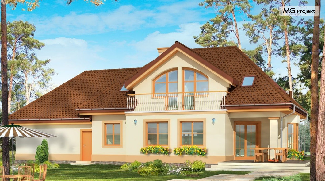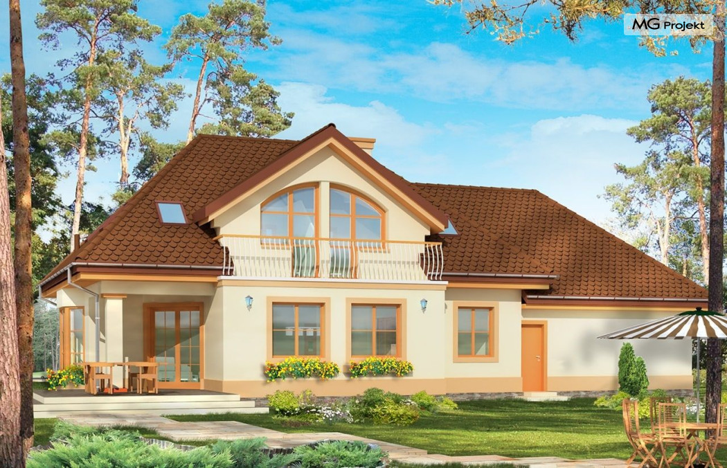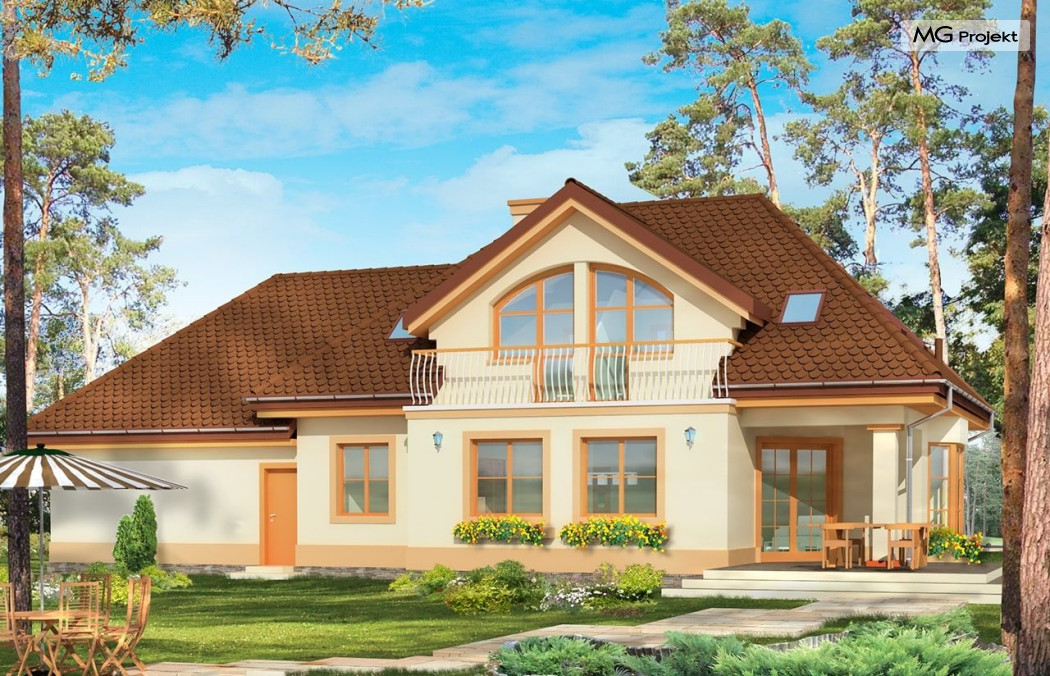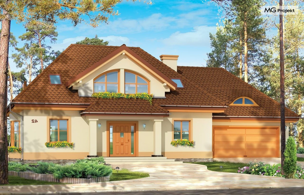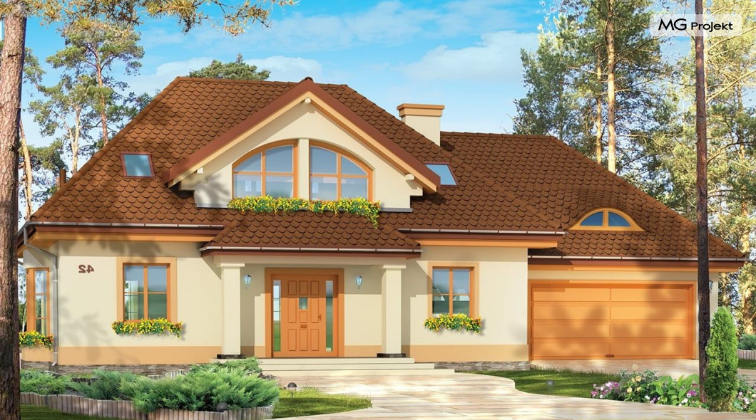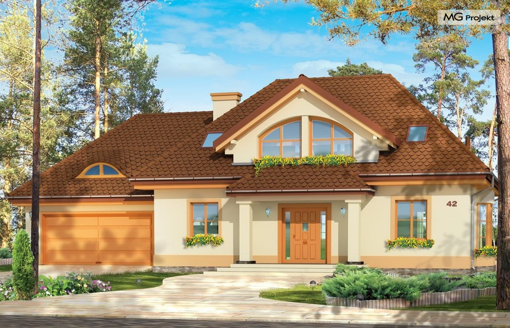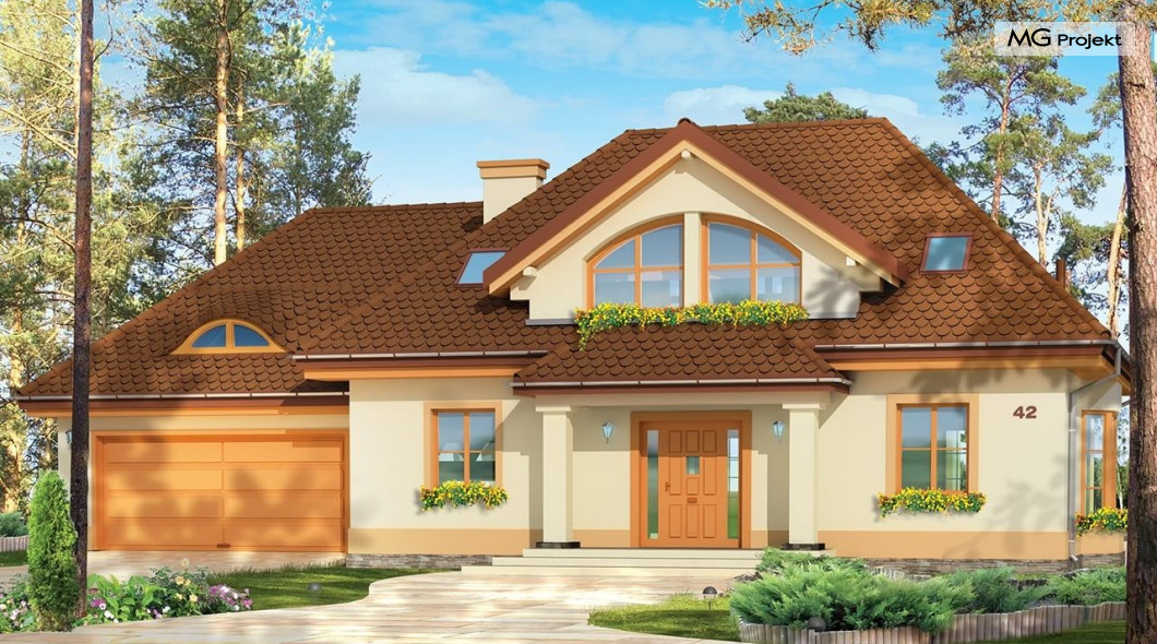 Projekt domu Faworyt 2 to druga wersja popularnego projektu Faworyt. Od wersji podstawowej projektu różni się powiększonym, podwójnym garażem. Projekt domu Faworyt 2 został stworzony z myślą o 4-5 osobowej rodzinie. Na parterze oprócz przestronnego salonu połączonego z jadalnią i holem zaprojektowano dodatkowy pokój i pomieszczenie gospodarcze. Na poddaszu domu zaplanowano trzy ładne sypialnie i łazienkę z pralnią. Dzięki powiększeniu garażu do dwóch stanowisk, zwiększyło się też pomieszczenie gospodarcze za garażem i strych na poddaszu, który można zmienić np. w centrum domowej rozrywki. Pracownia posiada również projekt domu Faworyt 2 w odbiciu lustrzanym. oraz projekt domu Faworyt 3. Zapraszamy!