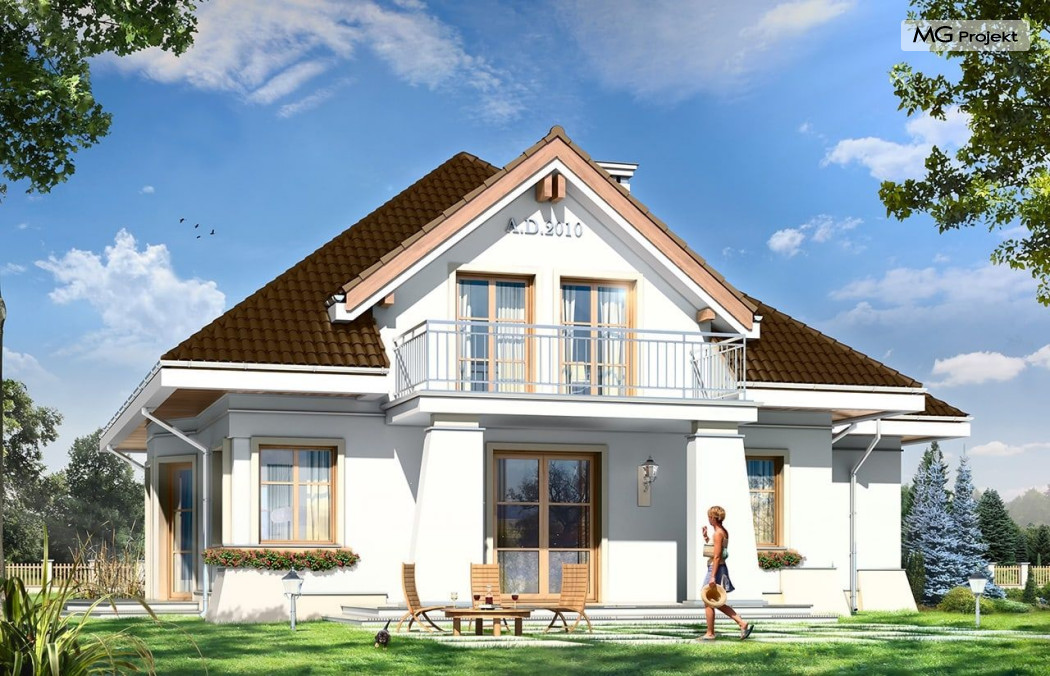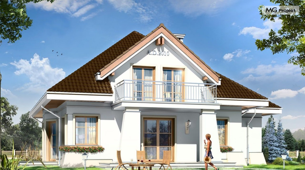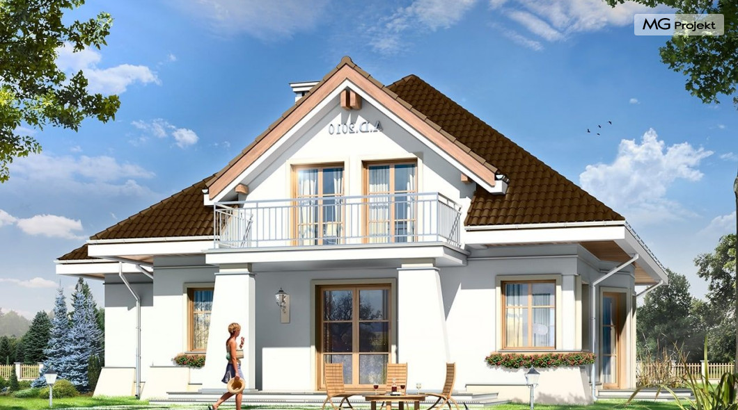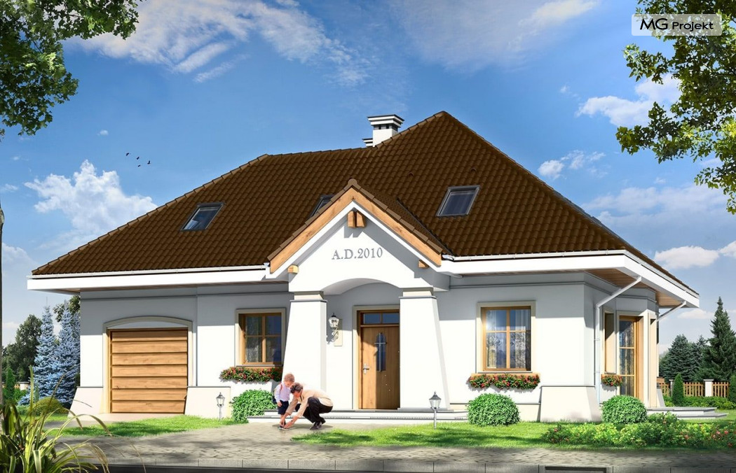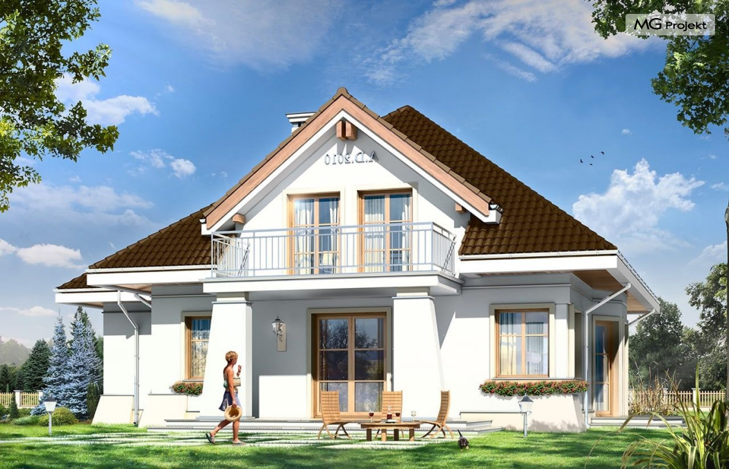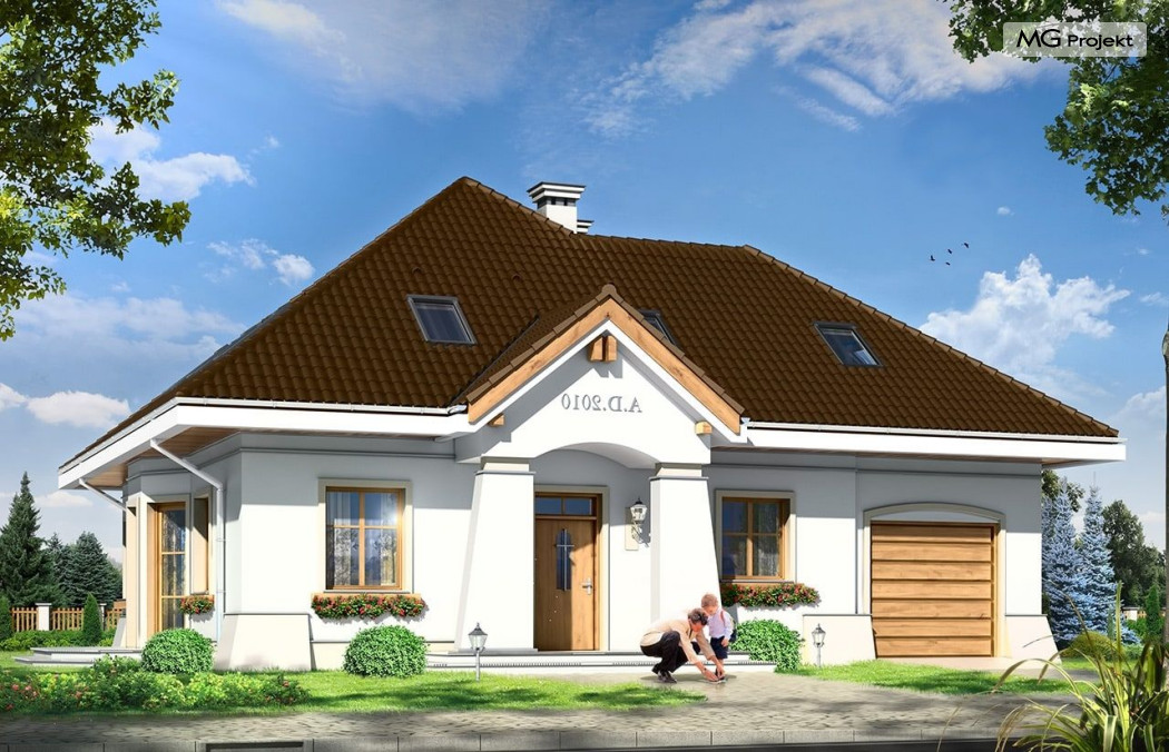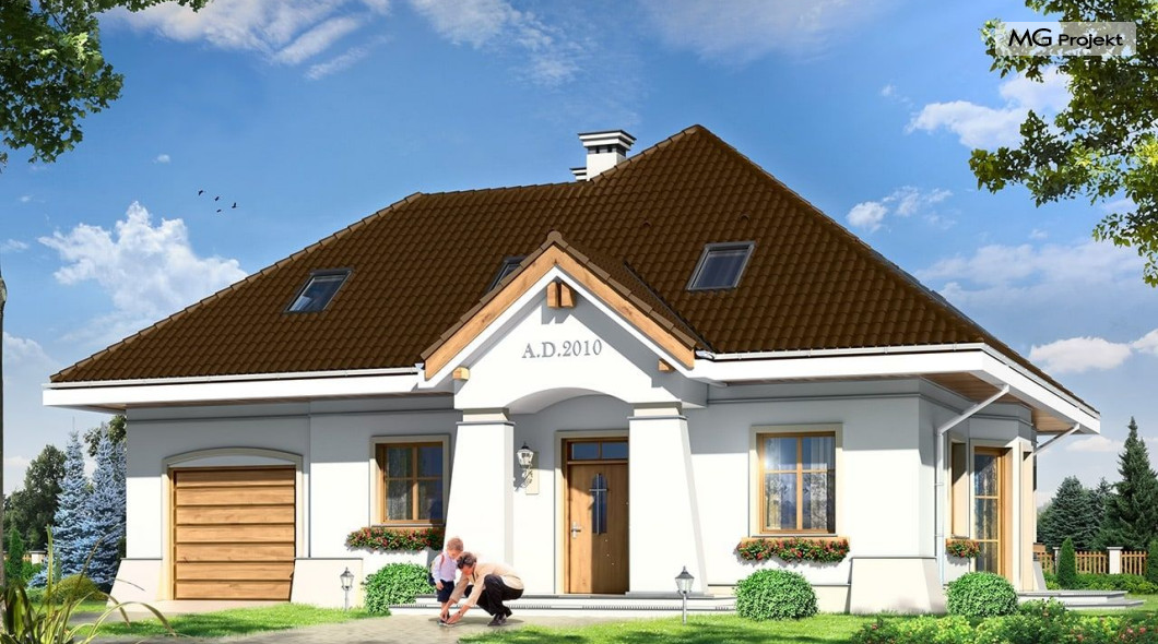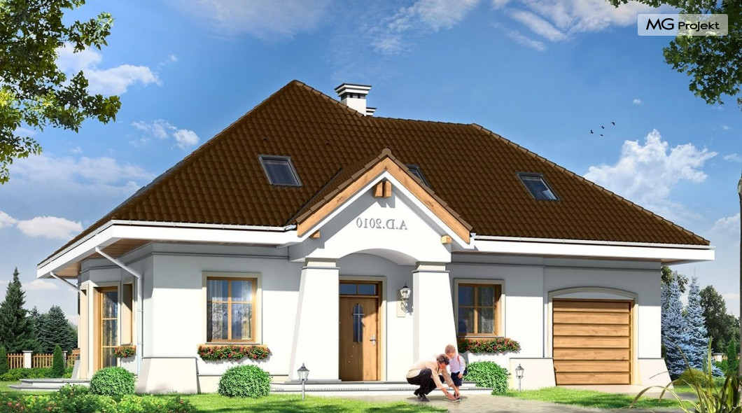Projekt domu Figiel 2 jest wersją wariantową domu projektu domu Figiel. Willę zaprojektowano tym razem z garażem. Dom przeznaczony jest dla cztero-pięcioosobowej rodziny. Projekt domu Figiel 2 to parterowy dom z poddaszem użytkowym zaprojektowany na planie prostokąta, z dobudowanym garażem. Przekryty został czterospadowym dachem, z dodatkowymi lukarnami i dachem nad garażem. Wygląd zewnętrzny domu kojarzy sie z przedwojenną rezydencją budowaną w miastach-ogrodach lub w podmiejskich letniskach. Jednocząc historyczny detal w elewacjach z nowoczesnymi materiałami i rozwiązaniami budowlanymi uzyskano bardzo ładny styl. Ganek wejściowy z przyporowymi kolumnami, przypory w narożnikach i pasy podmurówki, balkon w elewacji ogrodowej na przyporowych kolumnach - wszystkie te elementy potęgują efekt stabilnego osadzenia się domu w otaczający teren. Dzięki temu budynek wygląda bardzo statecznie. Wnętrze Figla 2 podzielono na część dzienną na parterze i sypialnie na poddaszu. Na parterze opracowano: salon z aneksem jadalnym z pięknym wykuszem, oraz centralnie ustawionym kominkiem, hol - z ładnymi dwubiegowymi schodami, częściowo otwarta kuchnia, oraz dodatkowy pokój, mogący służyć jako gabinet lub sypialnia. Dodatkowo obok przedsionka znajdują się: obszerne pomieszczenie gospodarcze - kotłownia, wc z natryskiem, oraz garaż. Na poddaszu znajdują się trzy sypialnie z jedną dużą wspólną łazienką oraz dodatkowa garderoba. Na półpiętrze nad garażem zaprojektowano strych, który można łatwo zaadaptować na dodatkowy pokój lub pokuj sportowy. Pracownia posiada odbicie lustrzane projekt domu Figiel 2.