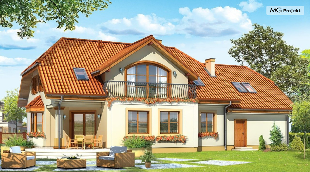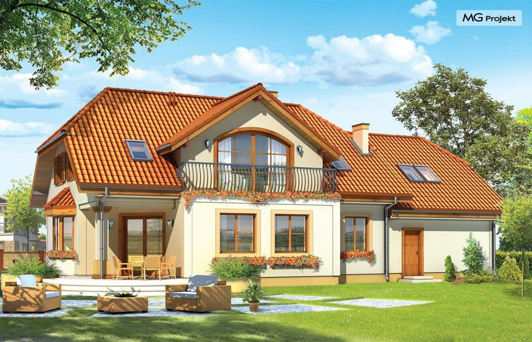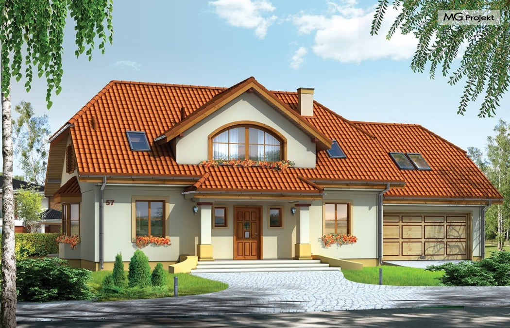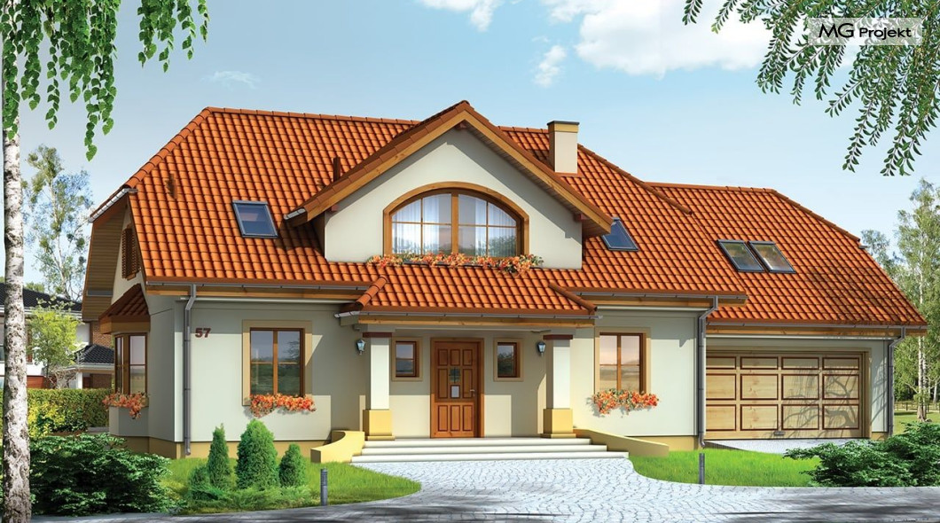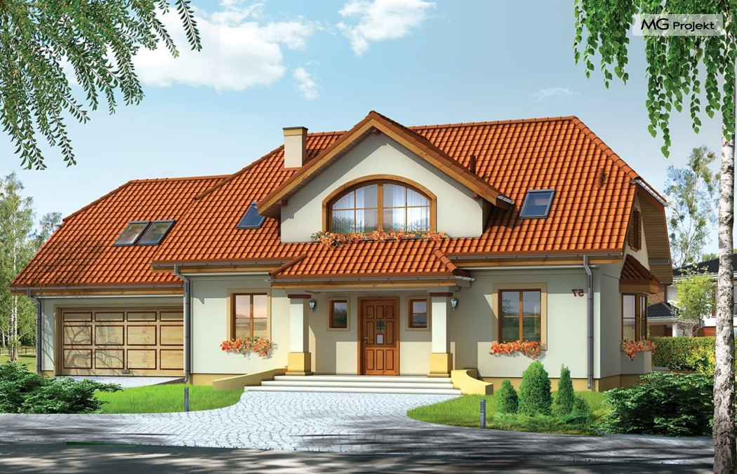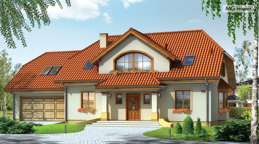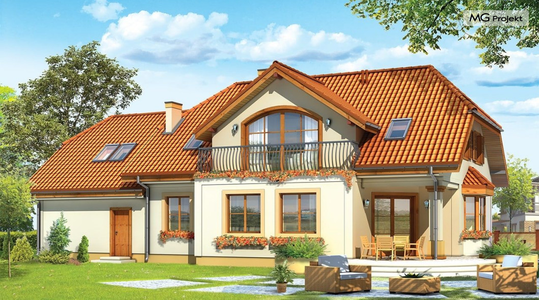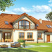 Projekt domu Fokus 2 jest kolejna wersją wariantową projektu domu Fokus - z podwójnym garażem i powiększonym strychem nad częścią garażową. Budynek został zaplanowany z myślą o cztero-sześcioosobowej rodzinie. Parterowy dom z użytkowym poddaszem, przekryty dwuspadowymi symetrycznymi dachami. Architektura zewnętrzna domu nawiązuje do tradycji polskiego dworku - we współczesnym ujęciu. Zwarta bryła budynku z dobudowaną częścią garażową ozdobiona jest frontową i tylną dużą lukarną, oraz balkonami i zadaszeniem wejściowym na bocznych masywnych kolumnach. Narożny podcień od strony ogrodowej stanowi urozmaicenie prostokątnego rzutu. Wnętrze domu Fokus 2 na parterze tworzy jednoprzestrzenna część dzienna, na którą składają się: salon, aneks jadalny, obszerny hol z wyeksponowanymi schodami, oraz częściowo otwarta kuchnia. Na parterze mieszczą się dodatkowo dwa pomieszczenia, oraz dwustanowiskowy garaż i kotłownia. Na poddaszu przewidziano trzy wygodne sypialnie z garderobami, przestronną łazienkę, oraz strych, który również można zaadaptować na cele użytkowe. Pracownia posiada wydanie projektu domu Fokus 2 w odbiciu lustrzanym.