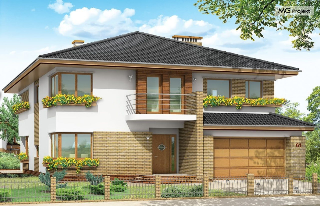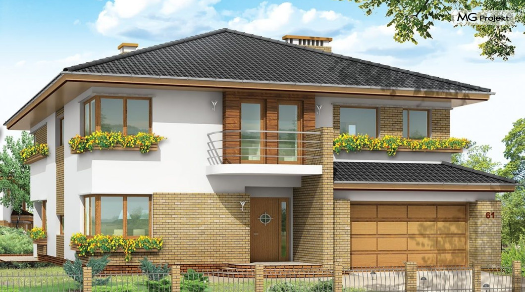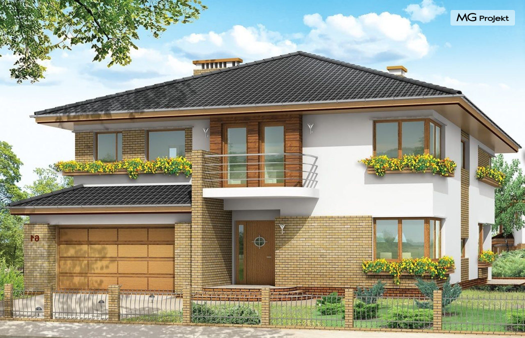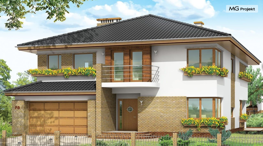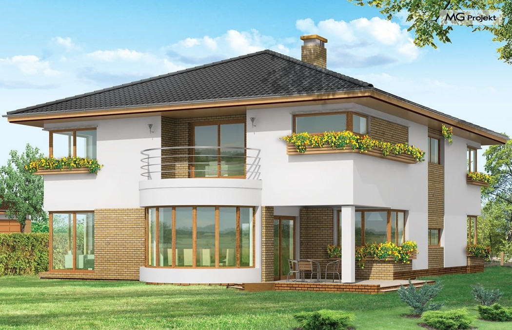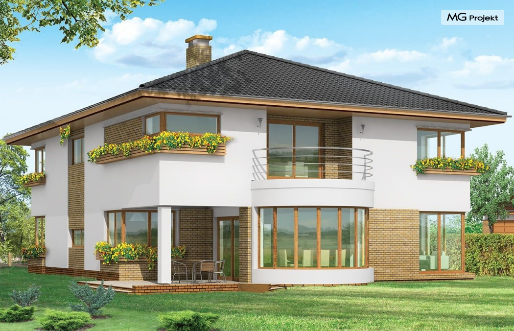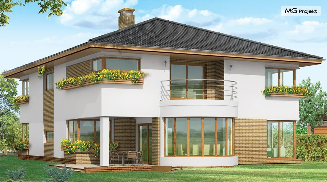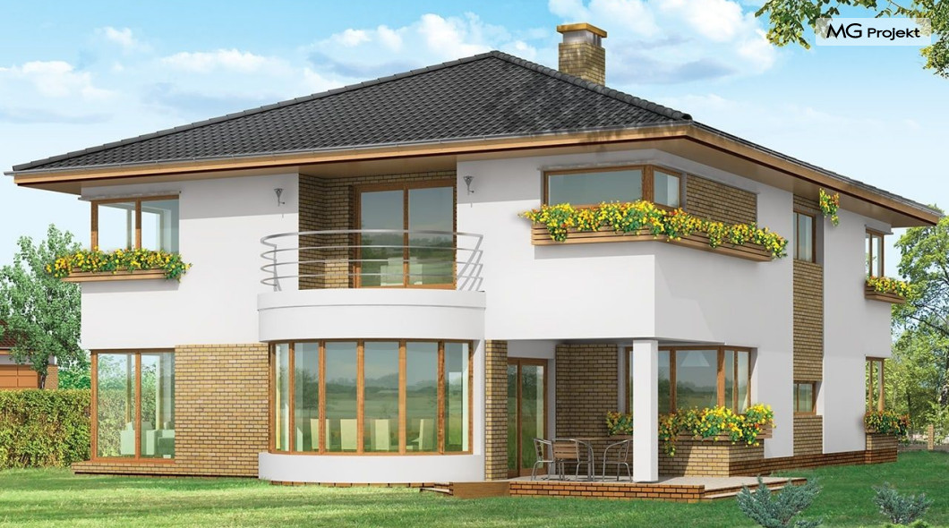 Projekt domu Gabriela to prestiżowa willa, o jednopiętrowej bryle przekryta czterospadowym dachem. Dom przeznaczony jest dla 4-6cio osobowej rodziny. Architektura domu Gabriela nawiązuje do stylu modernistycznego, we współczesnym ujęciu. Elementy jak narożne okna, balkony z zaokrąglonymi balustradami, łukowy wykusz jadalni, podział elewacji na poziome pasy tworzą ciekawą stylistycznie architekturę zewnętrzną budynku. Dla projektu Gabriela przewidziano kilka różnych wariantów aranżacji elewacji. Wnętrze domu: na parterze przestrzeń dzienna składająca się z salonu, jadalni z pięknym łukowym wykuszem, przestronnego holu z wygodnymi schodami na piętro, obszernej kuchni z aneksem na szybkie posiłki. Z pokoju dziennego wychodzimy do podcienia i na taras. Na parterze zaprojektowano również gabinet, garaż i kotłownię. Na piętrze znajduje się apartament rodziców z łazienką, garderobą i tarasem na ogród; trzy sypialnie dzieci, z łazienką, oraz pralnią i pokój sportowy. Dla domu przewidziano również częściowe podpiwniczenie - piwnica dostępna z zewnątrz domu, schodkami z ogrodu. Z piwnicy można zrezygnować jeśli warunku gruntowe nie pozwalają na jej budowę. Projekt domu Gabriela dostępny jest również w innych wersjiach: odbicia lustrzanego, projekt domu Gabriela 2 oraz projekt domu Gabriela 3. Zapraszamy!