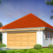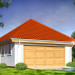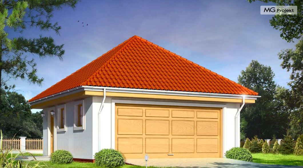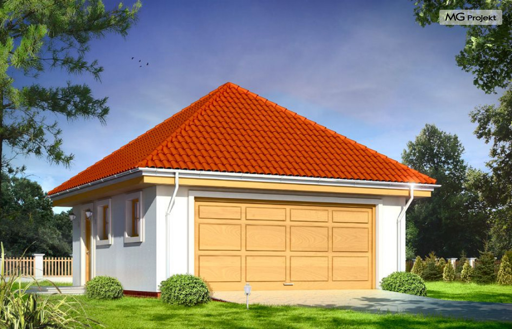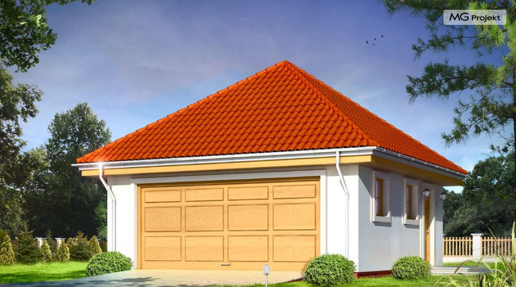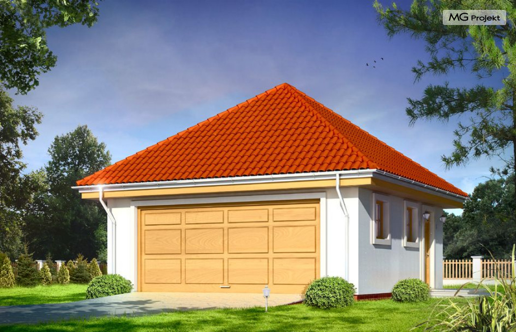 Garaż dwustanowiskowy przykryty dachem wielospadowym z dodatkowym wyjściem od strony elewacji bocznej.
