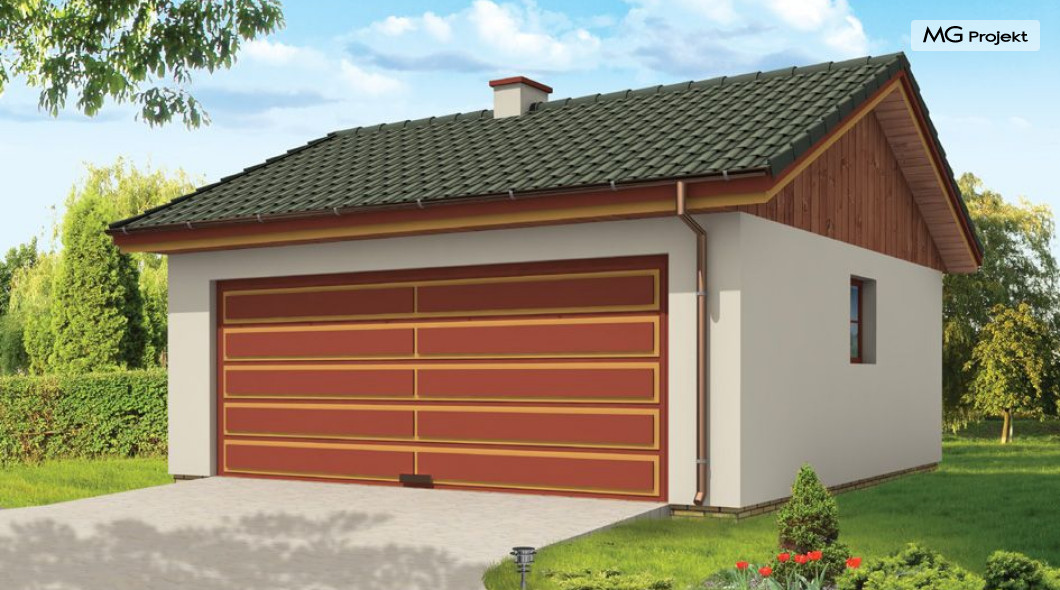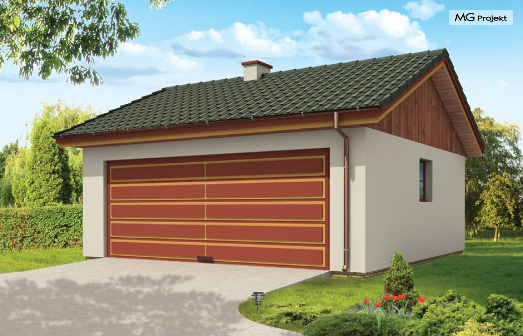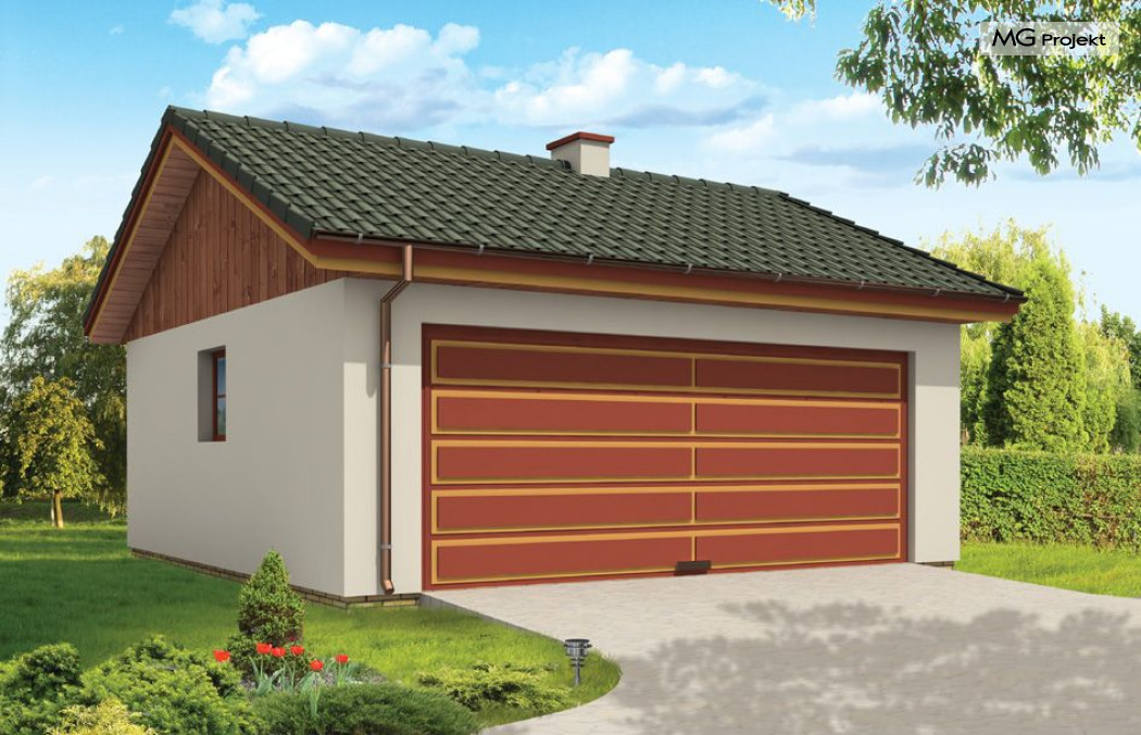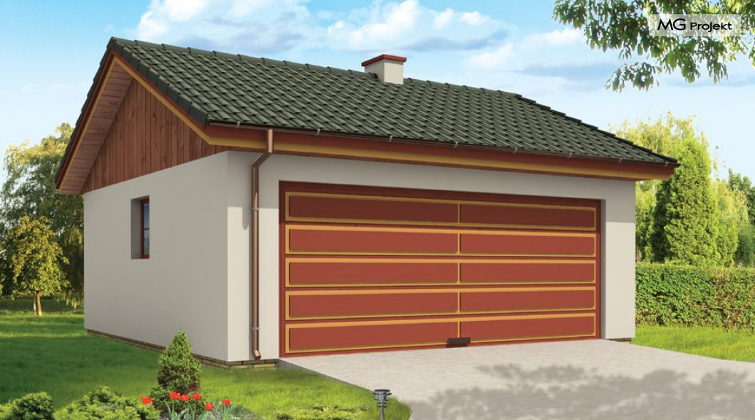 Garaż dwustanowiskowy przykryty dachem dwuspadowym.