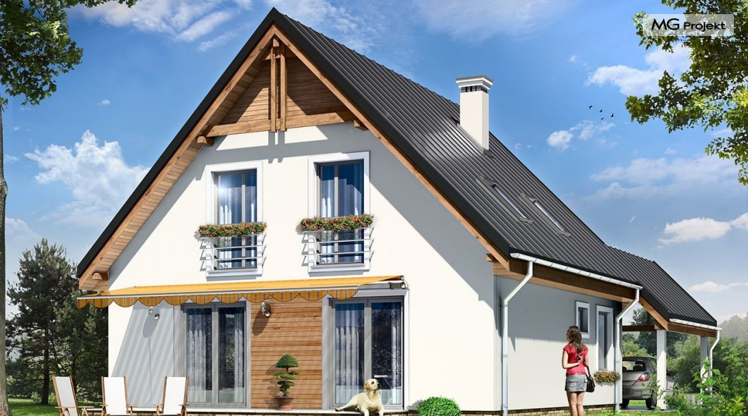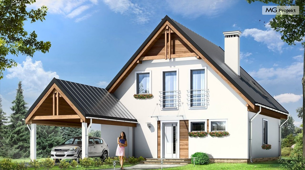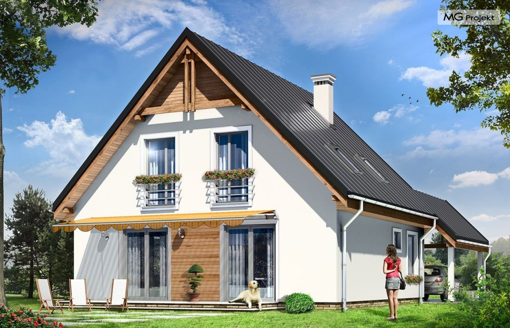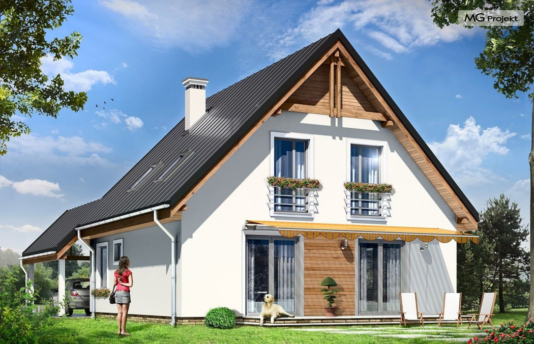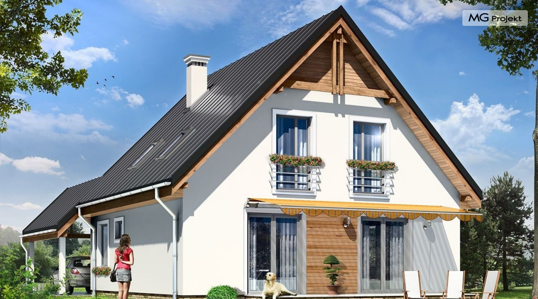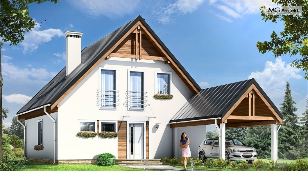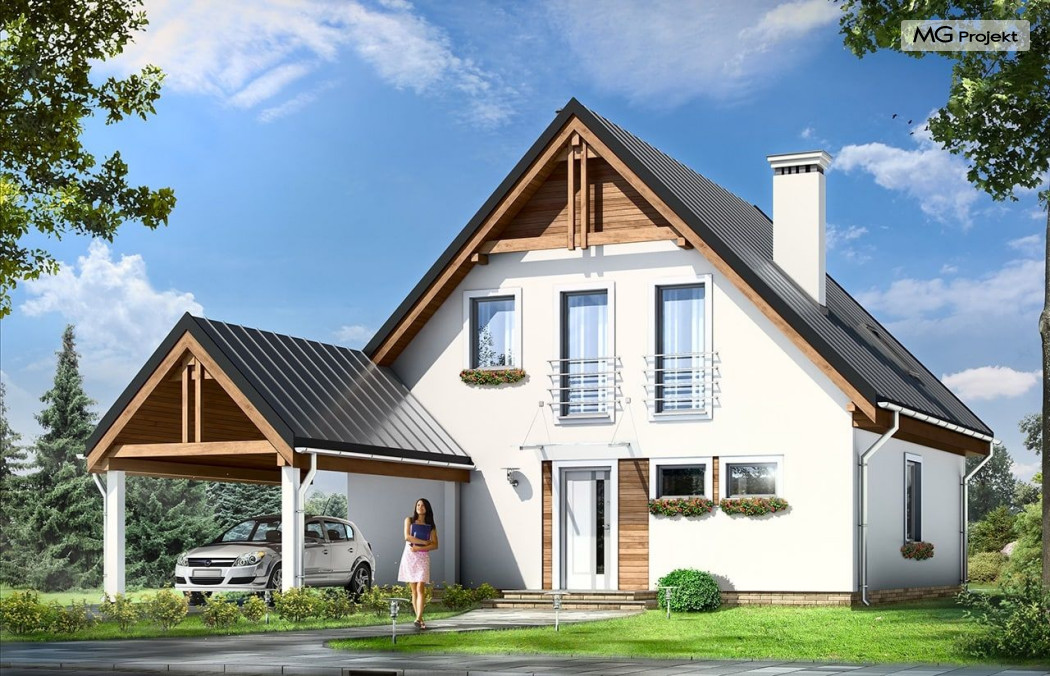 Projekt domu Jaś to parterowy dom jednorodzinny z poddaszem użytkowym, dla rodziny cztero-sześcioosobowej. Domek zbudowany na planie kwadratu 9,5x9,5 m, przekryty dwuspadowym dachem, z dobudowaną wiatą garażową. Istotą projektu jest prostota bryły w połączeniu z dobrze dobranymi proporcjami i ciekawym detalem. Budynek zaprojektowano w technologii murowanej. Wnętrze domu Jaś podzielono na dzienną część na parterze i sypialnie na poddaszu. Na dole, prócz dużego salonu z aneksem jadalnym, holu i półotwartej kuchni, zaprojektowano dodatkowy pokój - gabinet lub sypialnię, wc z natryskiem, oraz kotłownię. Na poddaszu przewidziano przewidziano trzy wygodne sypialnie i dużą łazienkę. Sypialnia rodziców ma dodatkowo garderobę. W sypialniach dzieci są wbudowane szafy. Przed domem, od frontu zaprojektowano dodatkowo wiatę garażową, którą dość łatwo można zamienić - w razie potrzeby - na garaż. Dom ma prostą konstrukcję, jest łatwy w budowie i będzie niedrogi w późniejszej eksploatacji. Pracownia posiada wersję ze stropem Teriva oraz odbicie lustrzane projektu domu Jaś.