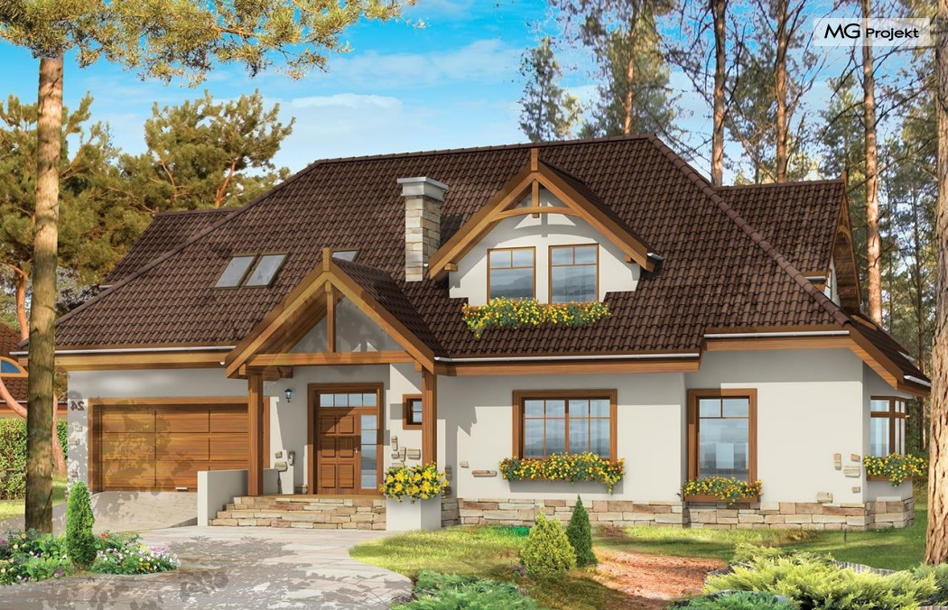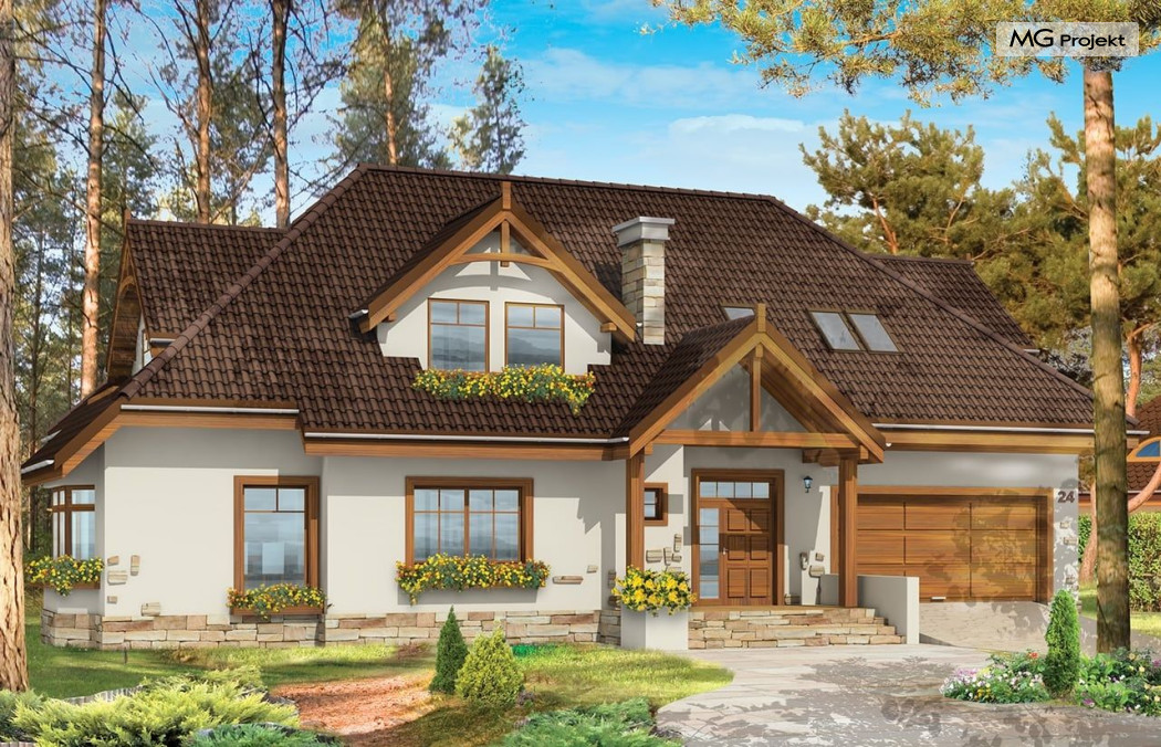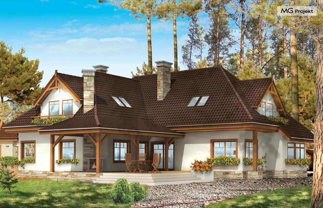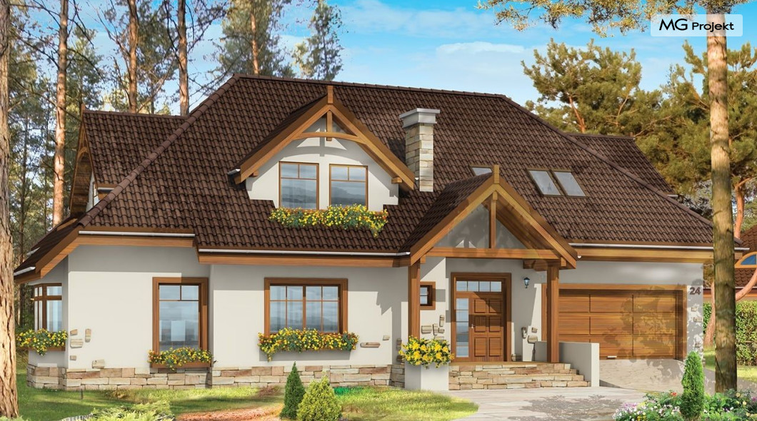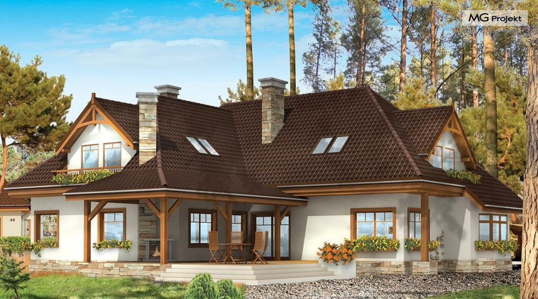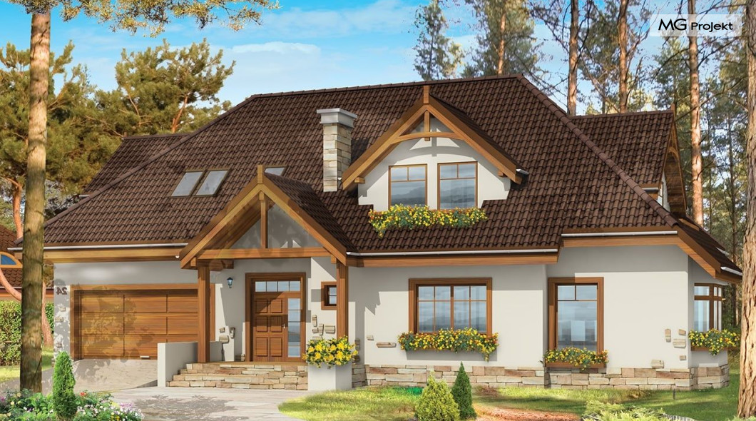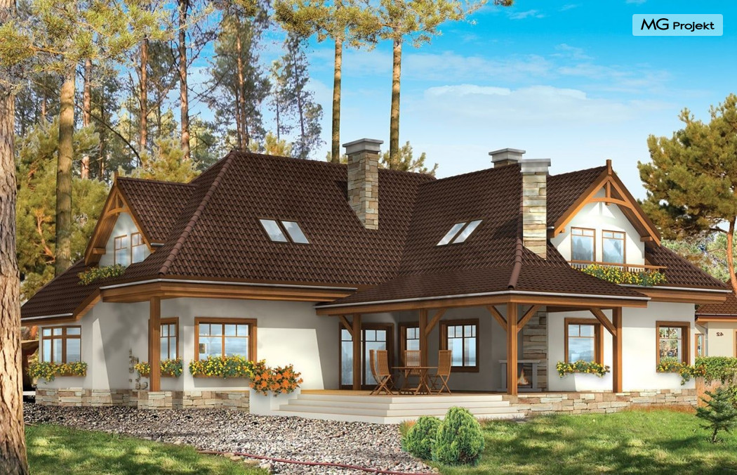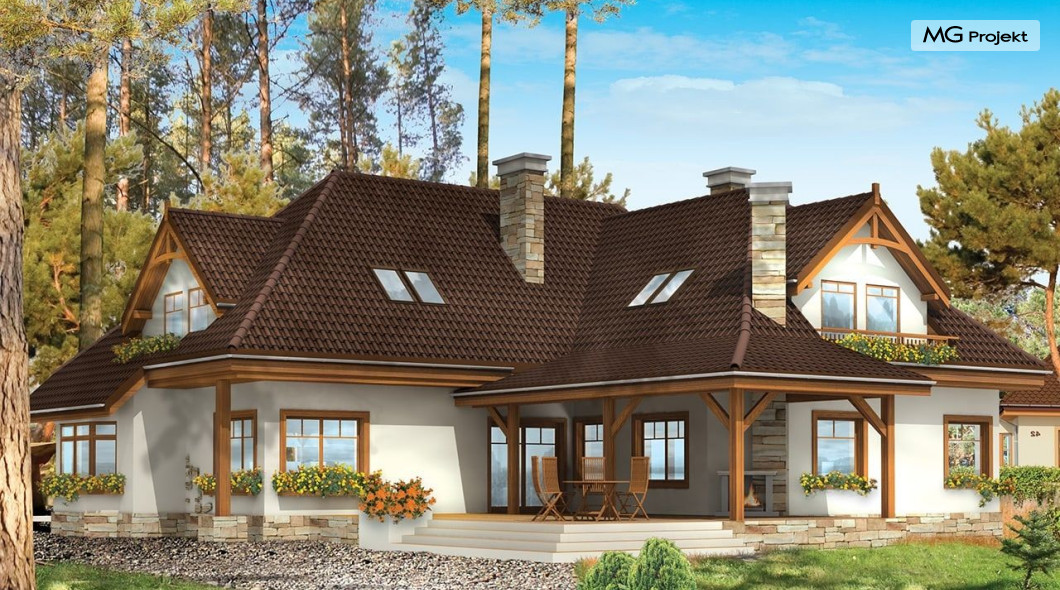 Projekt domu Jesion to duży, komfortowy dom jednorodzinny na ładną działkę. Budynek zaprojektowany został z myślą o rodzinie 4-7 osobowej, z możliwością wariantowego wygrodzenia mieszkania dla seniorów. Projekt willi zaplanowano w kształcie litery L tak, aby zapewnić maksymalną ochronę i intymność dla dużego, częściowo zadaszonego tarasu. To doskonałe miejsce wypoczynku. Część dzienna składa się z salonu, jadalni, holu i dużej kuchni. W holu zaprojektowano eleganckie schody owinięte wokół centralnej masywnej ściany kominkowej. Na poddaszu oprócz czterech sypialni z łazienkami i garderobami jest również powiększony hol mogący służyć jako bawialnia lub pokój tv. Na zewnątrz w podcieniu ogrodowym zaprojektowano zewnętrzny kominek. Pracownia dysponuje również wersją projektu domu Jesion w odbiciu lustrzanym oraz projekt domu Jesion 2. Sprawdź teraz!