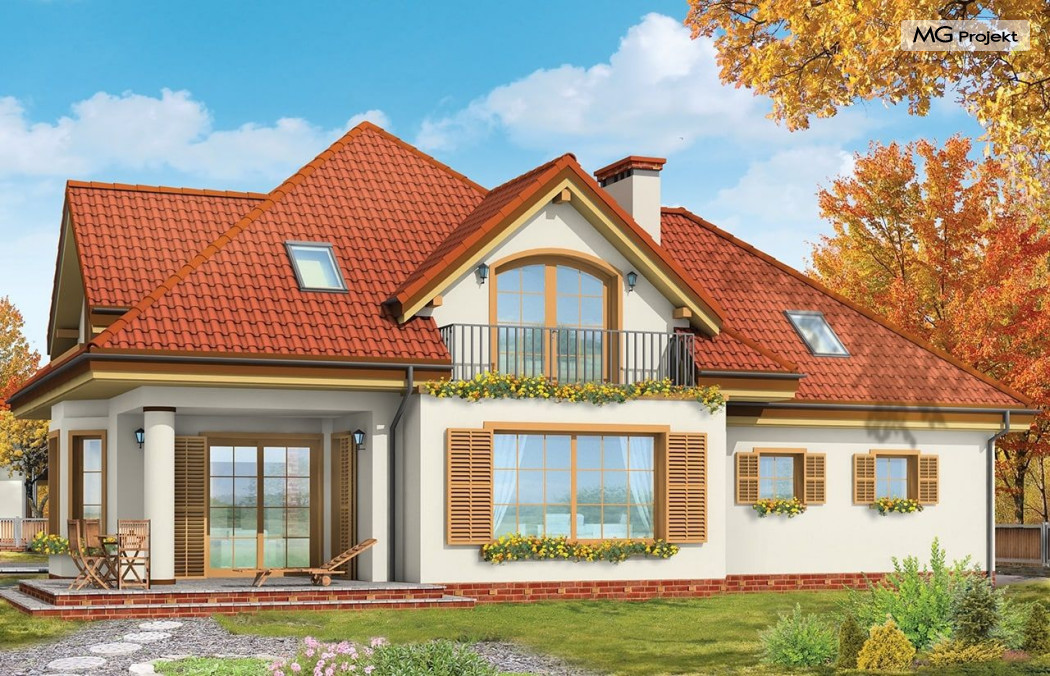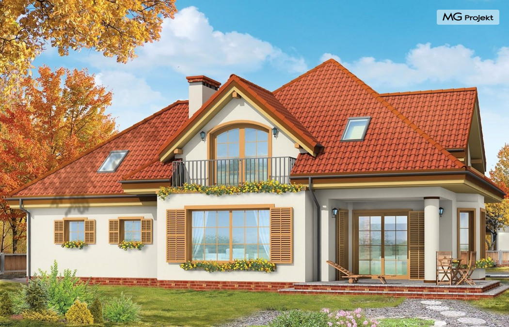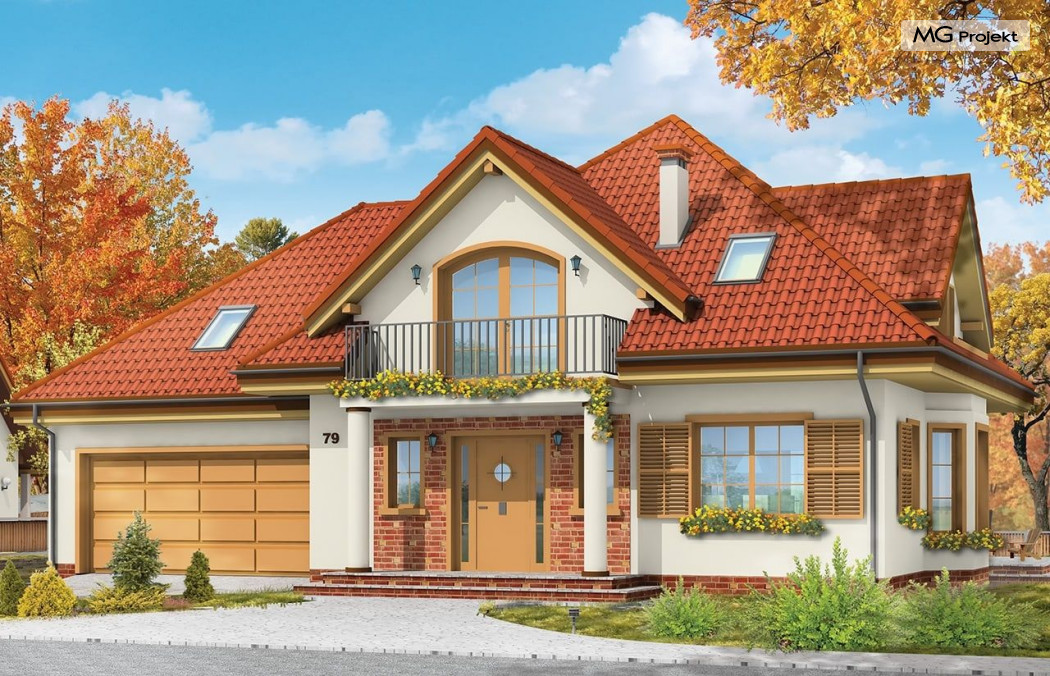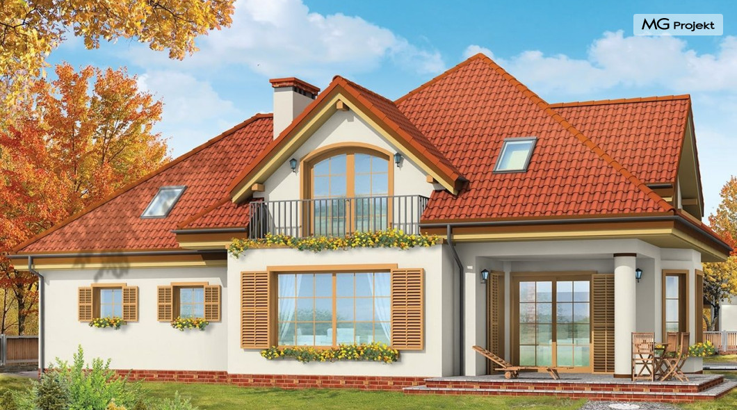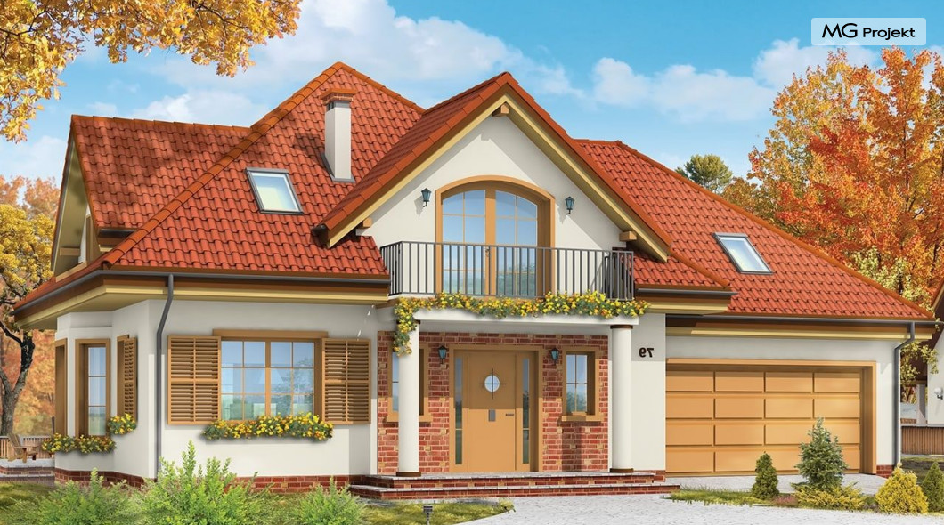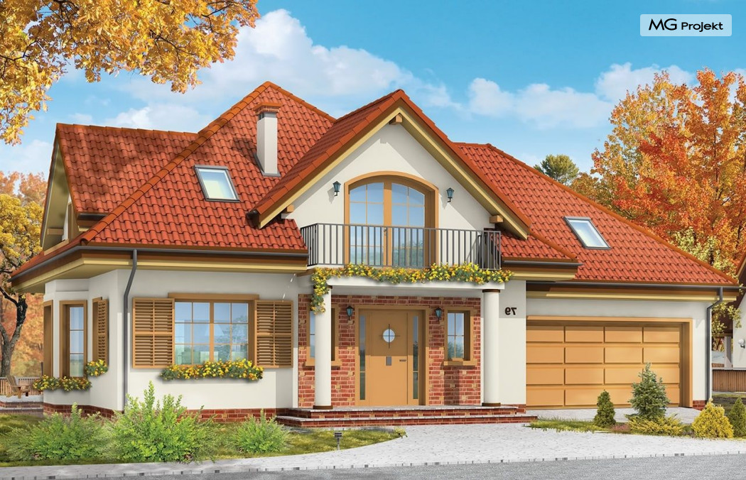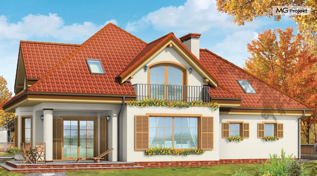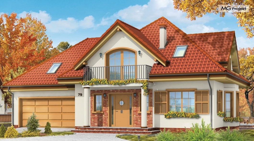 Projekt domu Julka to budynek jednorodzinny parterowy z poddaszem użytkowym dla rodziny 4-5cio osobowej. Projekt domu architektonicznie wzorowany jest na serii popularnych projektów Benedykt. Jest to jednak projekt o mniejszej powierzchni. Wymiary zewnętrzne budynku pozwolą posadowić go na niedużej działce. Mimo niewielkiej powierzchni użytkowej dom jest bardzo funkcjonalny wewnątrz, oraz prezentuje się bardzo dostojnie na zewnątrz. Kopertowy dach Julki z dobudowaną bryłą garażu ozdobiony został szerokimi lukarnami z balkonami. Od strony wejściowej balkon wsparty został na kolumnach tworząc podcień wejściowy, od ogrodu zaprojektowano wykusz z pięknym oknem z salonu. Dodatkowego sznytu domowi dodają wykusz w jadalni, oraz podcień ogrodowy z salonu, wsparty na kolumnie podpierającej narożnik domu. Na parterze zaplanowano pokój dzienny z jadalnią połączony z holem i z częściowo otwartą kuchnią. Reprezentacyjne schody będą stanowiły ozdobę przestrzeni dziennej na parterze. Przy wejściu zaprojektowano dodatkowe pomieszczenie, które może być wykorzystane do celów gospodarczych (wówczas połączone z garażem), lub może być ewentualnie pokoikiem do pracy - gabinetem. W części garażowej znajduje się dwustanowiskowy, wygodny garaż i dwa pomieszczenia gospodarcze w tym kotłownia. W projekcie domu Julka, na poddaszu przewidziano trzy przestronne sypialnie i wygodną łazienkę. Każda z sypialni ma przewidziane ściany z szafami wbudowanymi - można również wygrodzić w nich garderoby. Pracownia oferuje też wersję domu w odbiciu lustrzanym, wersję projektu z garażem jednostanowiskowym (projekt domu Julka 2), wersję przekrytą dachem dwuspadowym (pojekt domu Julka 3), wersję z dachem dwuspadowym i zwężonym garażem (projekt domu Julka 4). tylko zobacz czy sie dobrze zapisalo