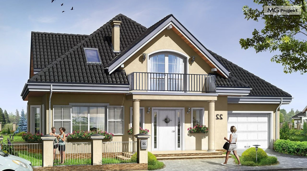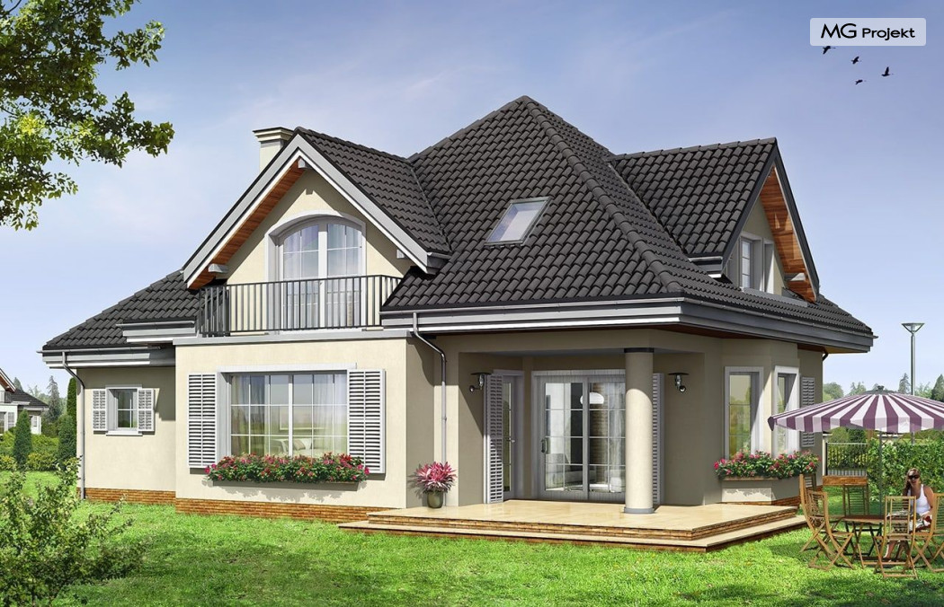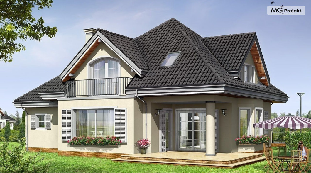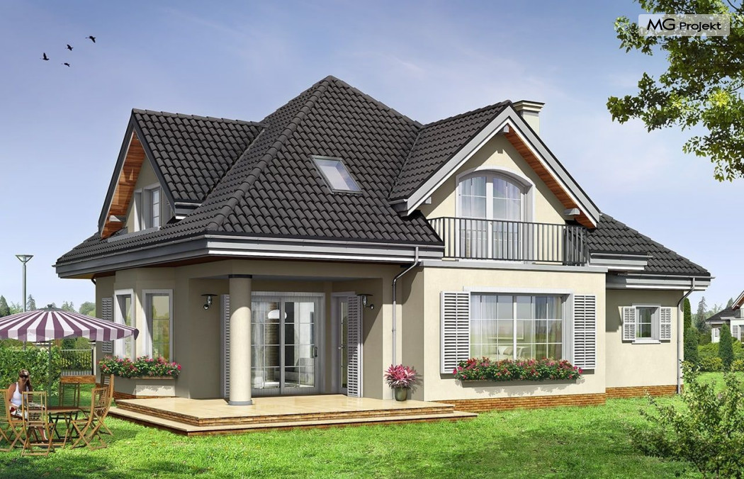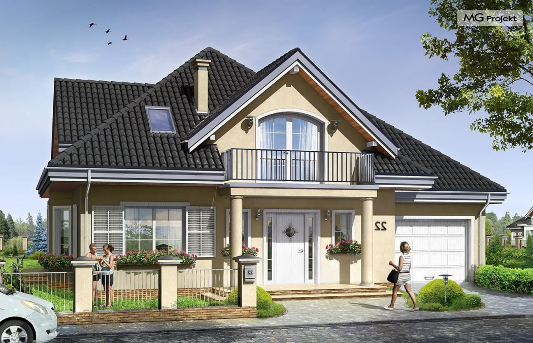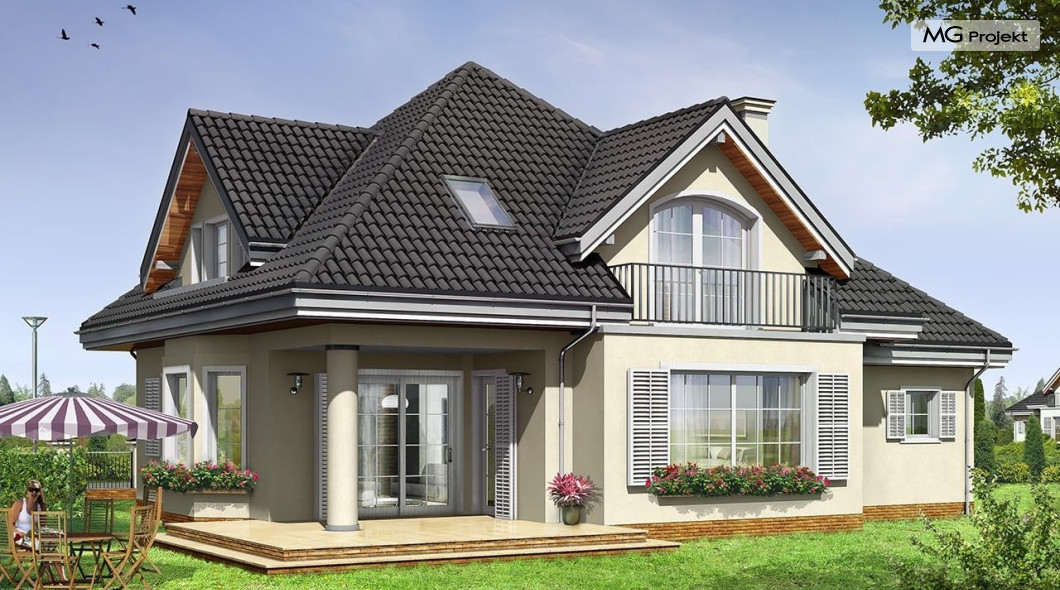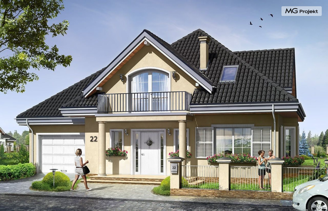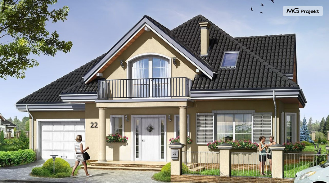 Projekt domu Julka 2 to pomniejszony wariant projektu Julka - z pojedynczym garażem i mniejszym strychem nad garażem. Domek stanowi idealną propozycję dla cztero-pięcioosobowej rodziny, która marzy o własnych czterech ścianach. Projekt domu Julka 2 stworzono na planie kwadratu, z dobudowanym garażem. Parter i poddasze wieńczy kopertowy dach, którego urozmaiceniem są lukarny z balkonami. Architektura zewnętrzna domu to tradycyjny Polski "dachowiec", z ciekawie dobranymi oknami i drzwiami balkonowymi, z ozdobnymi wykuszami i podcieniem ogrodowym, umożliwiającym przebywanie na tarasie w niepogodę. Wejście do domu Julka 2 zaakcentowano dwiema kolumnami, na których wspiera się balkonik frontowej lukarny. Wewnątrz dom zaprojektowano z podziałem na część dzienną na parterze i na część nocną - intymną z sypialniami na poddaszu. Większość powierzchni parteru zajmuje przestronna - jak na tą skalę domu - część dzienna z salonem, jadalnią, holem i półotwartą kuchnią. Schody stanowią dekoracyjny element wnętrza. Pozostała przestrzeń to garaż i pomieszczenia gospodarcze. Istnieje możliwość zagospodarowania pomieszczenia przy wejściu na pokój - gabinet lub biuro (likwidując połączenie z garażem). Na poddaszu miejsce znalazły trzy wygodne sypialnie - każda z własną szeroką lukarną, oraz łazienka. Dodatkowo można zaadaptować strych na dodatkowy pokój. Pracownia dysponuje wariantem odbicia lustrzanego projektu Julka 2 oraz kilkoma wariantami : podstawowa (projekt domu Julka), z dachem dwuspadowym i garażem dwustanowiskowym (projekt domu Julka 3), z garażem jednostanowiskowym (projekt domu Julka 4).
