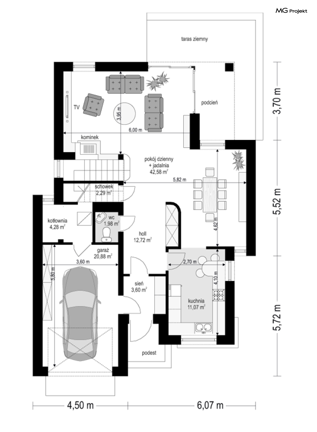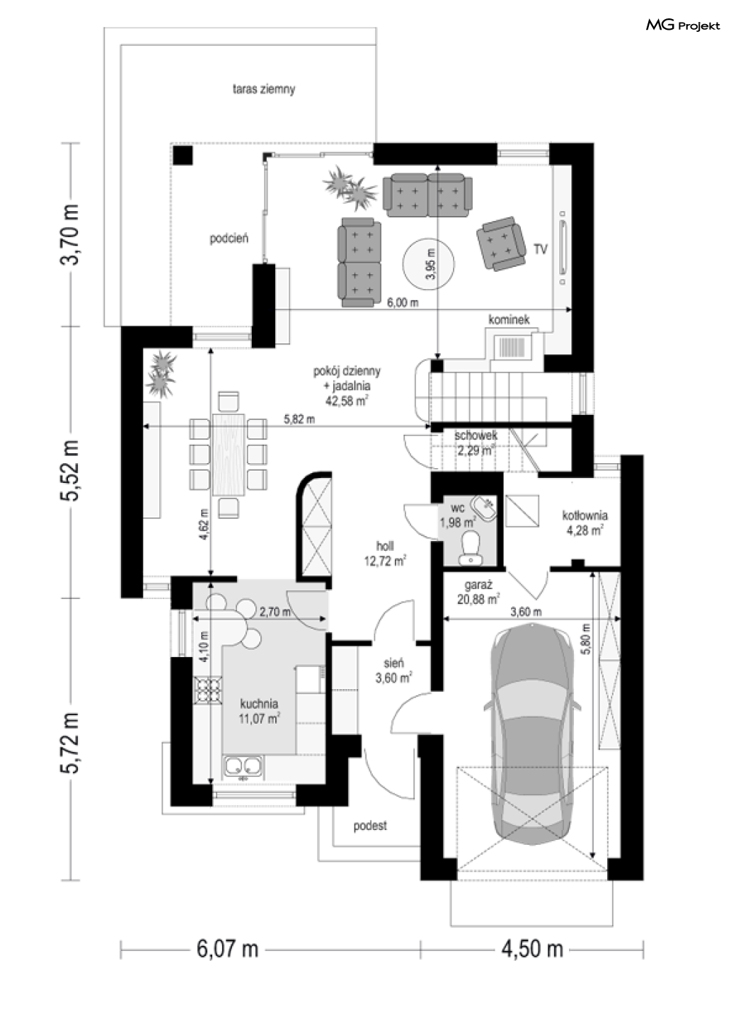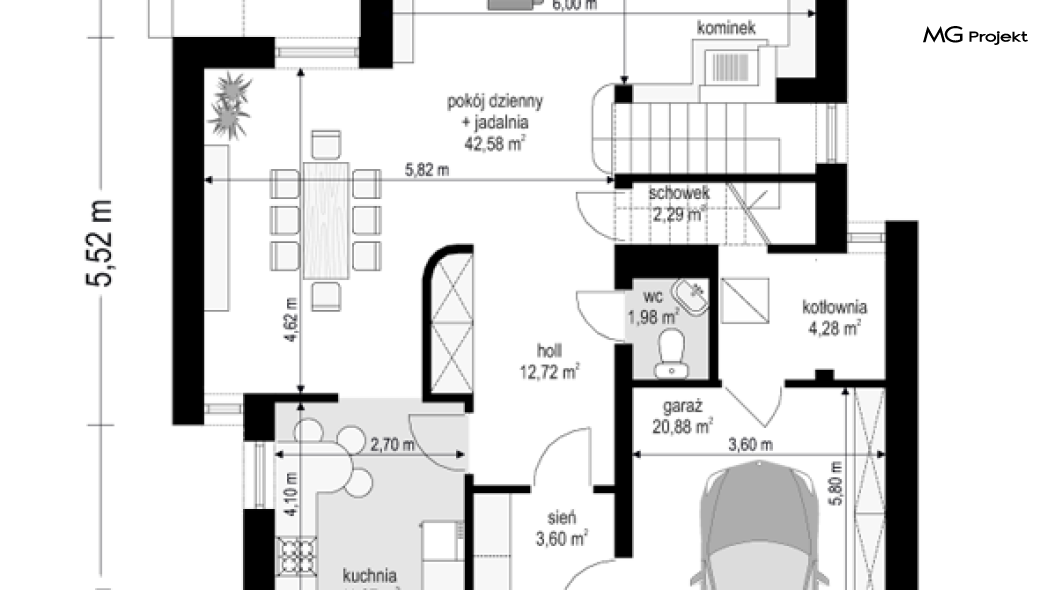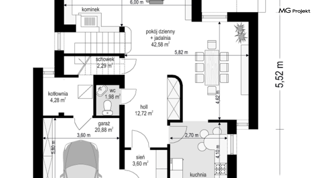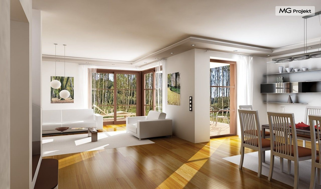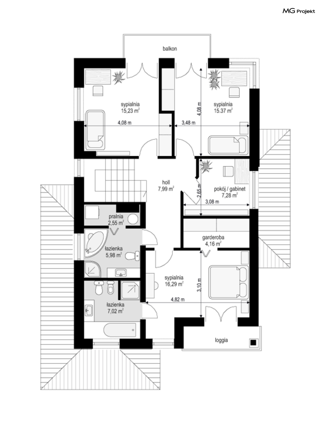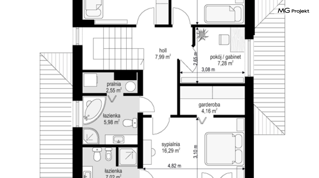 Projekt domu Kasjopea to przeznaczony dla rodziny 4-5 osobowej dom. Budynek zaprojektowano jako piętrowy, przekryty czterospadowym dachem z częściowo wbudowanym w główną bryłę garażem. Prosta forma domu w postaci prostopadłościanu została urozmaicona wystającymi wykuszami i daszkami, a także podcieniami, balkonami i loggią. Dom spodoba się niewątpliwie Klientom gustującym w nowoczesnych formach architektonicznych, ale z dozą konserwatyzmu - jednym słowem nieprzesadzonych. Kształt domu Kasjopea umożliwi lokalizowanie projektu również na wąskiej działce. Wnętrze parteru to: część dzienna, składająca się z salonu z aneksem jadalnym, holu, częściowo otwartej kuchni, oraz pomieszczenie gospodarcze i garaż. Na piętrze zaplanowano z kolei apartament rodziców - z łazienką, garderobą i balkonem, oraz dwie sypialnie dzieci - z łazienką. Dodatkowo zmieścił się jeszcze jeden pokój, który może być wykorzystany jako gabinet do pracy, ewentualnie sypialnia gościnna lub duża garderoba. Projekt domu Kasjopea występuje też w wersji odbicia lustrzanego, wersji odświeżonej (projekt domu Kasjopea 8) oraz w wersji zbliźniaczonej (projekt domu Kasjopea 2), wersji z garażem dwustanowiskowym (projekt domu Kasjopea 3), wersji najmniejszej (projekt domu Kasjopea 4), wersji powiększonej do 211.78 m2 (projekt domu Kasjopea 5), wersji największej (projekt domu Kasjopea 6), z nowocześniejszą architekturą (projekt domu Kasjopea 7) oraz z wyższym kątem nachylenia dachu (projekt domu Kasjopea 7 B).