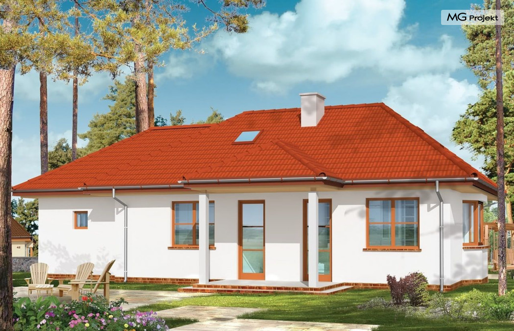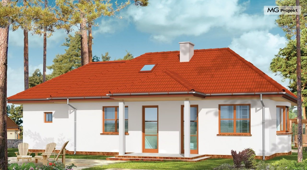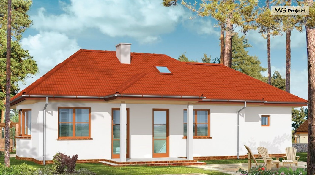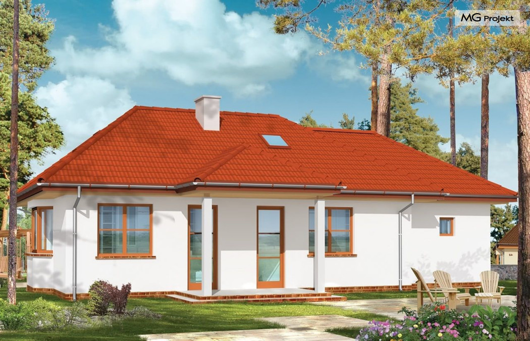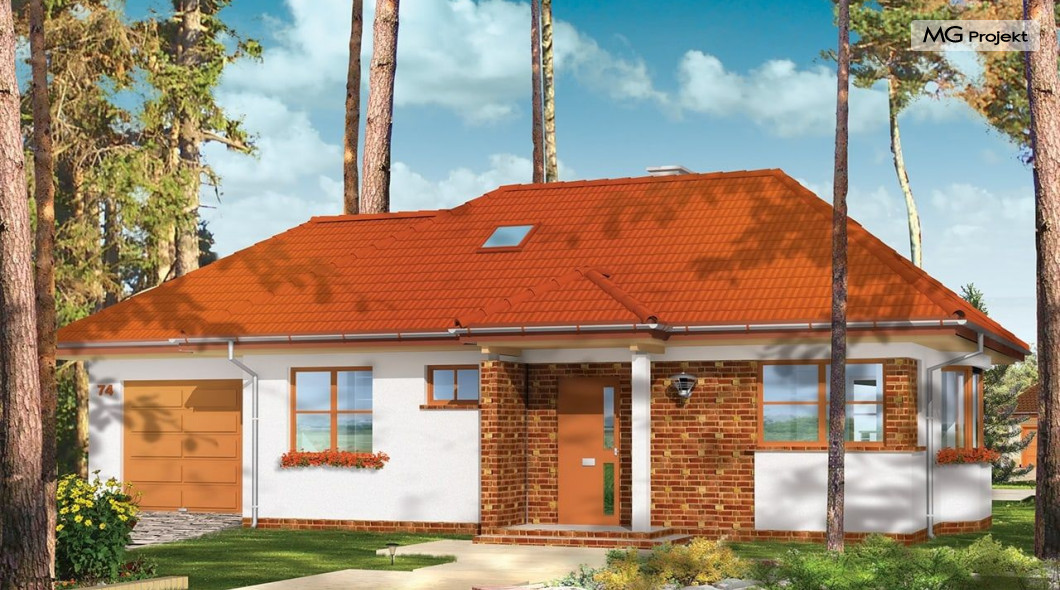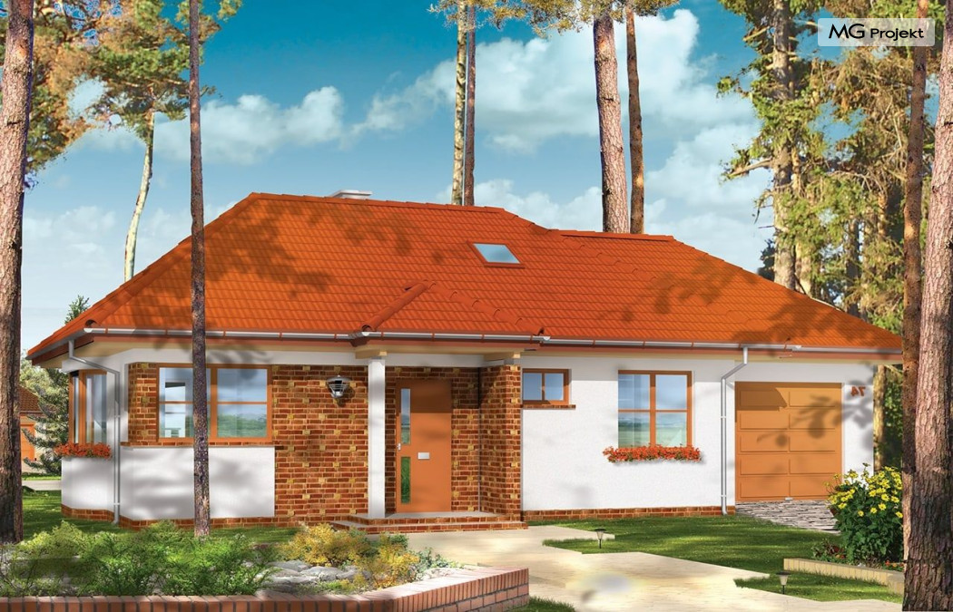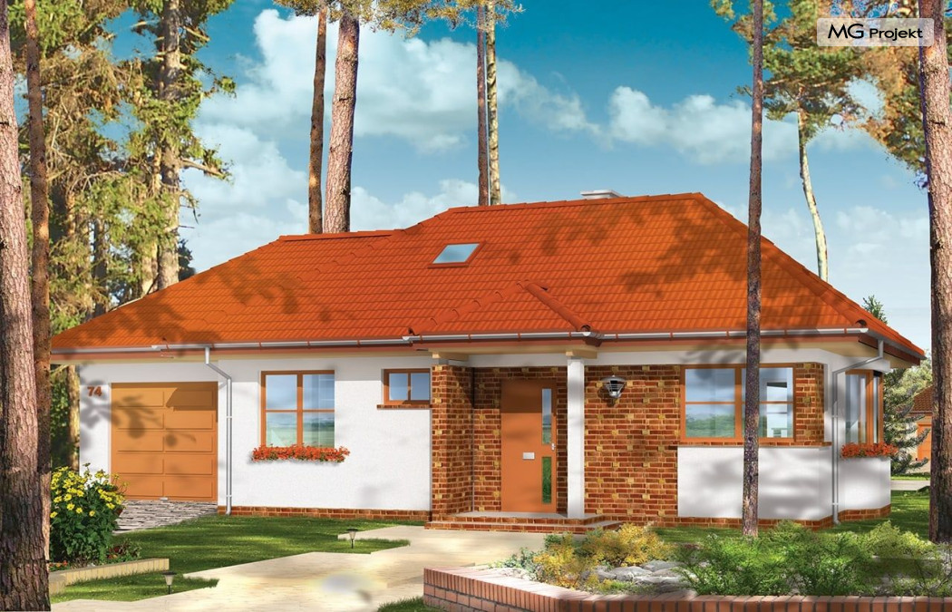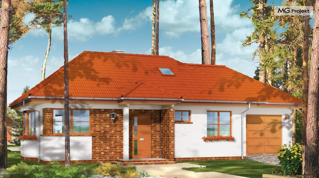 Projekt domu Klejnot z garażem to nieduży jednorodzinny dom dla trzyosobowej rodziny lub młodego małżeństwa z małymi dziećmi. Projekt domu w odróżnieniu od wersji podstawowej posiada dobudowany garaż. Budynek może być również użytkowany jako letniskowy. Prosta bryła bez udziwnień umożliwia łatwą i tanią budowę. Dobrane zrównoważone detale architektoniczne sprawiają przy tym, że przyjemnie patrzy sie na domek. Wnętrze zaprojektowano z podziałem na strefy: dzienną i nocną. Projekt domu Klejnot z garażem występuje również w wersji odbicia lustrzanego oraz bez garażu projekt domu Klejnot. Zapraszamy!