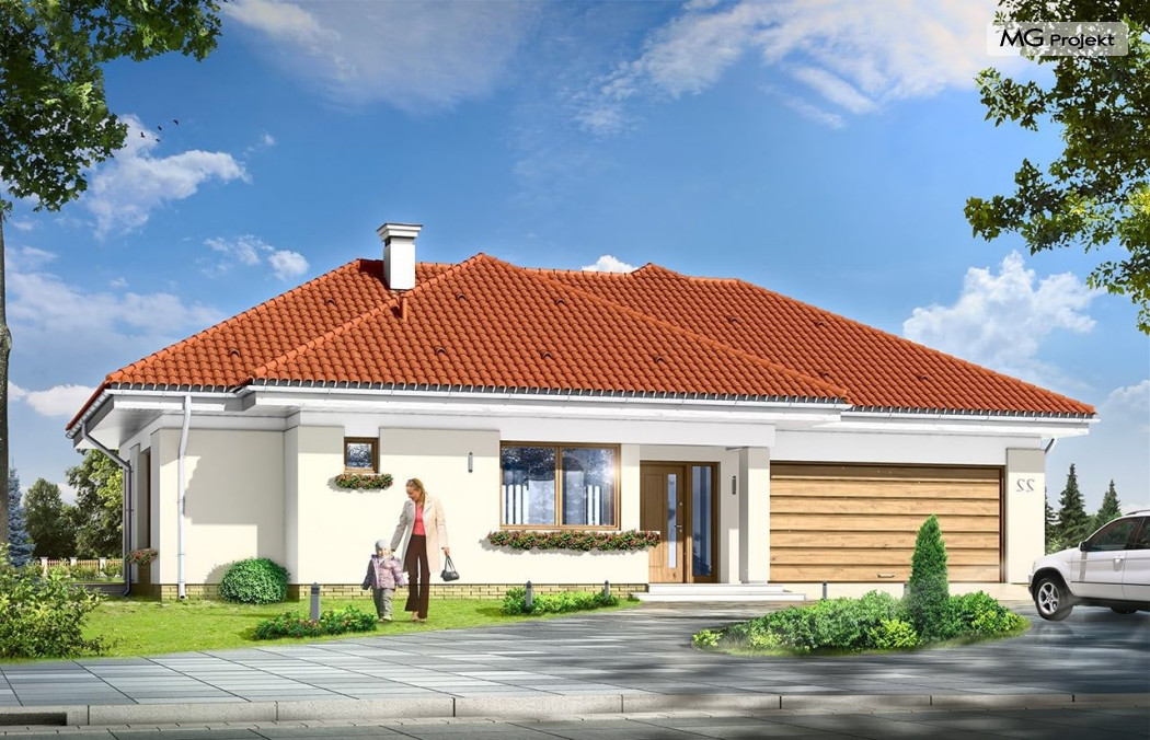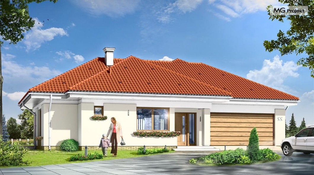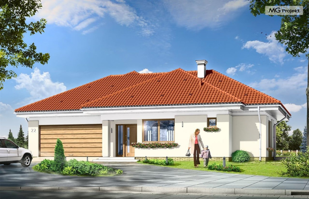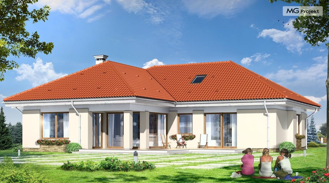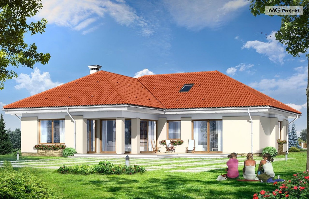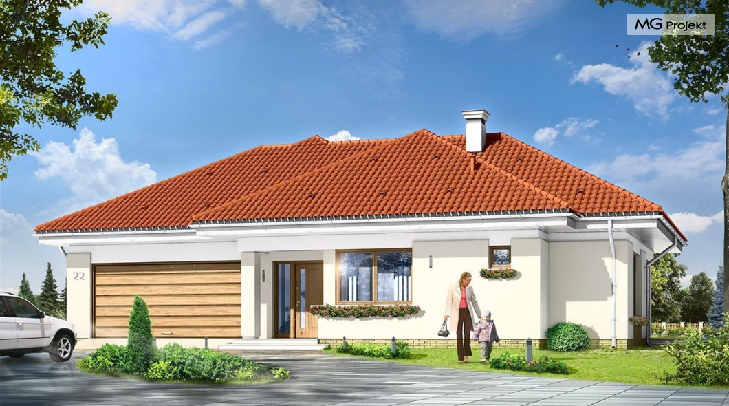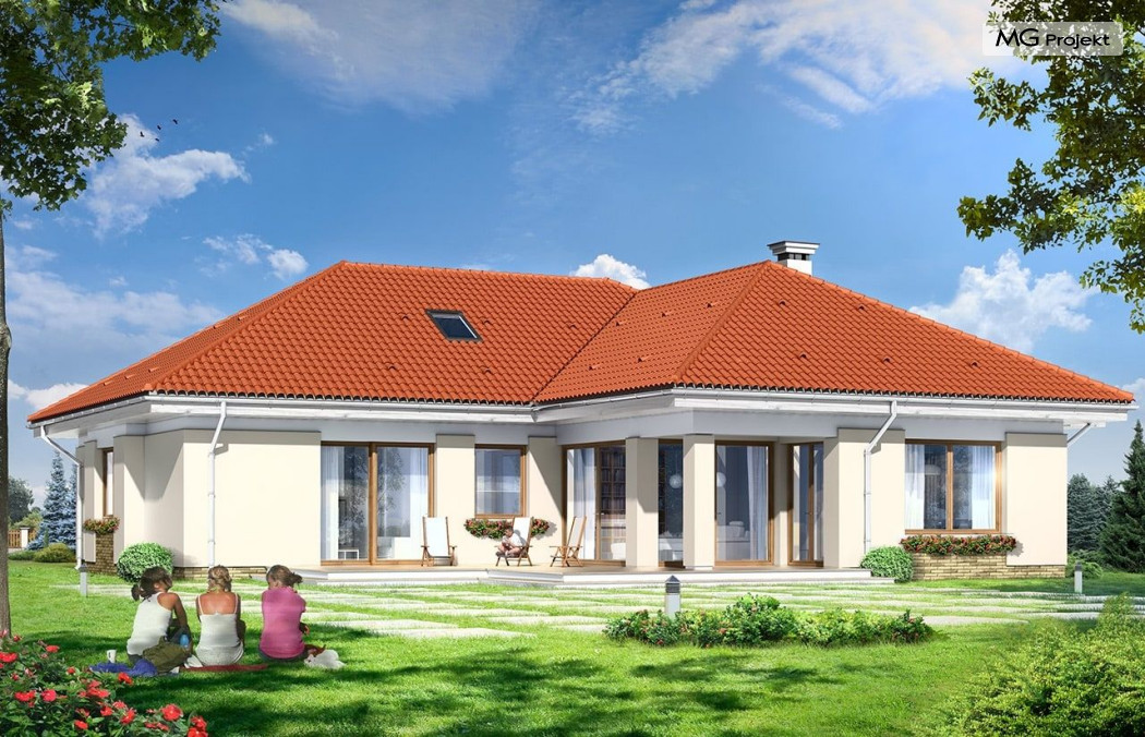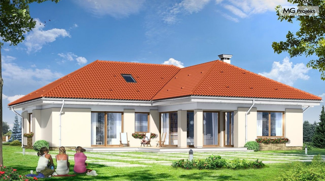 Projekt domu Komfortowy 3 to budynek jednorodzinny dla rodziny cztero-pięcioosobowej. Budynek parterowy, przekryty wielospadowym dachem, ze strychem, który można zaadaptować na dodatkowe poddasze użytkowe. Dom Komfortowy 3 jest mniejszym wariantem popularnego projektu Komfortowy. Wygląd zewnętrzny domu łączy w sobie elementy nowoczesności i tradycji. Tradycyjny dach kryty dachówką w połączeniu z niskimi parterowymi ścianami, z dużą ilością przeszkleń, z narożnymi oknami i oknami sięgającymi podłogi, tworzą udane połączenie. Dom wtapia się w otaczający go ogród i zachowuje ludzką skalę. Ze wszystkich pomieszczeń jest bezpośredni widok i kontakt z ogrodem. Ponieważ dom jest parterowy - wszystkie pomieszczenia znajdują się na jednym poziomie, dając niezrównaną wygodę mieszkańcom. Wnętrze podzielono na część dzienną - z salonem, oraz nocną - z sypialniami. Dodatkowo wydzielono też przestrzeń gospodarczą, z dwustanowiskowym garażem i kotłownią - dostępnymi z przedsionka. Pokój dzienny, z centralnie usytuowanym kominkiem, oraz pięknym narożnym przeszkleniem - otwarciem na ogród, w połączeniu z jadalnią, holem i kuchnią, tworzą ogromną przestrzeń dziennego użytkowania dla domowników. Dodatkową ozdobą są niewątpliwie schody na strych. Strych można zamknąć jako nieużytkowy, lub zaadaptować jako dodatkowe studio z pustką nad salonem. W części nocnej znajdują się trzy sypialnie, z sypialnią rodziców z własną garderobą i wyjściem na taras, oraz duża łazienka i dodatkowy pokój - np. gabinet. Zapraszamy do zapoznania się z innymi projektami domów: projekt domu Komfortowy, projekt domu Komfortowy 2, projekt domu Komfortowy 3.
