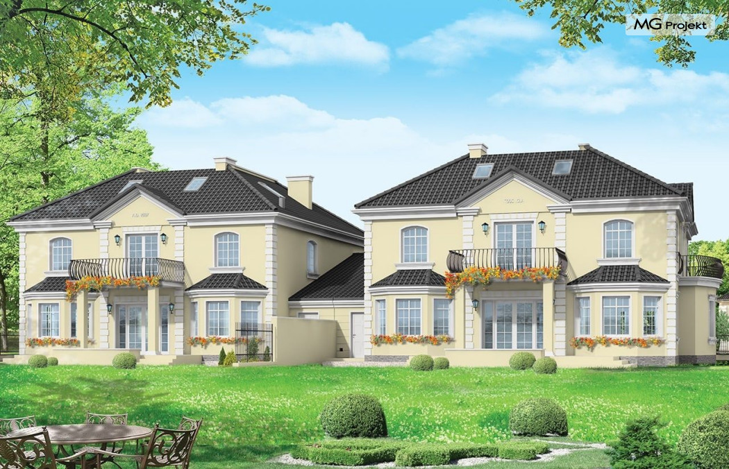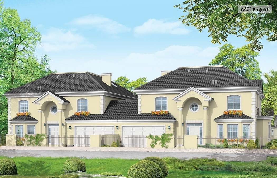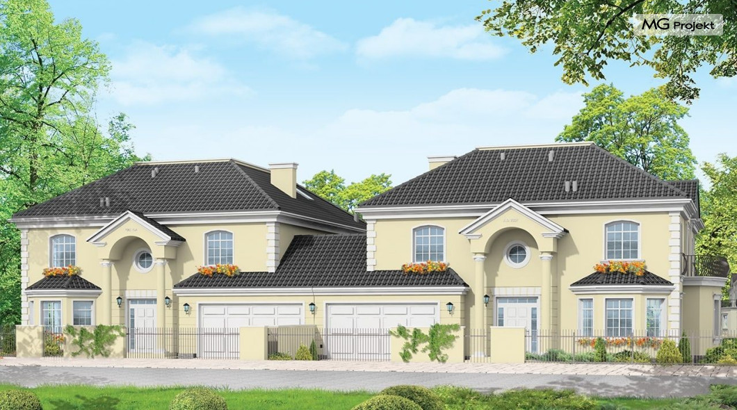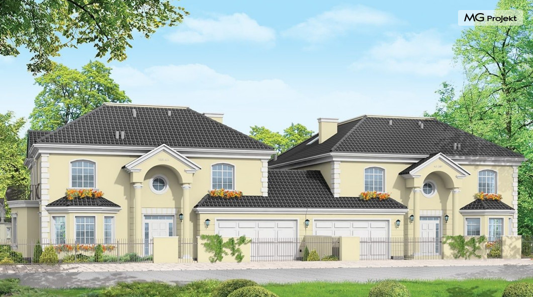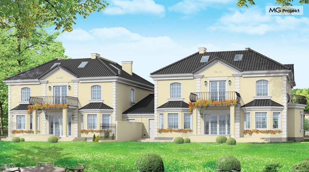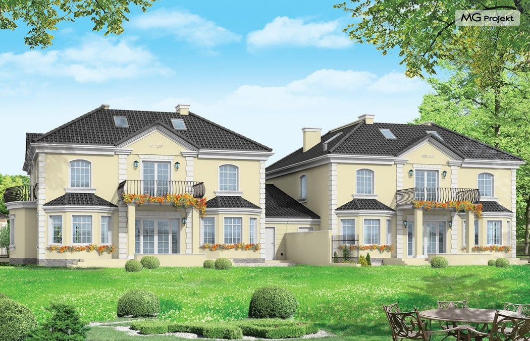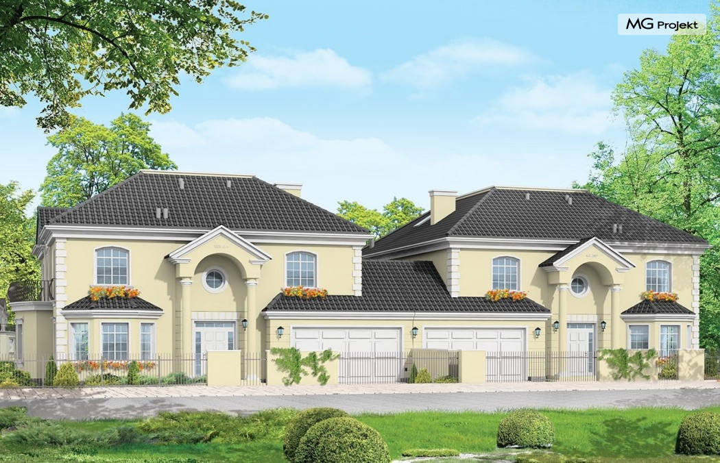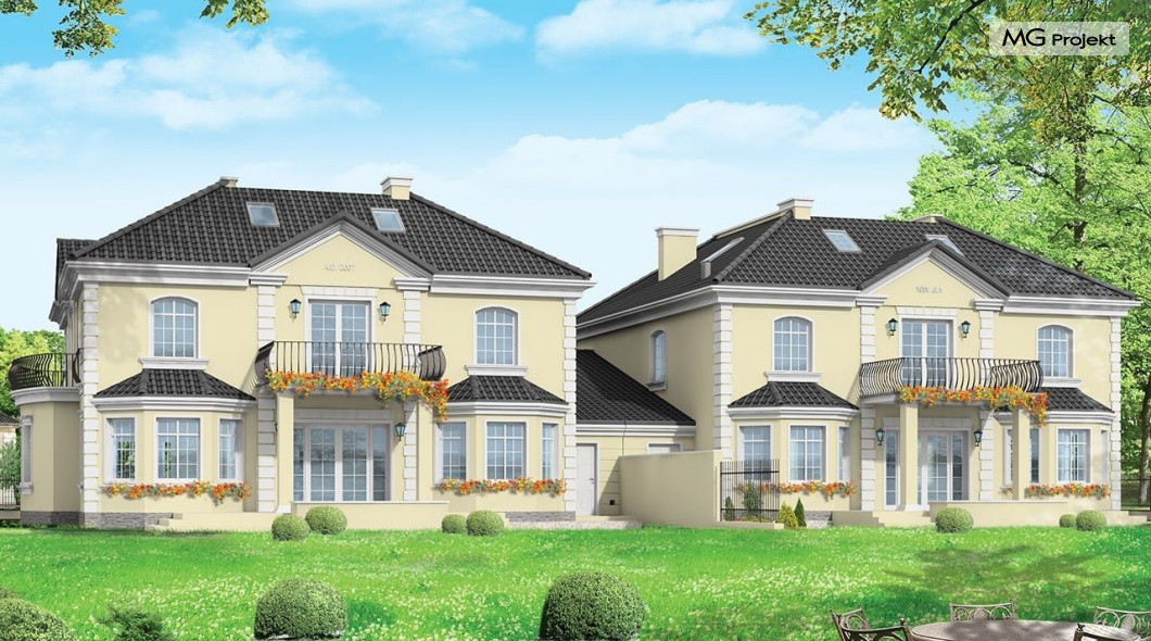 Projekt domu Komorów to rzadko spotykane połączenie klasycznej willowej architektury z formą budynku bliźniaczego. Jednak w dobie wysokich cen atrakcyjnych gruntów, może okazać się ciekawe. Ponadto w czasie gdy wielu Inwestorów decyduje się na budowę dwóch domów - aby po sprzedaży jednego zrekompensować część kosztów budowy. Budowa budynków bliźniaczych staje się coraz modniejsza. Dom Komorów wzorowany jest na miejskich willach okresu międzywojennego, częściowo też na amerykańskich rezydencjach dla wyższej klasy średniej. Piętrowa bryła każdej z połówek zbudowana jest na planie zbliżonym do kwadratu. Projekty domów połączone zostały garażami. Wykusze, balkony, fronton wejściowy na kolumnach i taras ogrodowy - wszystkie te elementy ozdabiają bryłę domu i tworzą harmonijną całość. Wnętrze projektu domu Komorów rozwiązano wokół centralnego holu z pięknymi zabiegowymi schodami z otwarciem przestrzennym stropu. Na parterze mieści się obszerny salon, jadalnia i kuchnia, oraz dodatkowo gabinet - biblioteka, mogący być również sypialnią gościnną. W części gospodarczej dostępnej z szatni przy przedsionku znajduje się wygodny dwustanowiskowy garaż, oraz dwa pomieszczenia gospodarcze. Na piętrze zaprojektowano apartament rodziców z garderobą i własnym tarasem z widokiem na ogród, oraz trzy sypialnie z łazienką z holu. Hol został powiększony o aneks wieczorny - również z tarasem. W razie potrzeby z holu można wygrodzić dodatkowy pokój. Projekt domu Komorów jest dostępny równieżź w odbiciu lustrzanym. Zapraszam!