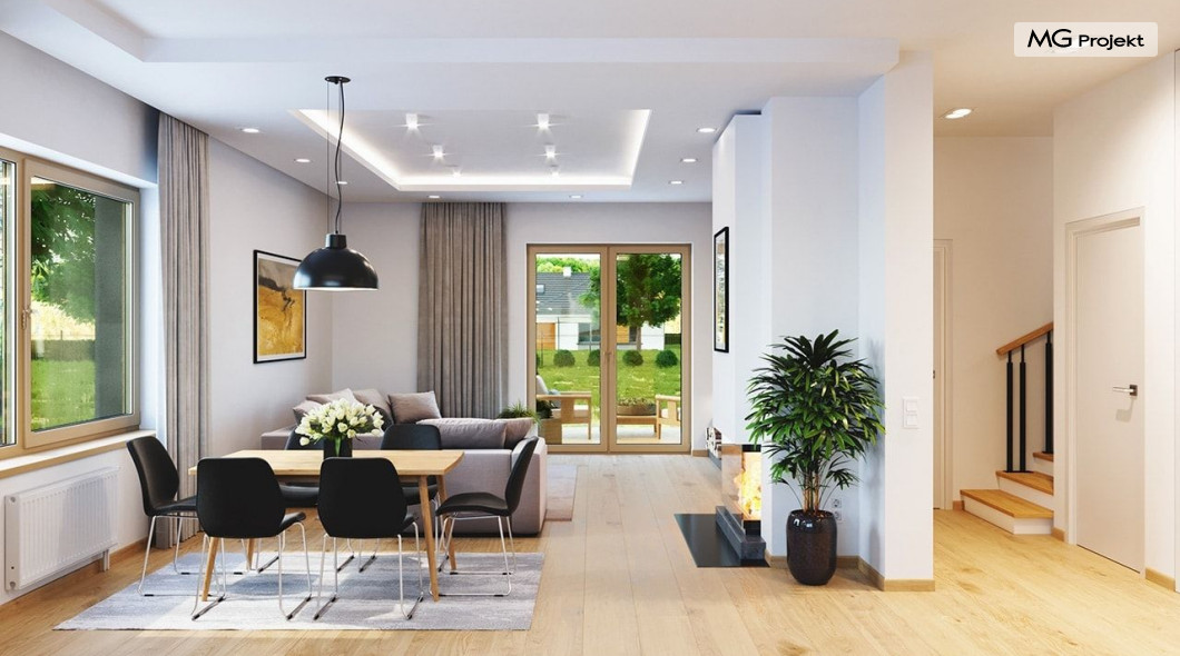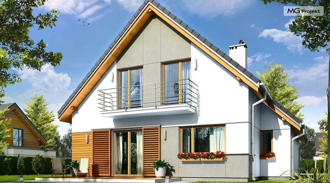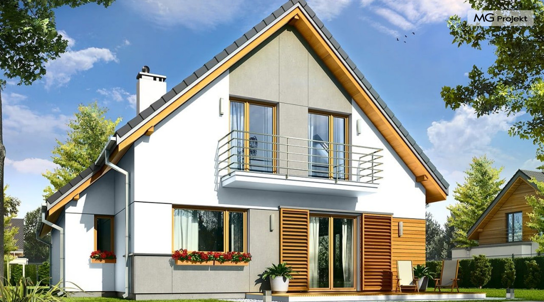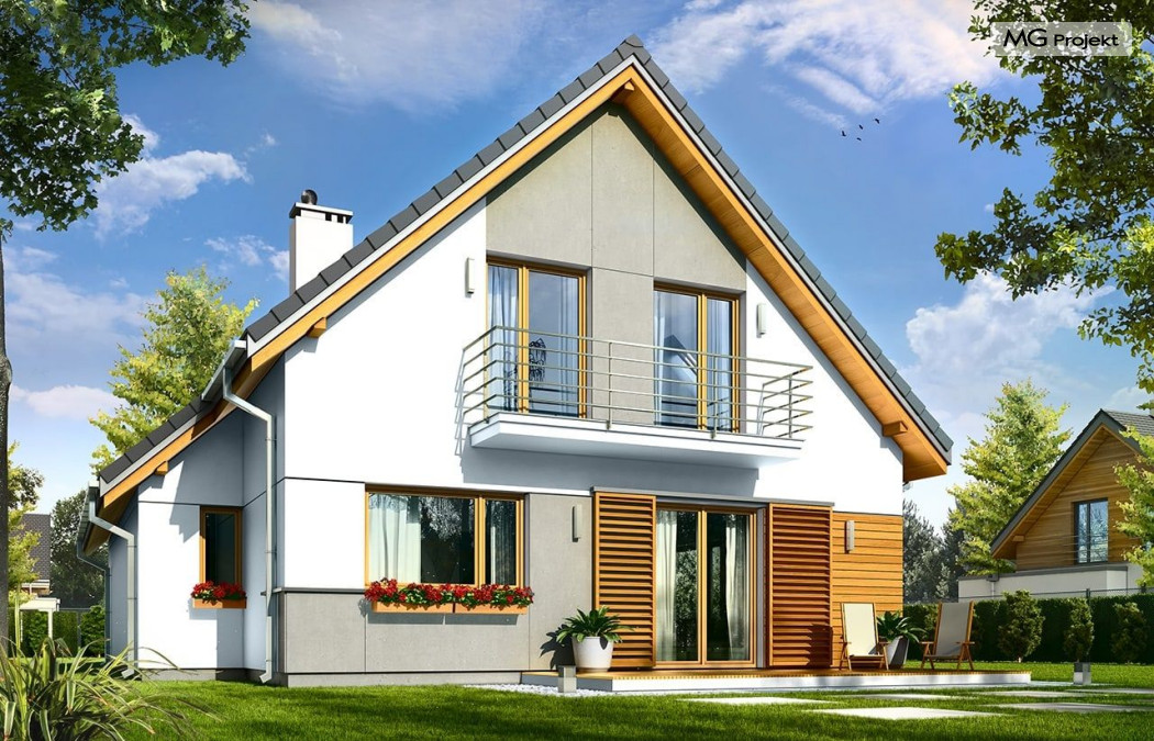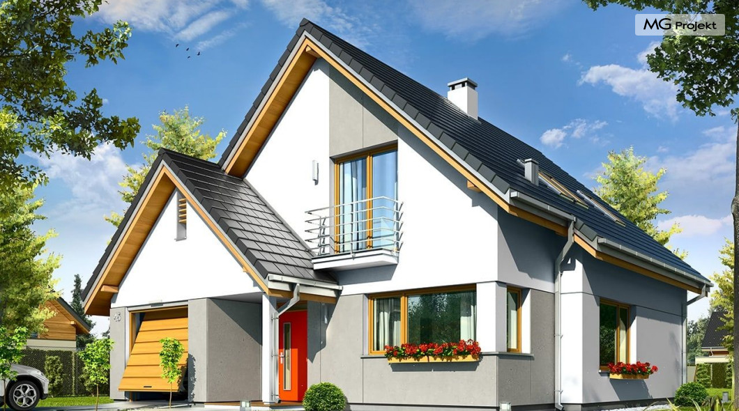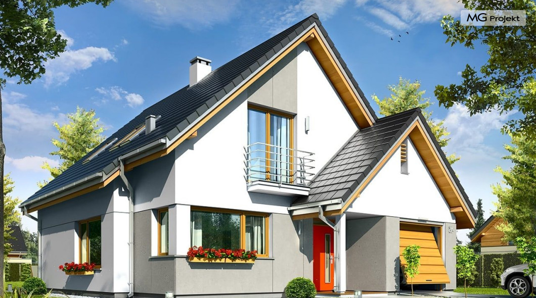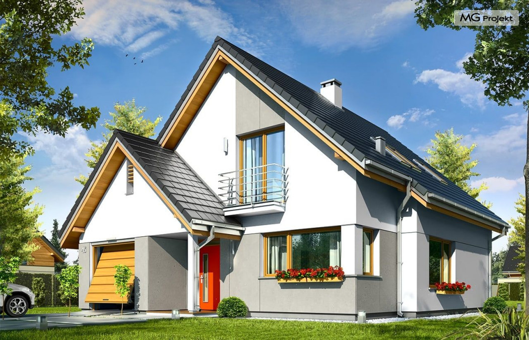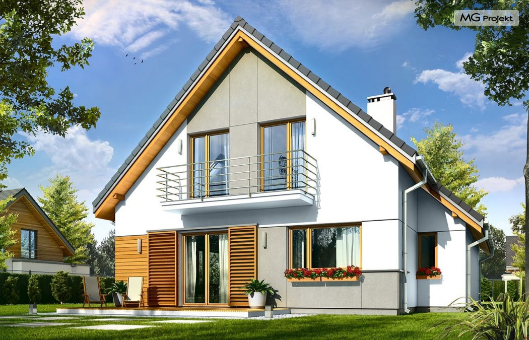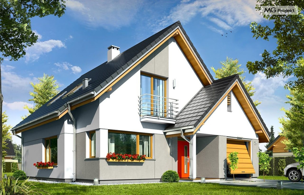 Projekt domu Konwalia to dom jednorodzinny dla cztero-pięcioosobowej rodziny, parterowy z poddaszem użytkowym, przykryty dwuspadowym dachem, zbudowany na prostokątnym rzucie z wbudowanym garażem w bryle budynku. Forma architektoniczna, zastosowane materiały, detale, podkreślają nowoczesny styl domu. Projekt domu Konwalia mimo niedużej powierzchni mieści w sobie wszystko to, co powinno się znaleźć w domu jednorodzinnym. Na parterze mamy więc otwartą przestrzeń dzienną, z pokojem dziennym z kominkiem i ścianą TV, kącikiem jadalnym, oraz otwartą kuchnią i holem. Mamy też dodatkowy pokój - sypialnię lub gabinet, oraz garaż i kotłownię - dostępne z przedsionka wejściowego. Ładne przeszklenia i otwarcia na taras i ogród doświetlają wnętrze i otwierają dom na otaczającą przyrodę. Na poddaszu mamy trzy sypialnie, sporą łazienkę i garderobą dostępną z sypialni rodziców. Wnętrza są funkcjonalne i ustawne. Projekt domu Konwalia został zaprojektowany w technologii energooszczędnej. Doskonałe ocieplenia przegród zewnętrznych pozwalają w łatwy sposób dostosować dom do standardu NF40. Zwarta bryła i prosta konstrukcja budynku pozwoli na szybką i niedrogą budowę, oraz późniejszą oszczędną eksploatację budynku. Zapraszamy !