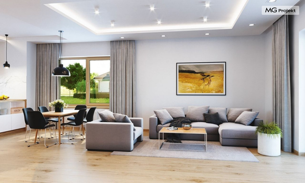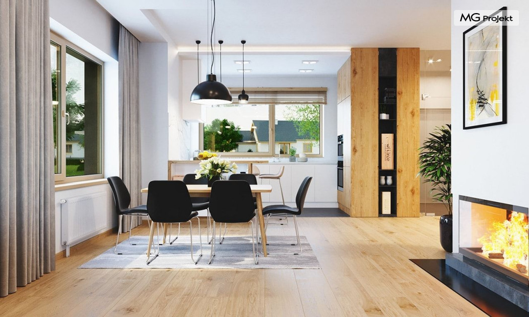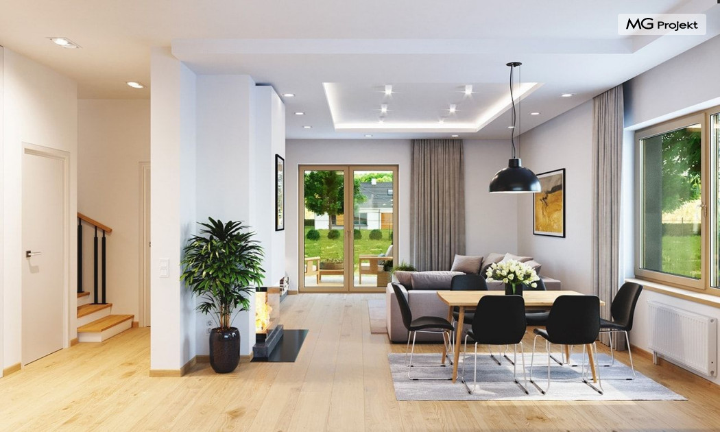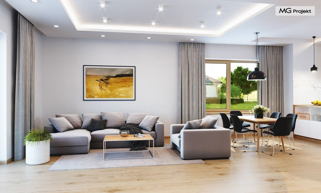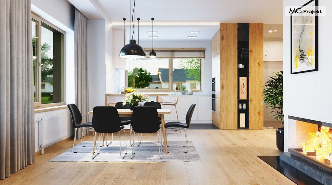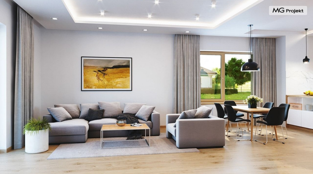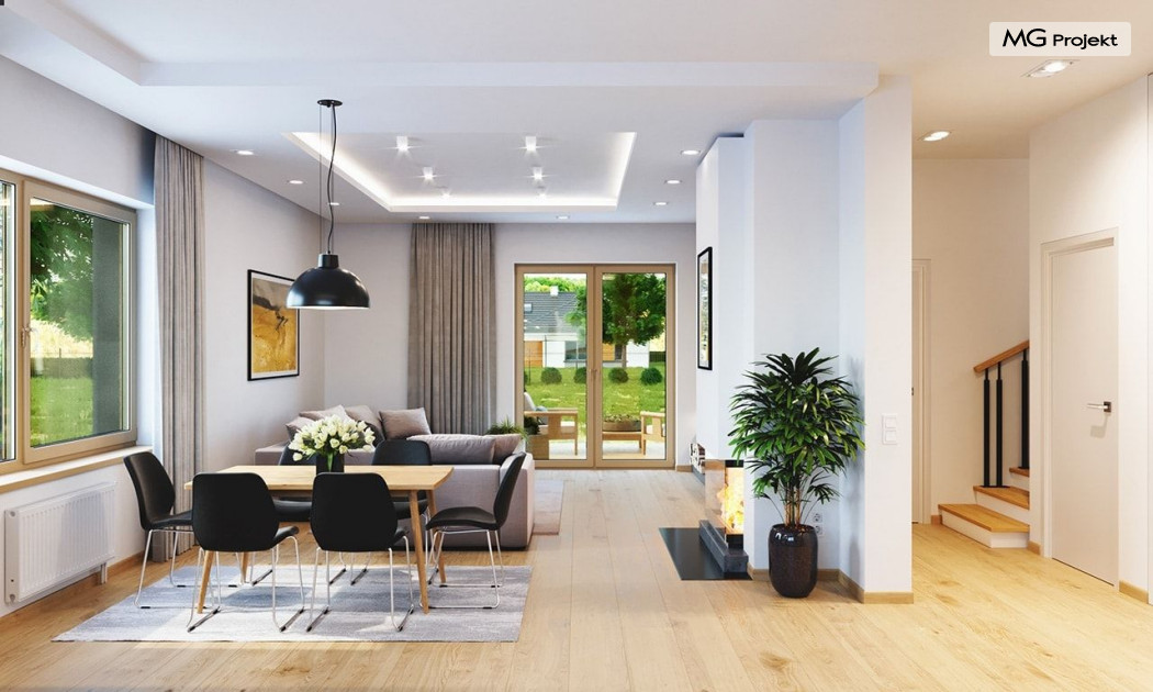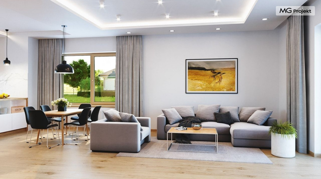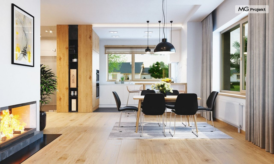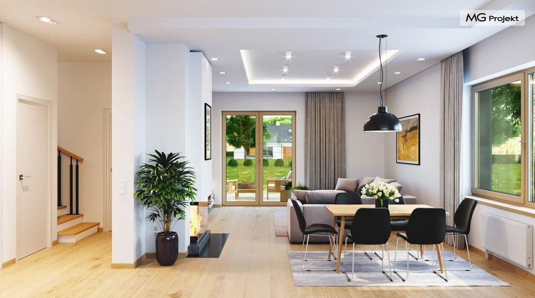 Projekt domu Konwalia to dom jednorodzinny dla cztero-pięcioosobowej rodziny, parterowy z poddaszem użytkowym, przykryty dwuspadowym dachem, zbudowany na prostokątnym rzucie z wbudowanym garażem w bryle budynku. Forma architektoniczna, zastosowane materiały, detale, podkreślają nowoczesny styl domu. Projekt domu Konwalia mimo niedużej powierzchni mieści w sobie wszystko to, co powinno się znaleźć w domu jednorodzinnym. Na parterze mamy więc otwartą przestrzeń dzienną, z pokojem dziennym z kominkiem i ścianą TV, kącikiem jadalnym, oraz otwartą kuchnią i holem. Mamy też dodatkowy pokój - sypialnię lub gabinet, oraz garaż i kotłownię - dostępne z przedsionka wejściowego. Ładne przeszklenia i otwarcia na taras i ogród doświetlają wnętrze i otwierają dom na otaczającą przyrodę. Na poddaszu mamy trzy sypialnie, sporą łazienkę i garderobą dostępną z sypialni rodziców. Wnętrza są funkcjonalne i ustawne. Projekt domu Konwalia został zaprojektowany w technologii energooszczędnej. Doskonałe ocieplenia przegród zewnętrznych pozwalają w łatwy sposób dostosować dom do standardu NF40. Zwarta bryła i prosta konstrukcja budynku pozwoli na szybką i niedrogą budowę, oraz późniejszą oszczędną eksploatację budynku. Zapraszamy !