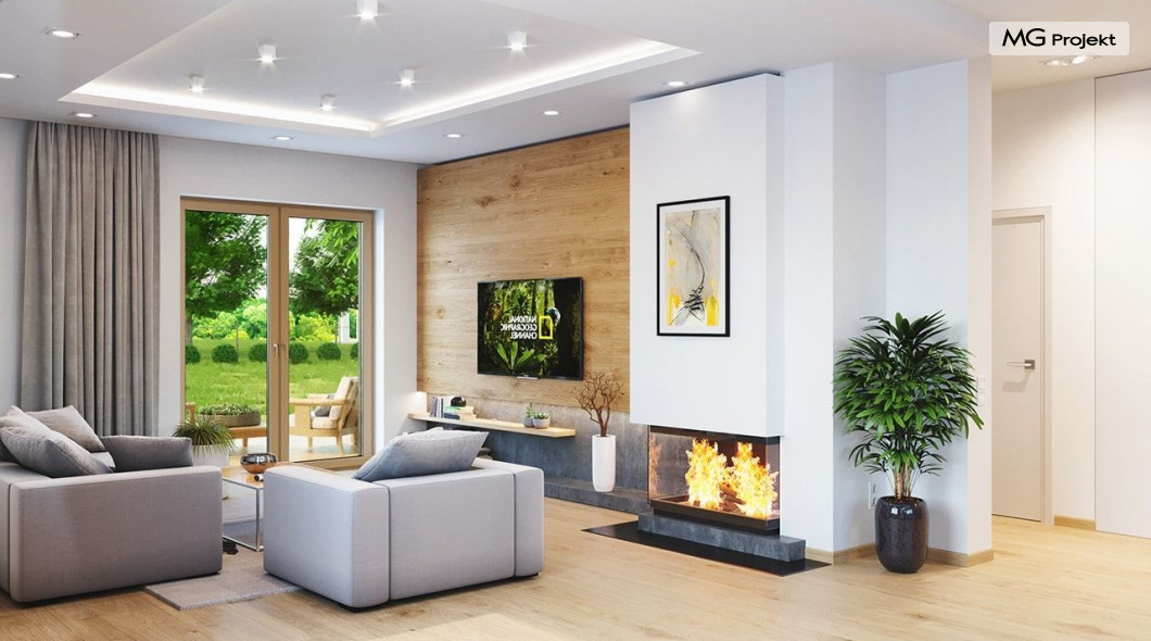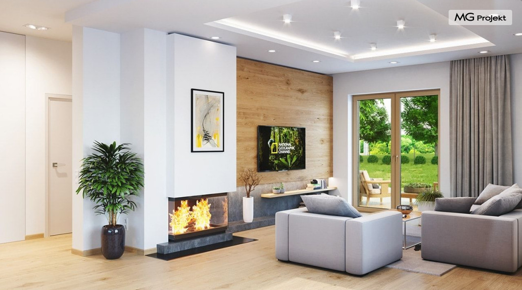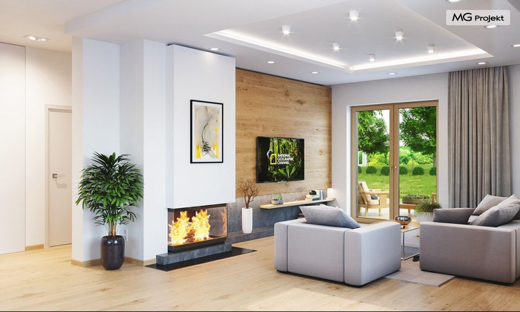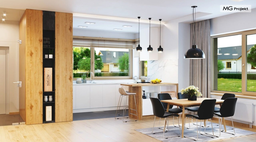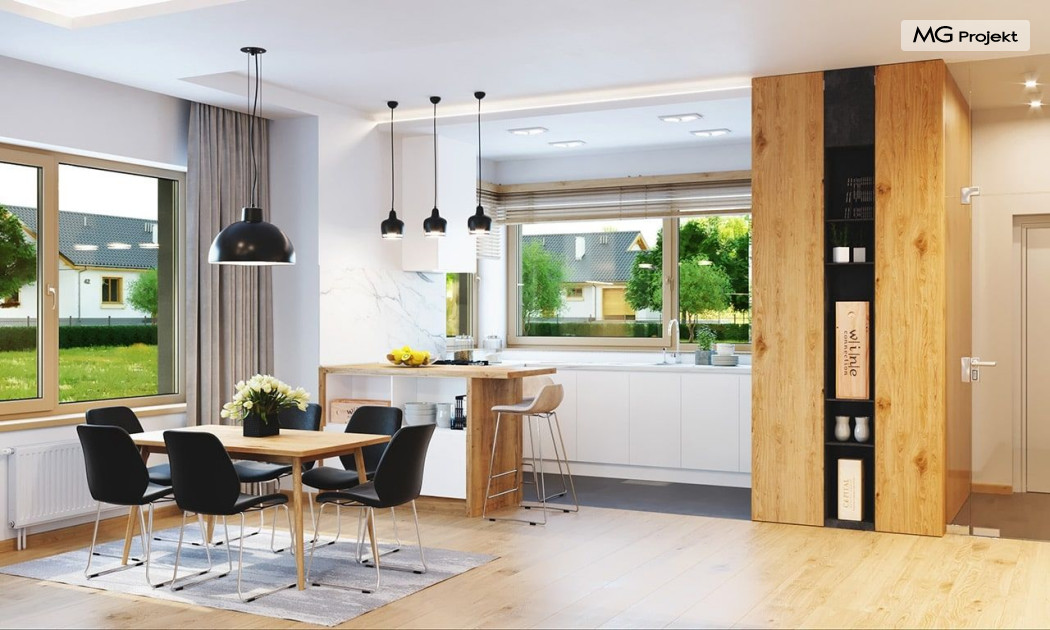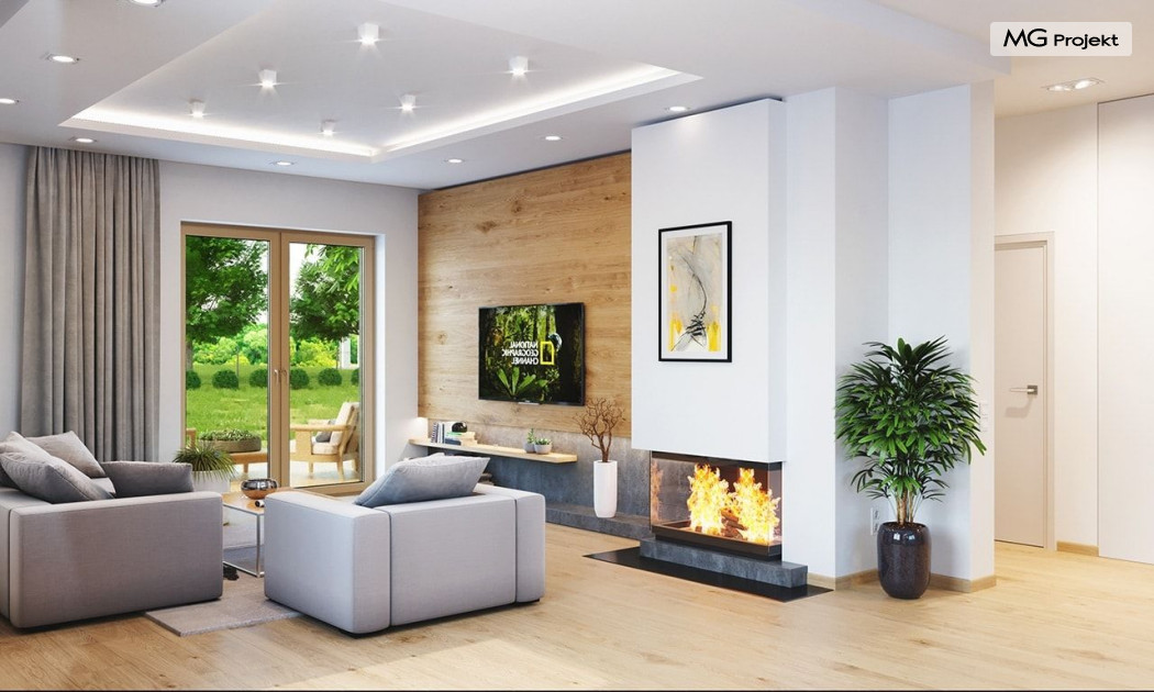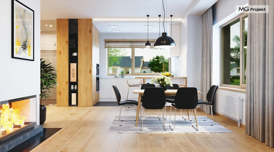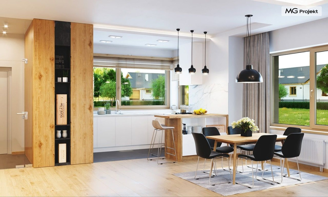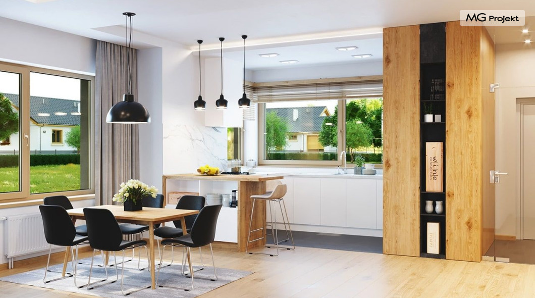 Projekt domu Konwalia to dom jednorodzinny dla cztero-pięcioosobowej rodziny, parterowy z poddaszem użytkowym, przykryty dwuspadowym dachem, zbudowany na prostokątnym rzucie z wbudowanym garażem w bryle budynku. Forma architektoniczna, zastosowane materiały, detale, podkreślają nowoczesny styl domu. Projekt domu Konwalia mimo niedużej powierzchni mieści w sobie wszystko to, co powinno się znaleźć w domu jednorodzinnym. Na parterze mamy więc otwartą przestrzeń dzienną, z pokojem dziennym z kominkiem i ścianą TV, kącikiem jadalnym, oraz otwartą kuchnią i holem. Mamy też dodatkowy pokój - sypialnię lub gabinet, oraz garaż i kotłownię - dostępne z przedsionka wejściowego. Ładne przeszklenia i otwarcia na taras i ogród doświetlają wnętrze i otwierają dom na otaczającą przyrodę. Na poddaszu mamy trzy sypialnie, sporą łazienkę i garderobą dostępną z sypialni rodziców. Wnętrza są funkcjonalne i ustawne. Projekt domu Konwalia został zaprojektowany w technologii energooszczędnej. Doskonałe ocieplenia przegród zewnętrznych pozwalają w łatwy sposób dostosować dom do standardu NF40. Zwarta bryła i prosta konstrukcja budynku pozwoli na szybką i niedrogą budowę, oraz późniejszą oszczędną eksploatację budynku. Zapraszamy !