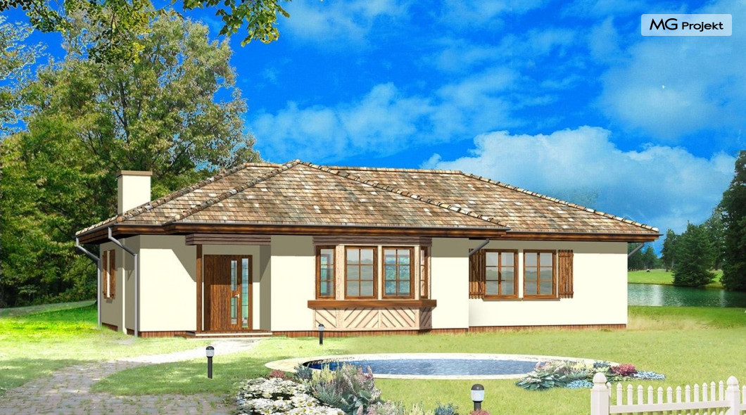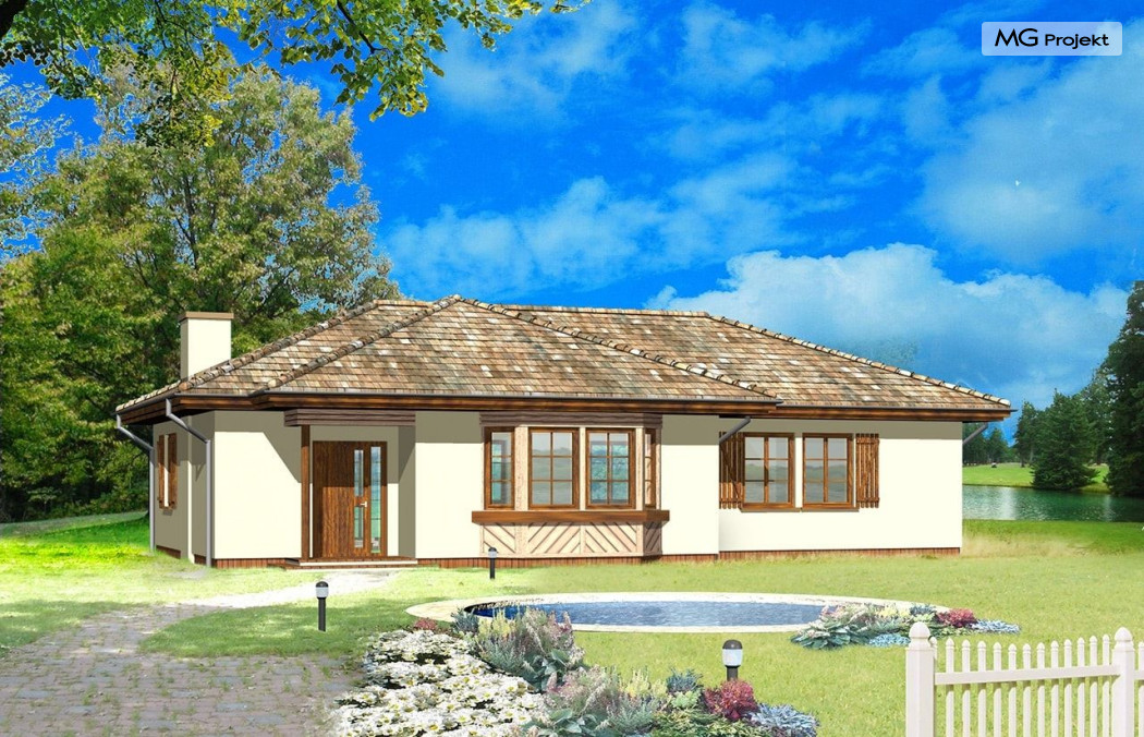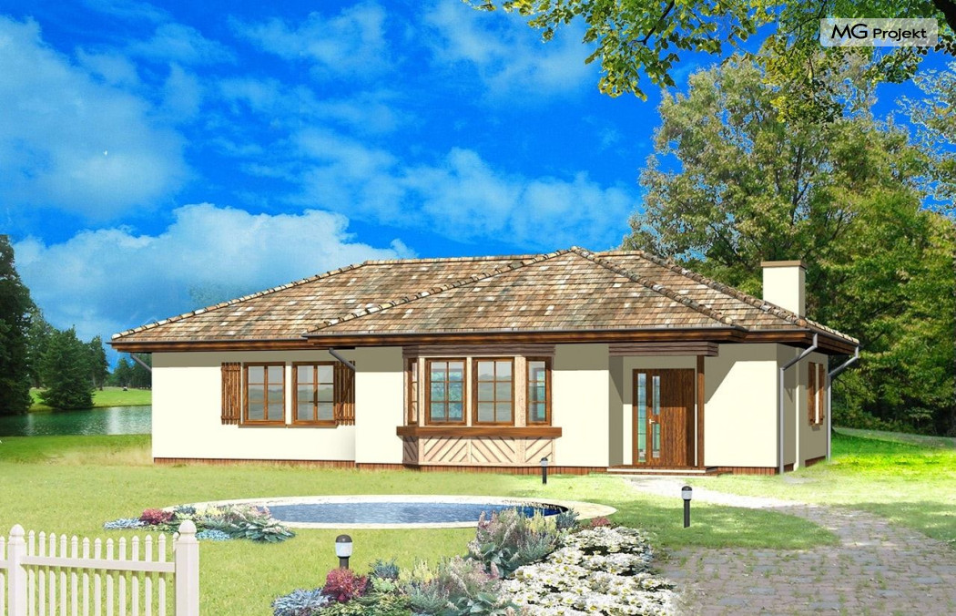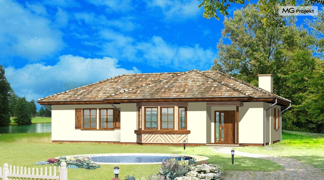 Projekt domu Kujawiak to wygodny, przestronny bungalow dla 4-5 osobowej rodziny. Projekt domu Kujawiak posiada rozbudowaną elewację frontową, podkreślającą reprezentacyjny charakter architektury budynku. Projekt dzięki nietypowemu ukształtowaniu wnętrza nadaje się na działkę z wjazdem i ogrodem od frontu, jak też na działkę z ogródkiem z tyłu budynku. Pracownia posiada również projekt domu Kujawiaka w wersji odbicia lustrzanego.