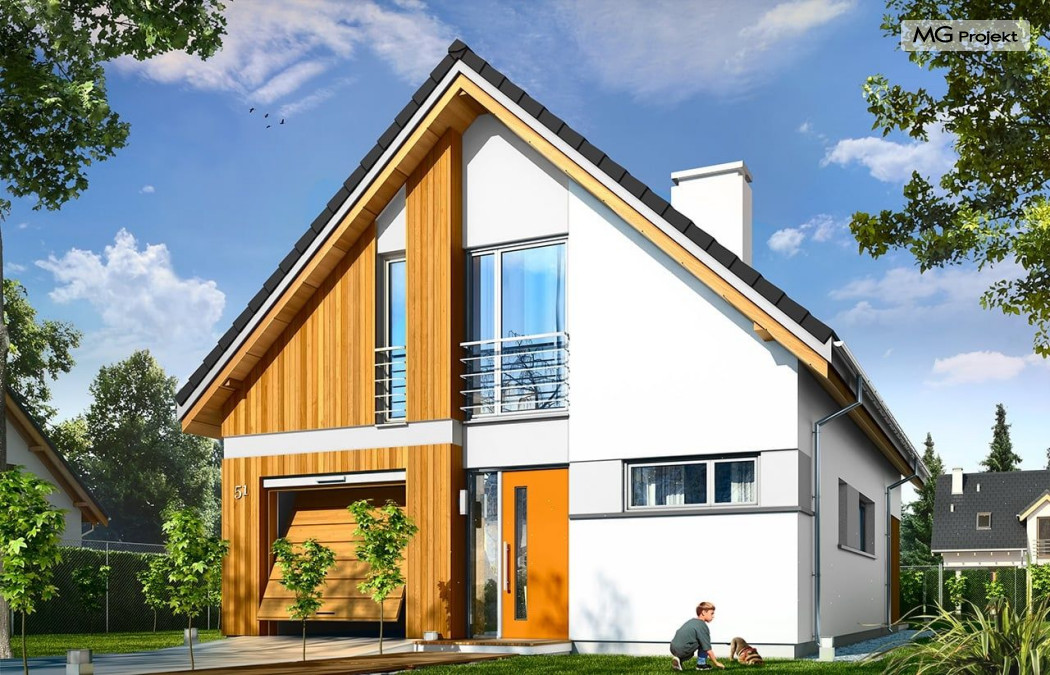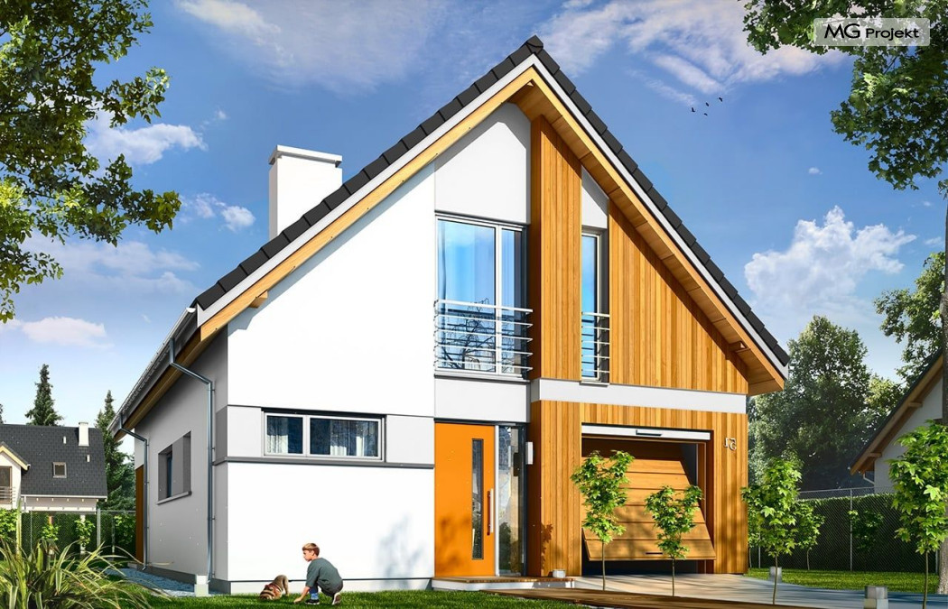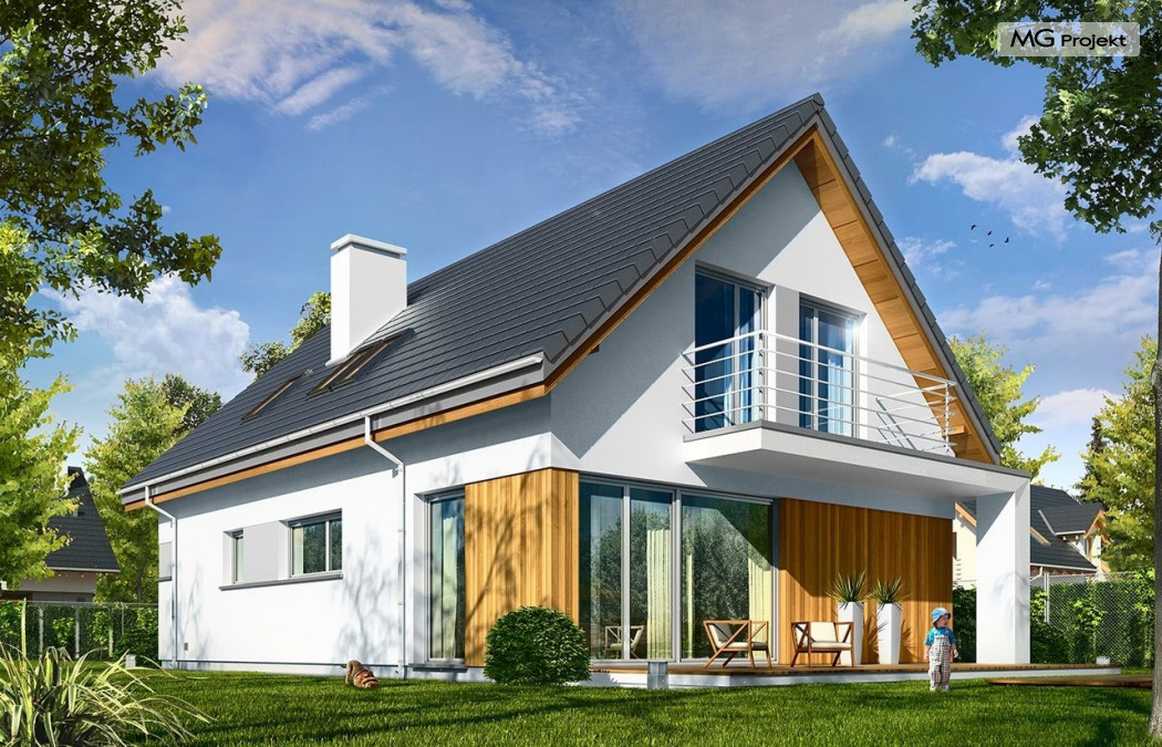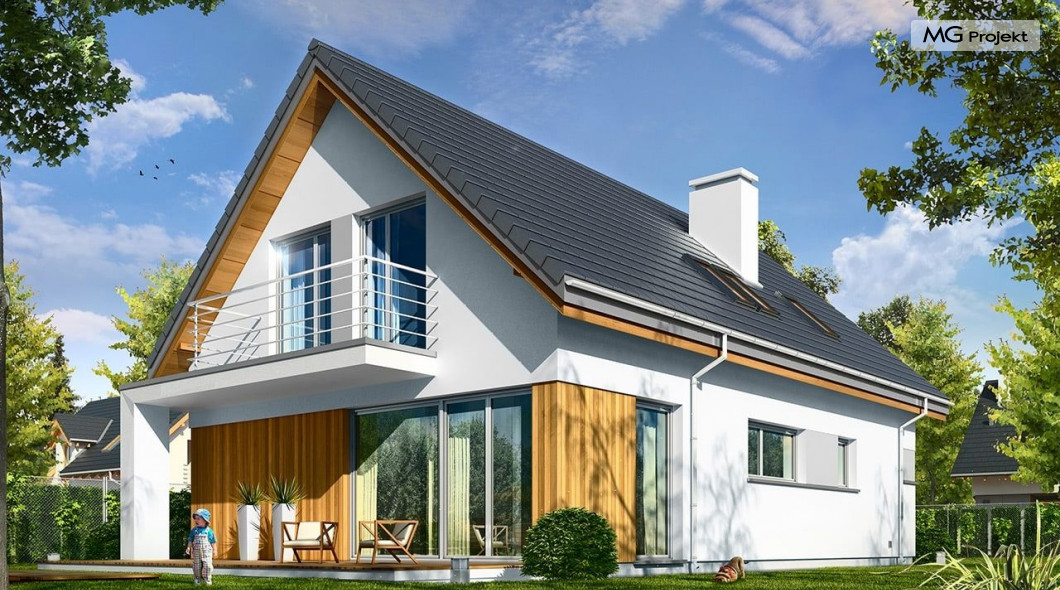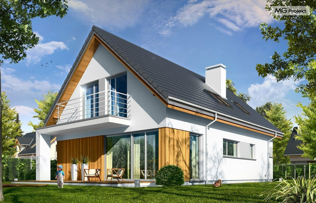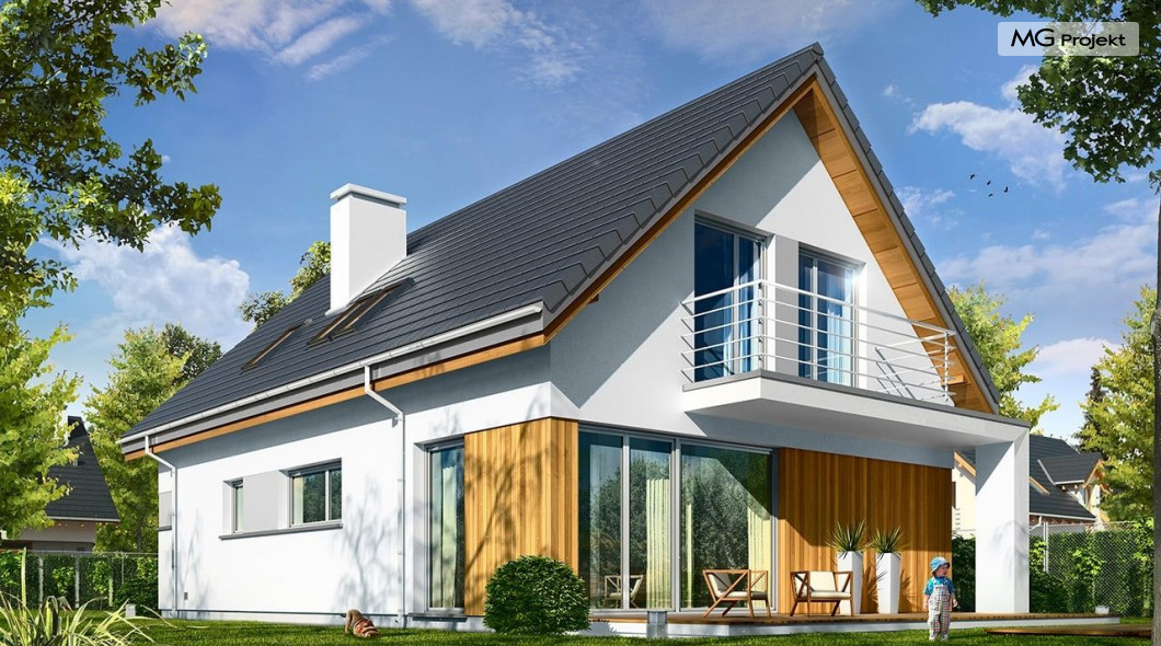 Projekt Lena to dom parterowy, z użytkowym poddaszem, zaprojektowany na prostokątnym rzucie, przykryty dwuspadowym symetrycznym dachem. Kształt bryły, forma budynku, zastosowane materiały, oraz detale projektu Lena podkreślają nowoczesność, energooszczędność i funkcjonalność budynku. Projekt domu Lena ma prostą konstrukcję, dom jest łatwy w budowie, co pozytywnie wpłynie na szybkość budowy i koszt realizacji. Koszty budowy domu Lena to 144885 zł za stan surowy zamknięty.