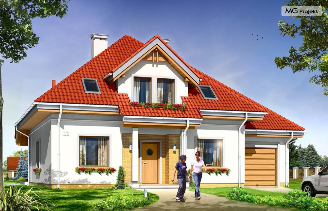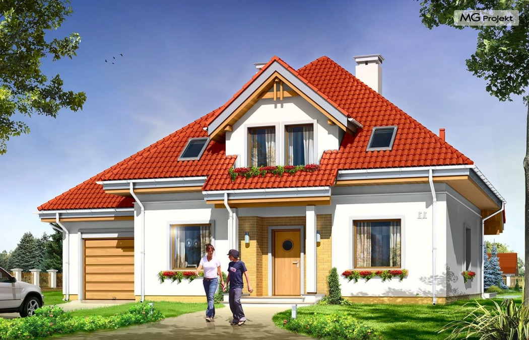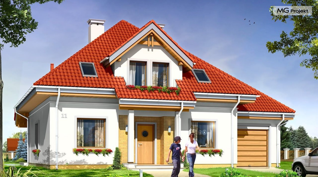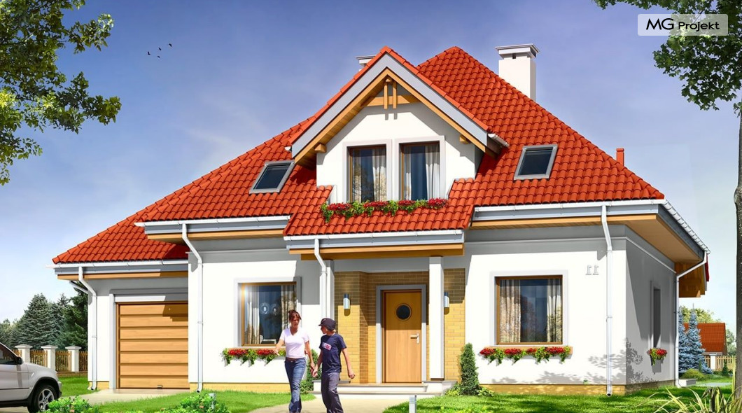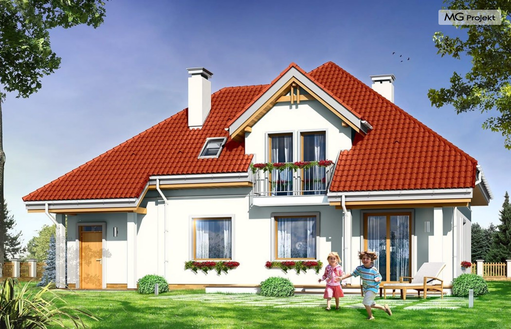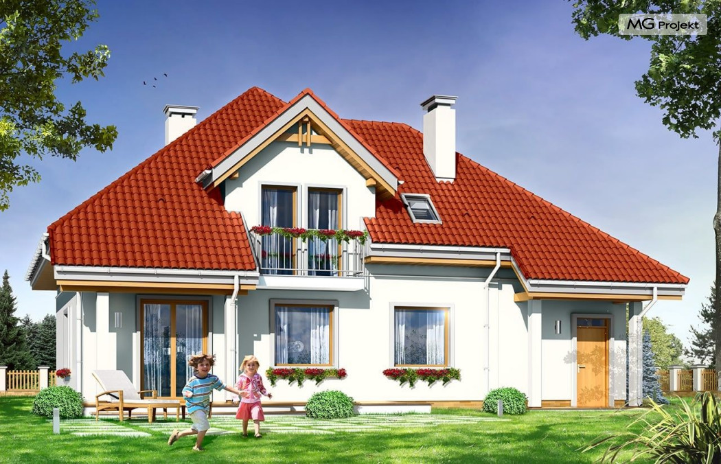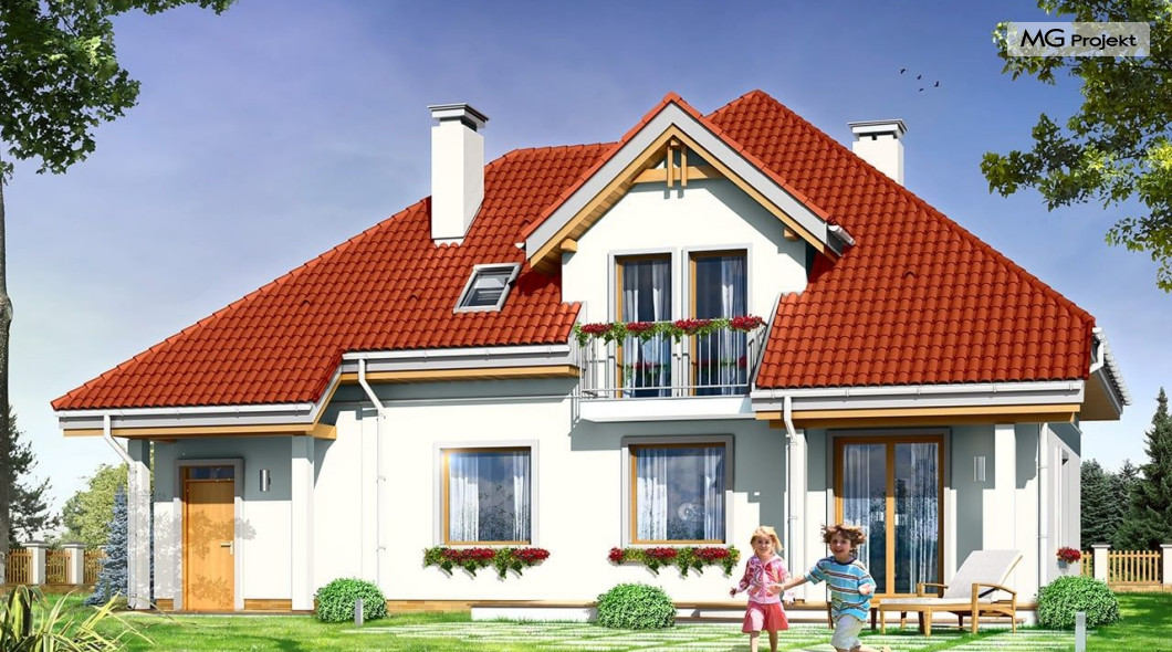 Projekt domu Luka to śliczny domek jednorodzinny dla cztero-sześcioosobowej rodziny, parterowy z poddaszem użytkowym, przekryty kopertowym dachem, z dobudowanym garażem. Bryła została oparta na planie kwadratu, do którego dołączono część garażową. Kopertowy dach urozmaicają lukarny – frontowa z zadaszeniem nad wejściem, wspartym na dwóch kolumnach, oraz ogrodowa z balkonikiem. Od strony ogrodu zaprojektowano dwa dodatkowe zadaszenia: nad częścią tarasu, przekrywające wyjście z salonu do ogrodu, oraz techniczne – przy wyjściu z pomieszczenia gospodarczego do ogrodu. Architektura domu Luka to połączenie tradycji z nowoczesnością. Dom doskonale wpisze się w każde sąsiedztwo. Wnętrze Luki podzielono na część dzienną i gospodarczą na parterze i pokoje sypialne na poddaszu. Salon połączony z holem i częściowo otwartą kuchnią ze spiżarką tworzą jednoprzestrzenne wnętrze dzienne . Na parterze zaprojektowano też dodatkowe dwa pokoje – wyjątek w tej wielkości domach. Pokoje mogę pełnić funkcję gabinetu czy sypialni gościnnej, ale mogą też być pokojem babci. Na dole przewidziano też garaż i sporą kotłownię . Na poddaszu znajdują się trzy sypialnie – dwie dziecięce o tej samej wielkości, ze wspólną łazienką, oraz wygodna sypialnia rodziców z widokiem na ogród, balkonem, garderobą i własną łazienką . Nad częścią garażową znajduje się strych, który można zaadaptować na dodatkowy pokój. Luka to propozycja dla osób lubiących bezpretensjonalną architekturę, nie silącą się na nowoczesność za wszelką ceną, a jednocześnie nie chcących typowego polskiego dworku. To bardzo praktyczny dom, z dużą ilością pokoi, z dużymi możliwościami aranżacji wnętrz, budynek o prostej konstrukcji, energooszczędny, niedrogi w budowie i późniejszej eksploatacji. Pracownia posiada wersję odbicia lustrzanego projektu.